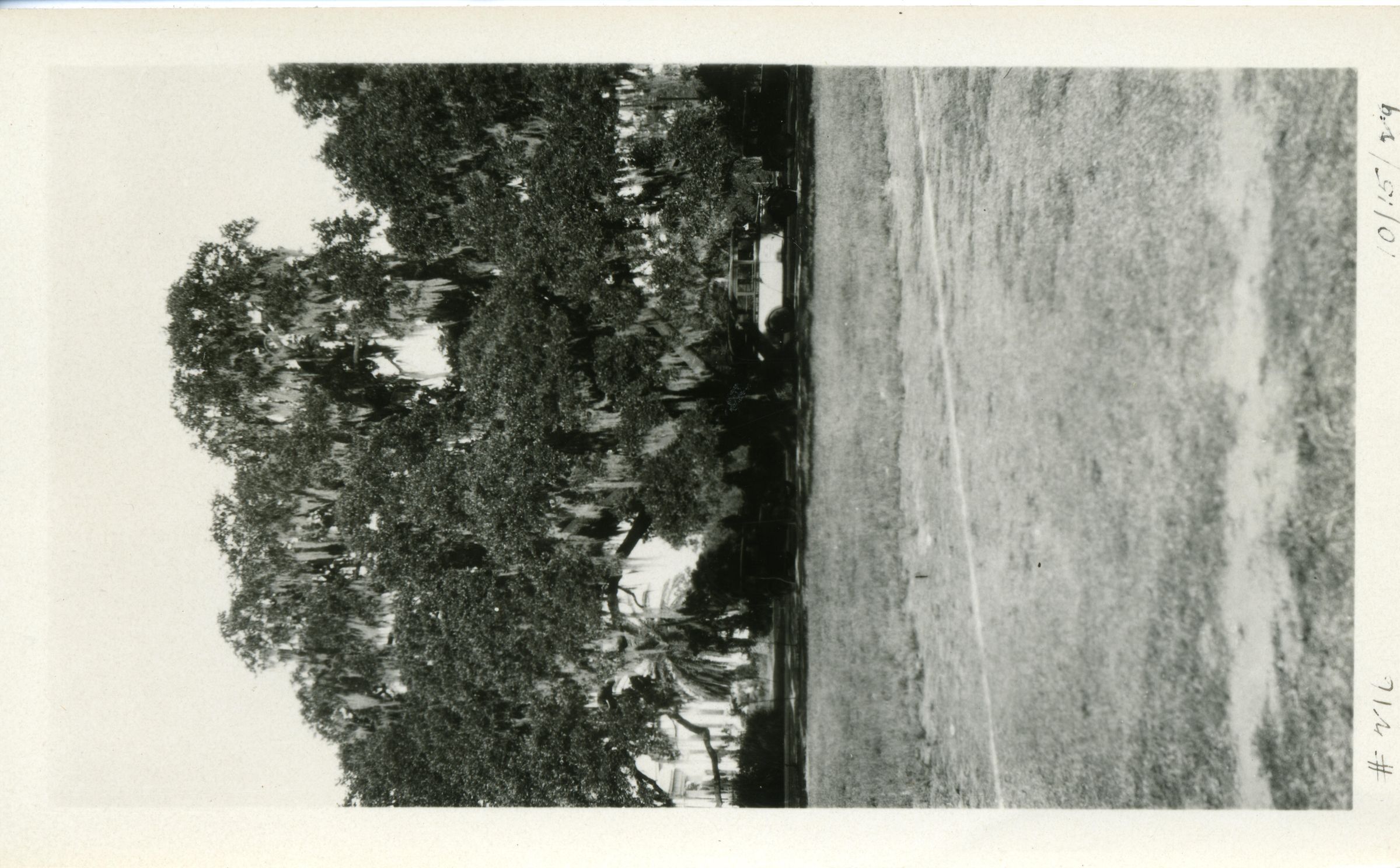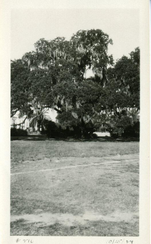 Black and white photo of oak trees in a park in New Orleans. There is grass in the foreground and in the background is a large tree, presumably an oak tree. There is a white border on all sides, and in the bottom border is "#216" and "10/15/29". On the back is "2409".