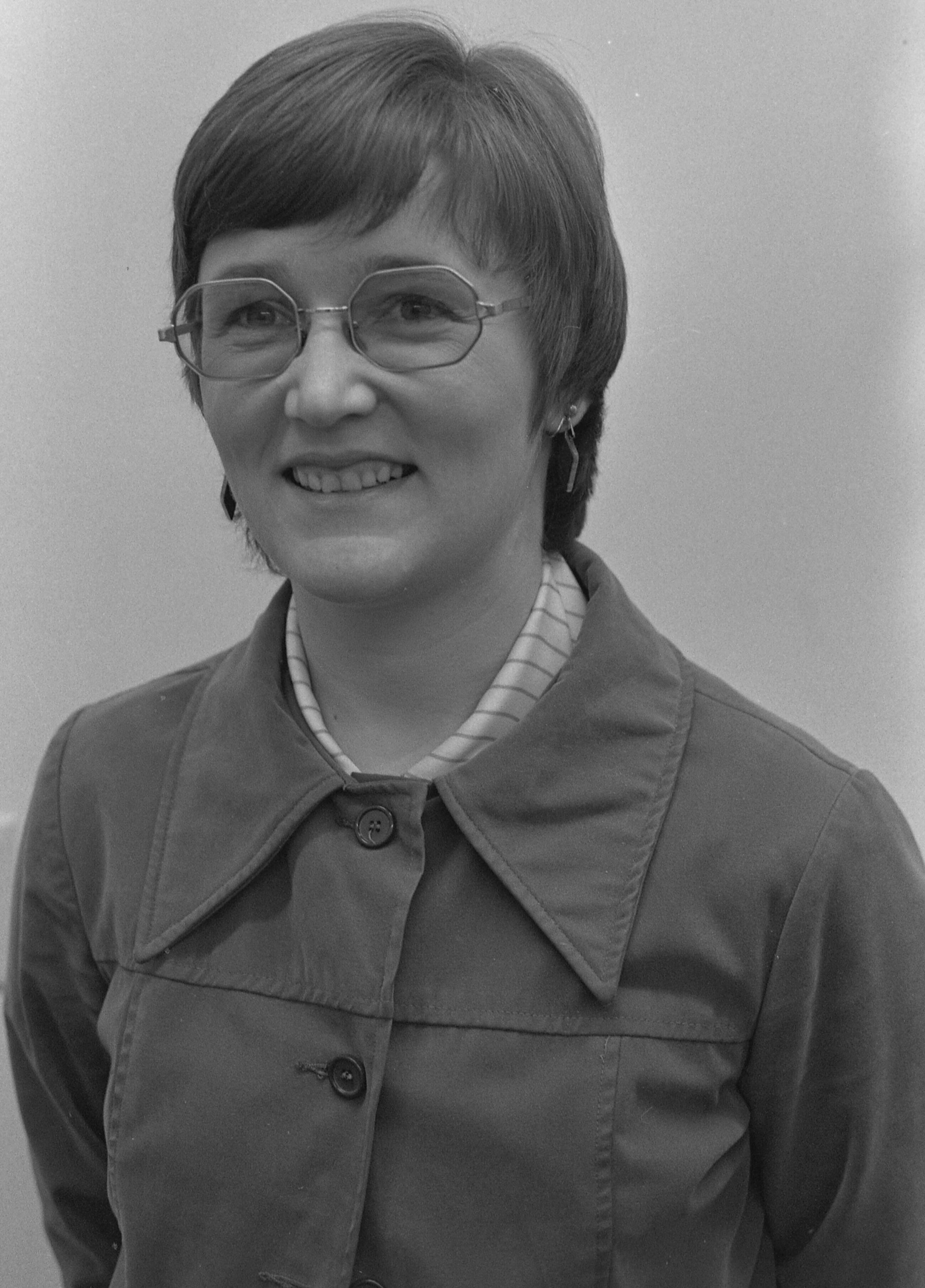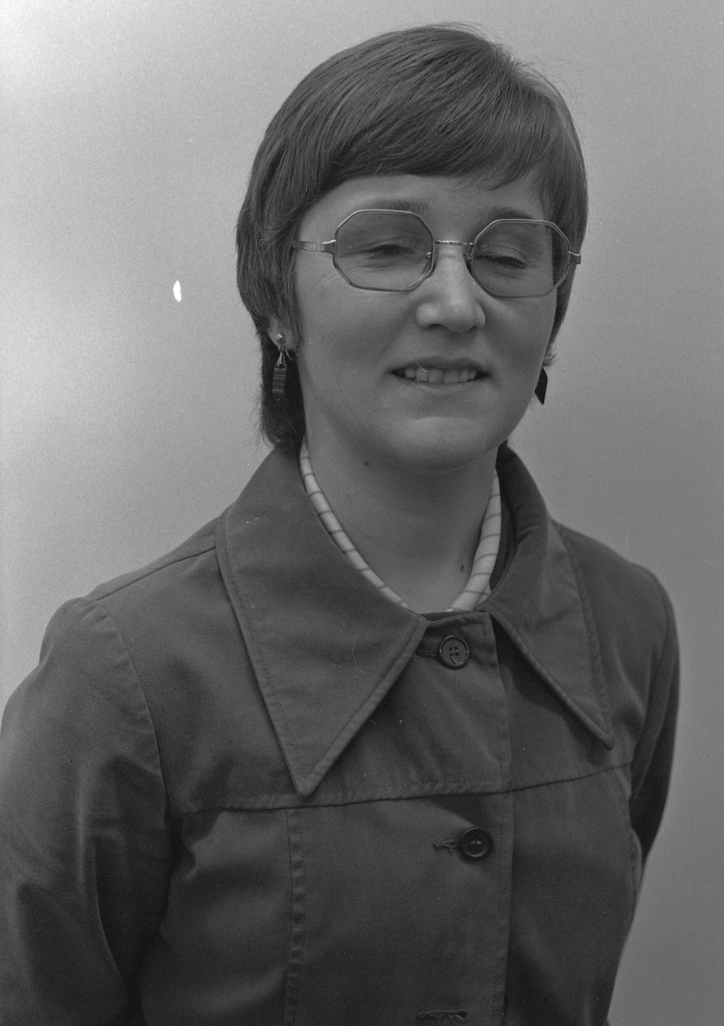 Karen Fraser, 1976. This single black and white negative film strip was created for the Lacey Leader Newspaper. Image 42 shows Karen Fraser. She is wearing glasses, earrings, and a button up jacket. Image 43 is similar to Image 42 but the photographer has moved to the other side of Karen.