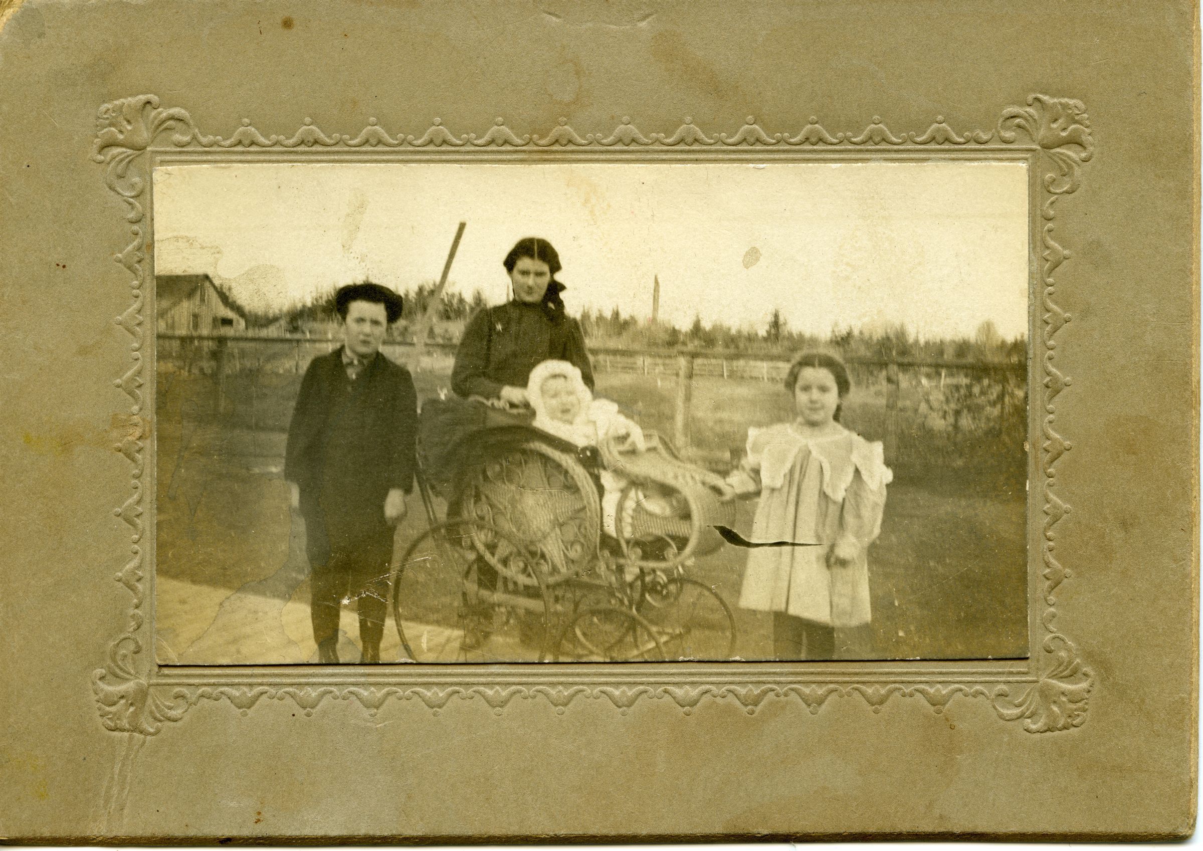 Francis, Elizabeth, William and Margaret Gallagher at Gallagher Farm, Unknown Date. This black and white photograph shows (from left to right) Francis, Elizabeth, William and Margaret Gallagher as children posing with the Gallagher House visible in the background. Francis Gallagher appears to be approximately 8-10 years old and is wearing a brimmed hat and a dark suit with a vest. Elizabeth is wearing a ribbon in her hair and a long-sleeved dress. Her hair is parted down the center. She appears to be approximately 12-14 years old. In front of Elizabeth in a baby stroller is William Gallagher as an infant. William is wearing a light-colored, blanket-like garment with a hood. His mouth is open. The baby stroller is made mostly of wicker and has four spoked wheels. On the side of the baby stroller is a star-design made of wicker. Margaret Gallagher appears to be 4-6 years old and is wearing a light-colored dress with frilled decorative elements on the chest and shoulders. She is resting her right hand on the front of the baby stroller. A portion of a wooden walkway is visible in the bottom-right corner fo the image. The children are standing on this walkway. Behind the children is approximately 10-12 feet of open ground which may be grassy. Beyond this area is a fence. Beyond the fence is a field. A portion of the Gallagher House is visible at the left-hand edge of the photo near the top-left corner.
