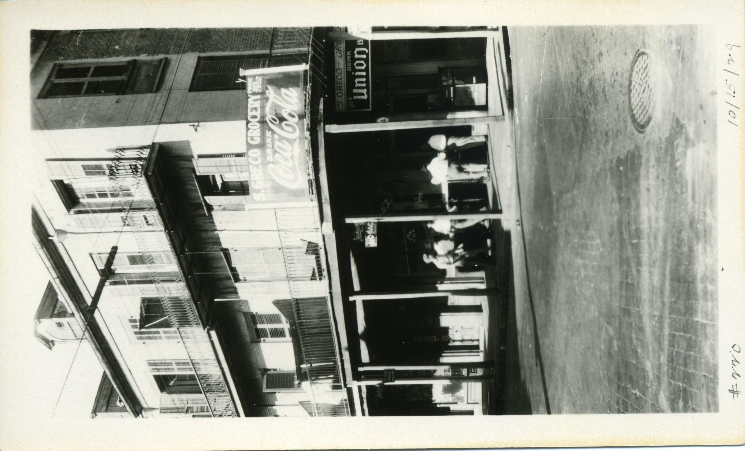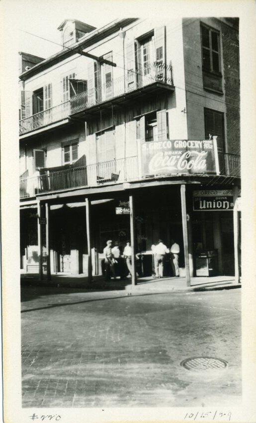 Black and white photo of a street corner in New Orleans. In the foreground is a paved street with a manhole cover visible. Behind that is a three-story building with a covered awning on the ground floor and on the second and third floors are balconies, windows, and doors. On the ground floor are people and objects as well as a sign that says "Union". On the second floor is a sign that is partially unreadable, but includes the words "grocery" and "drink Coca Cola". There is a utility wire stretched overhead. There is a white border on all sides, and in the bottom border is "#220" and "10/15/19". On the back is "2410".