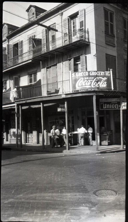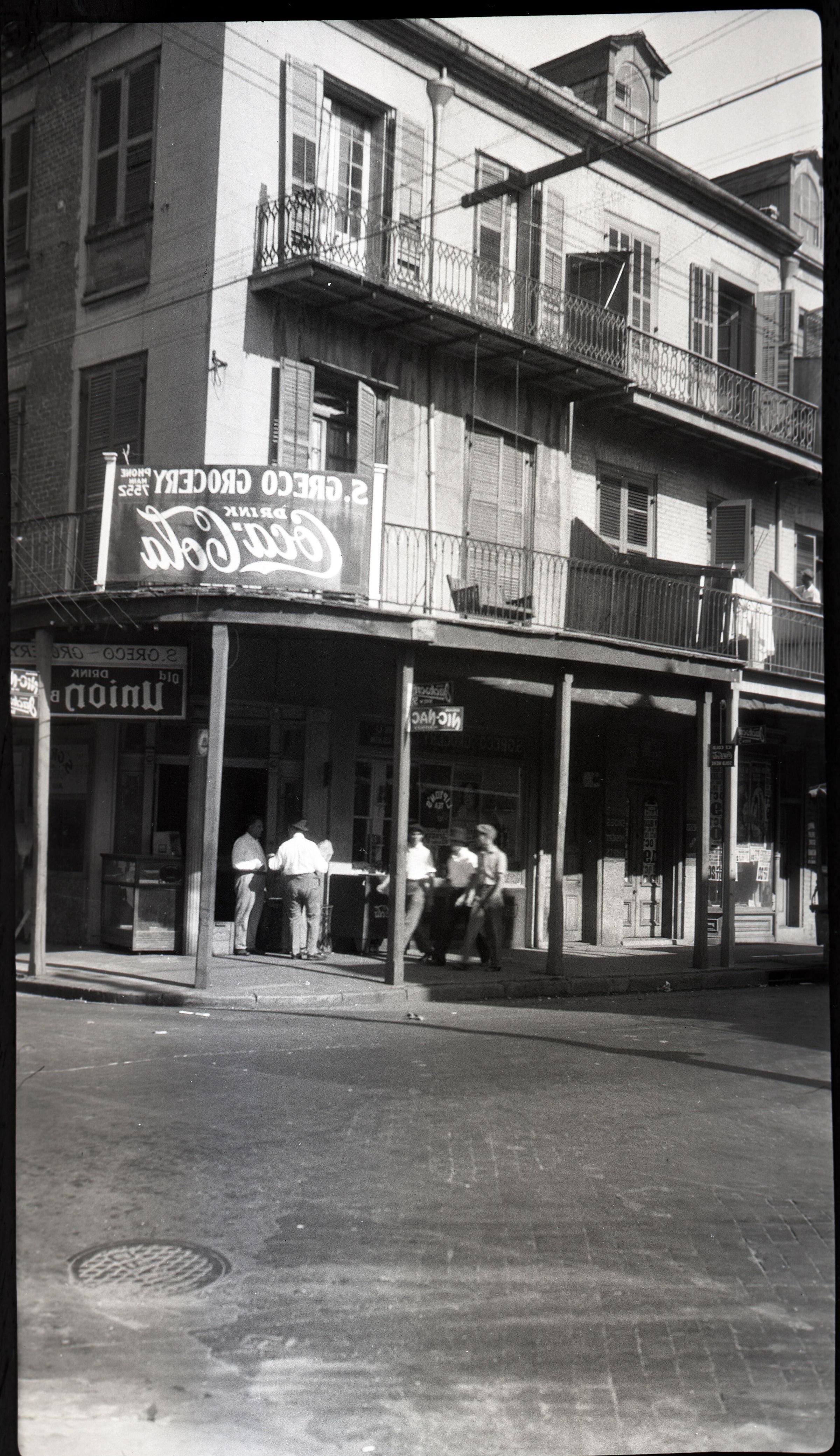Black and white negative of a street corner in New Orleans. In the foreground is a paved street with a manhole cover visible. Behind that is a three-story building with a covered awning on the ground floor and on the second and third floors are balconies, windows, and doors. On the ground floor are people and objects as well as a sign that says "Union". On the second floor is a sign that is partially unreadable, but includes the words "grocery" and "drink Coca Cola". There is a utility wire stretched overhead. There is a white border on all sides, and in the bottom border is "#220" and "10/15/19".