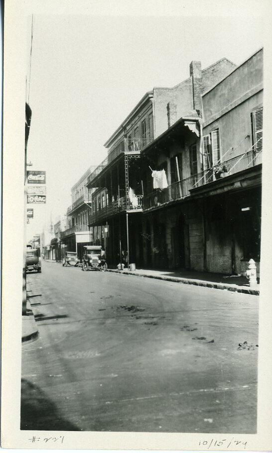 Coca-Cola sign. On the right of the street and of the image is a row of buildings with vehicles parked in front of them. The buildings are two and three story, and most have balconies and awnings along with doors and windows. Some fabric is hanging on some of the balconies, such as washed clothes. There is a white border on all sides, and in the bottom border is "#221" and "10/15/29". On the back is "2410".