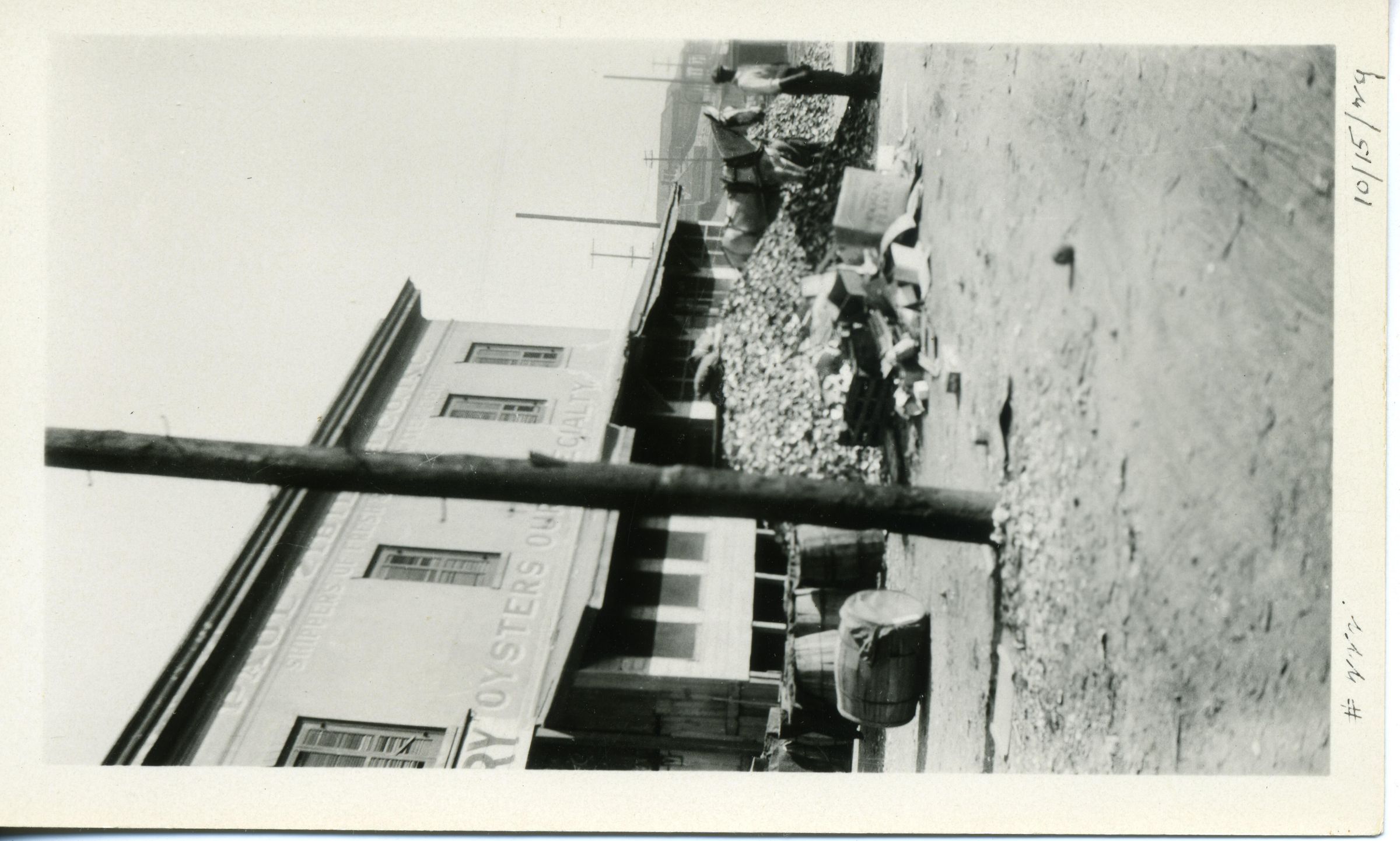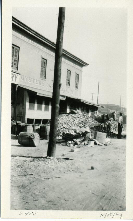 Black and white photo of oyster shells behind a building. In the foreground is a dirt street or alley. In the center of the image is a dark-colored pole rising to the top of the image. Behind that is a two-story building with an awning on the lower floor and windows on the upper floor. Next to the building are barrels, a pile of oyster shells, people, and a horse. There is a white border on all sides, and in the bottom border is "#222" and "10/15/29". On the back is "2410".
