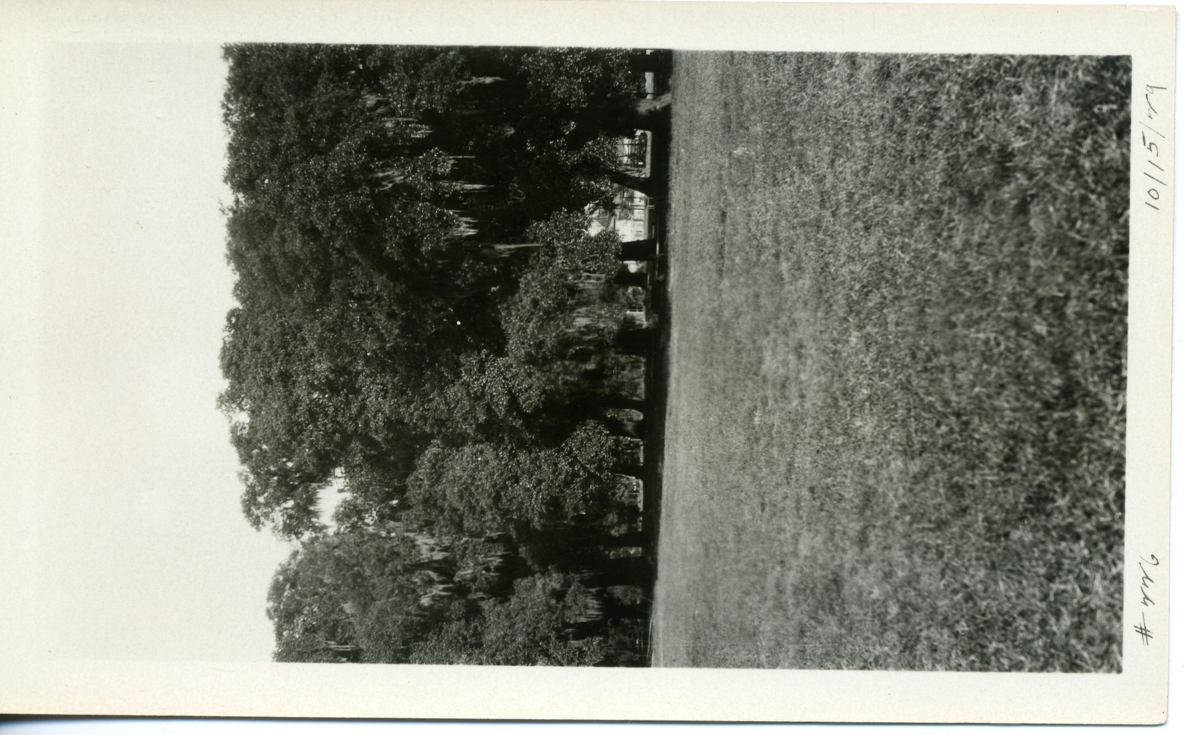 Black and white photo of trees in a park. In the foreground is a lawn and behind that are trees. There is a white border on all sides, and in the bottom border is "#226" and "10/15/29". On the back is "2409".