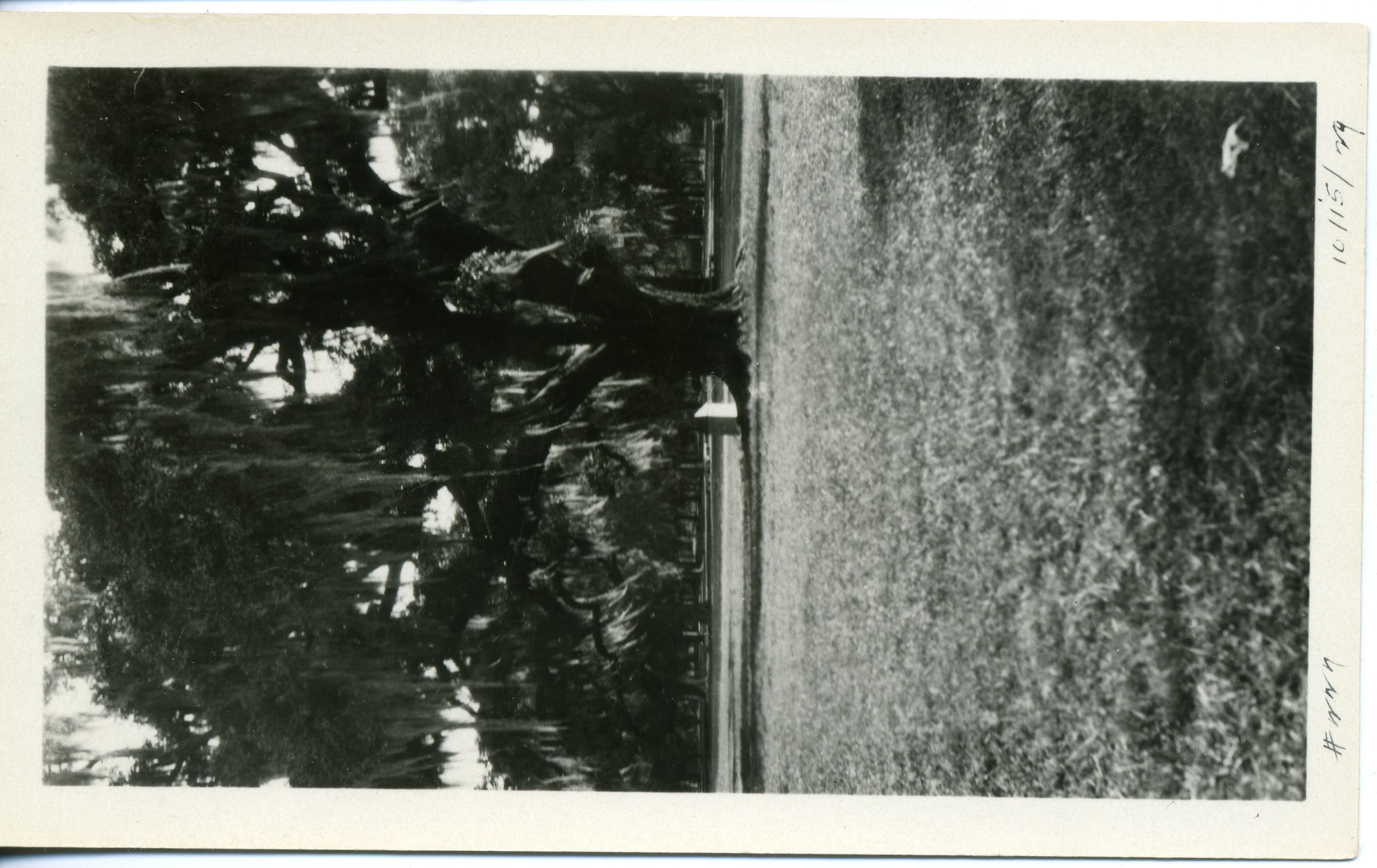 Black and white photo of a tree in a park. There is lawn in the foreground and in the center of the image is a tree. Other trees are visible in the background. There appears to be a sign or marker at the side of the center tree. There is a white border on all sides, and in the bottom border is "#227" and "10/15/29". On the back is "2409".
