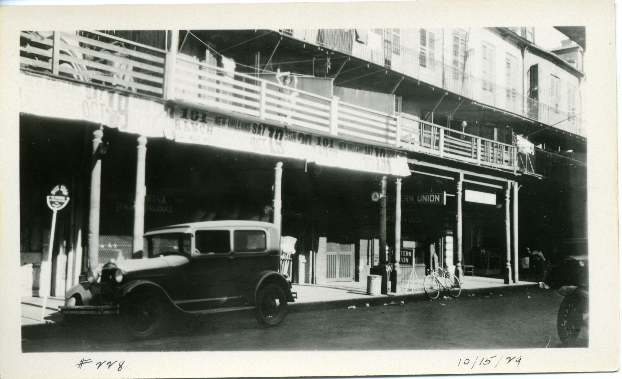 Black and white photo of a building in New Orleans. The porch on the lower floor is covered by a balcony with a five-rail railing. Above the balcony is another floor with windows, doors, and another balcony railing. In front of the building is a paved street and a parked vehicle.