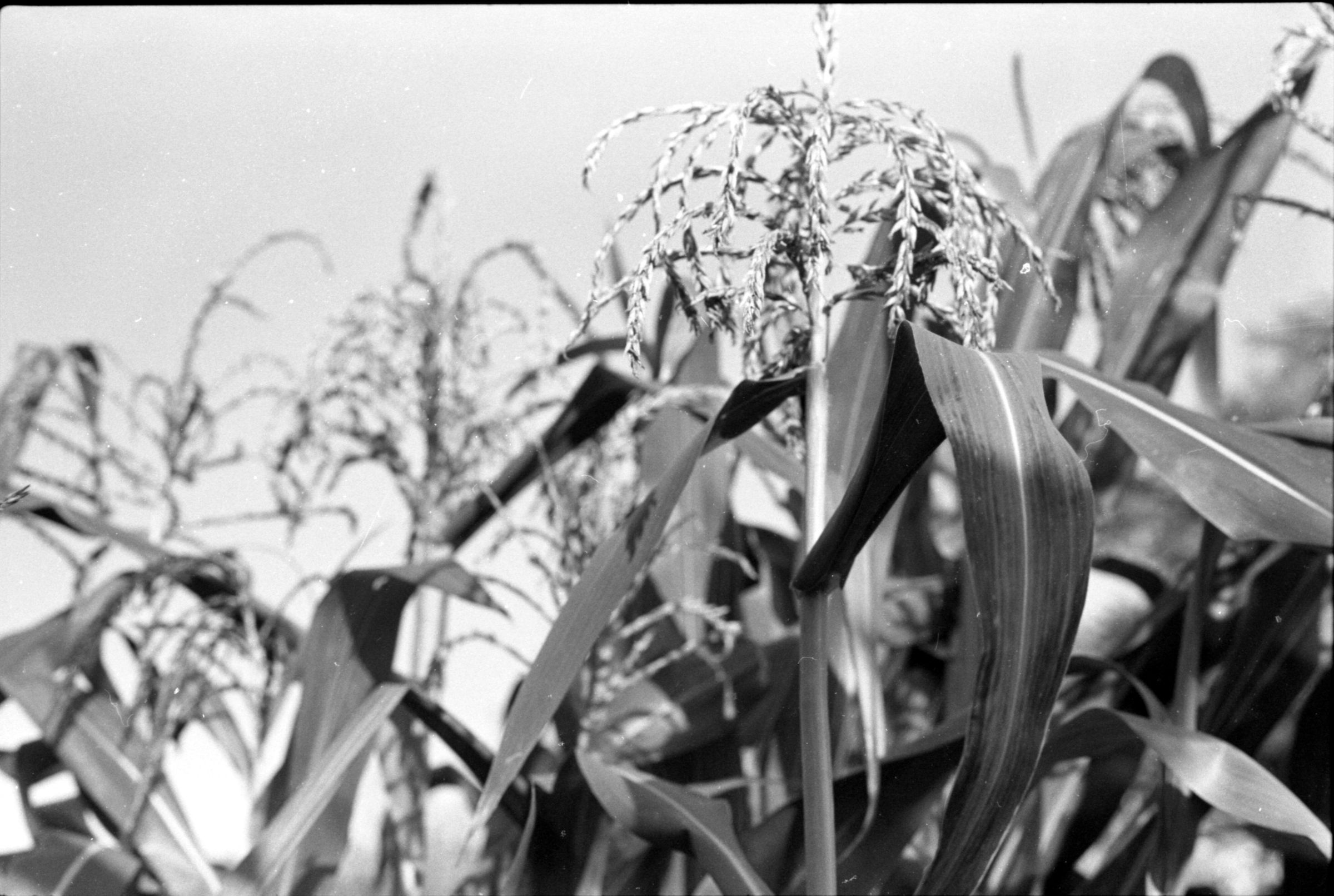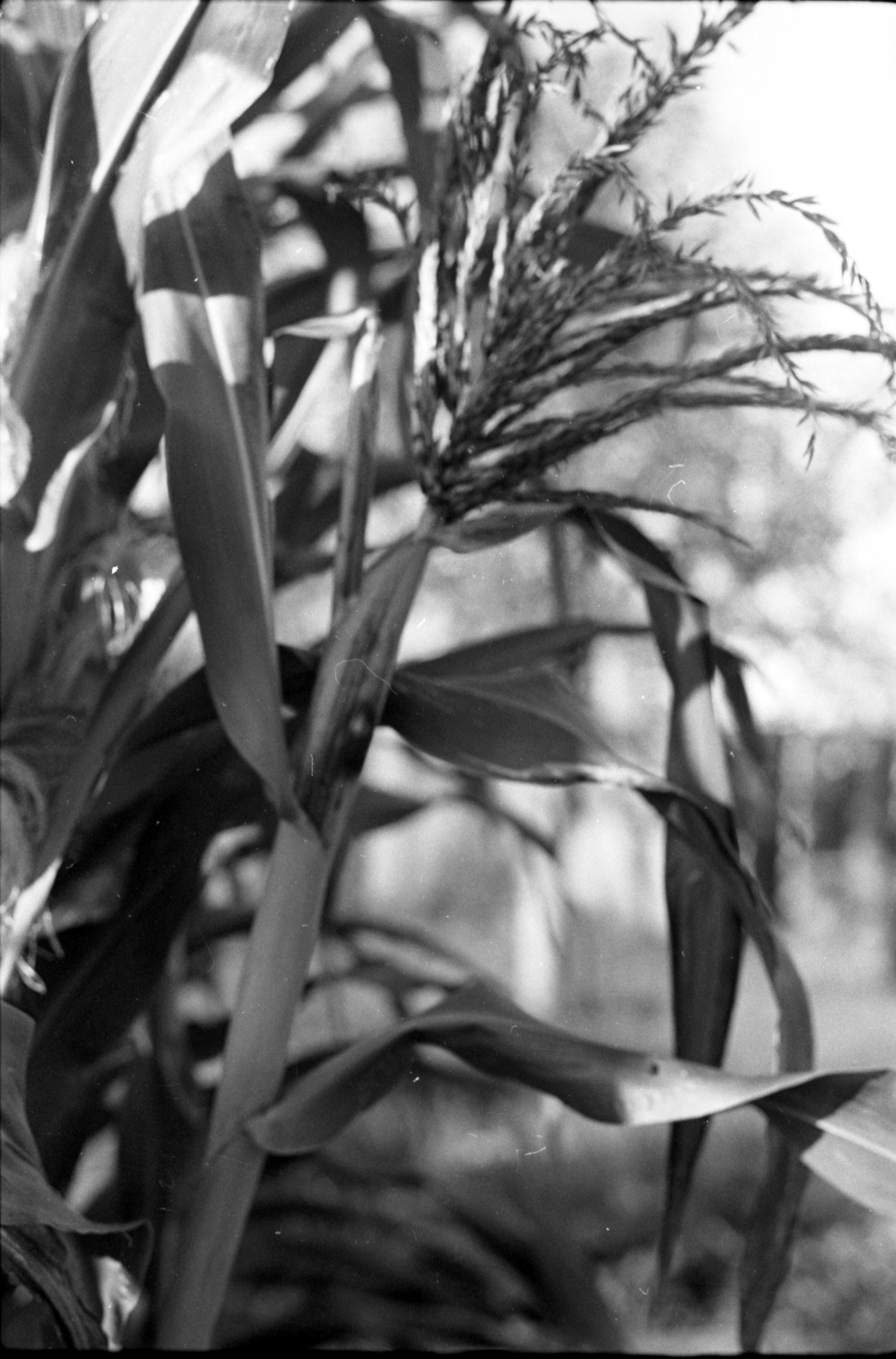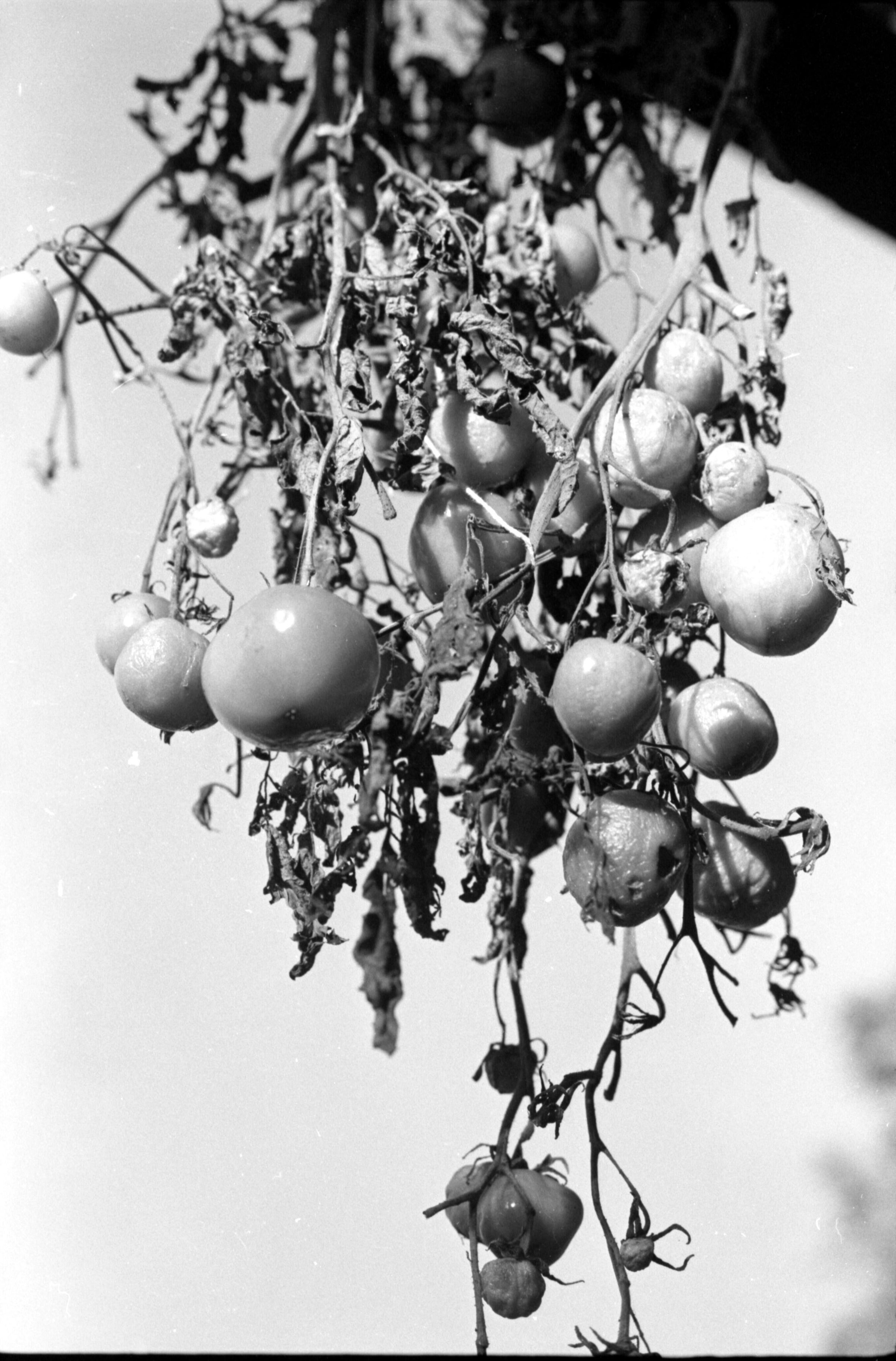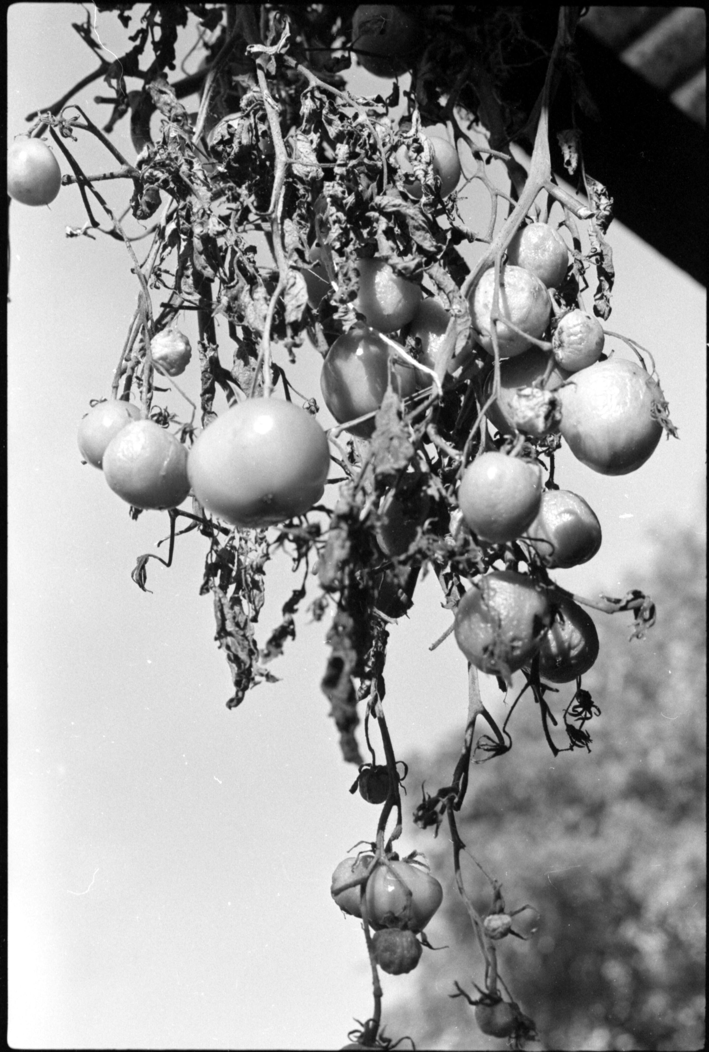 Plants, 1978. These three black and white film negative strips were created for the Lacey Leader newspaper. These images show tomatoes, corn, squash and sunflowers growing. They also show a woman blocking her face from the camera.Made/Created