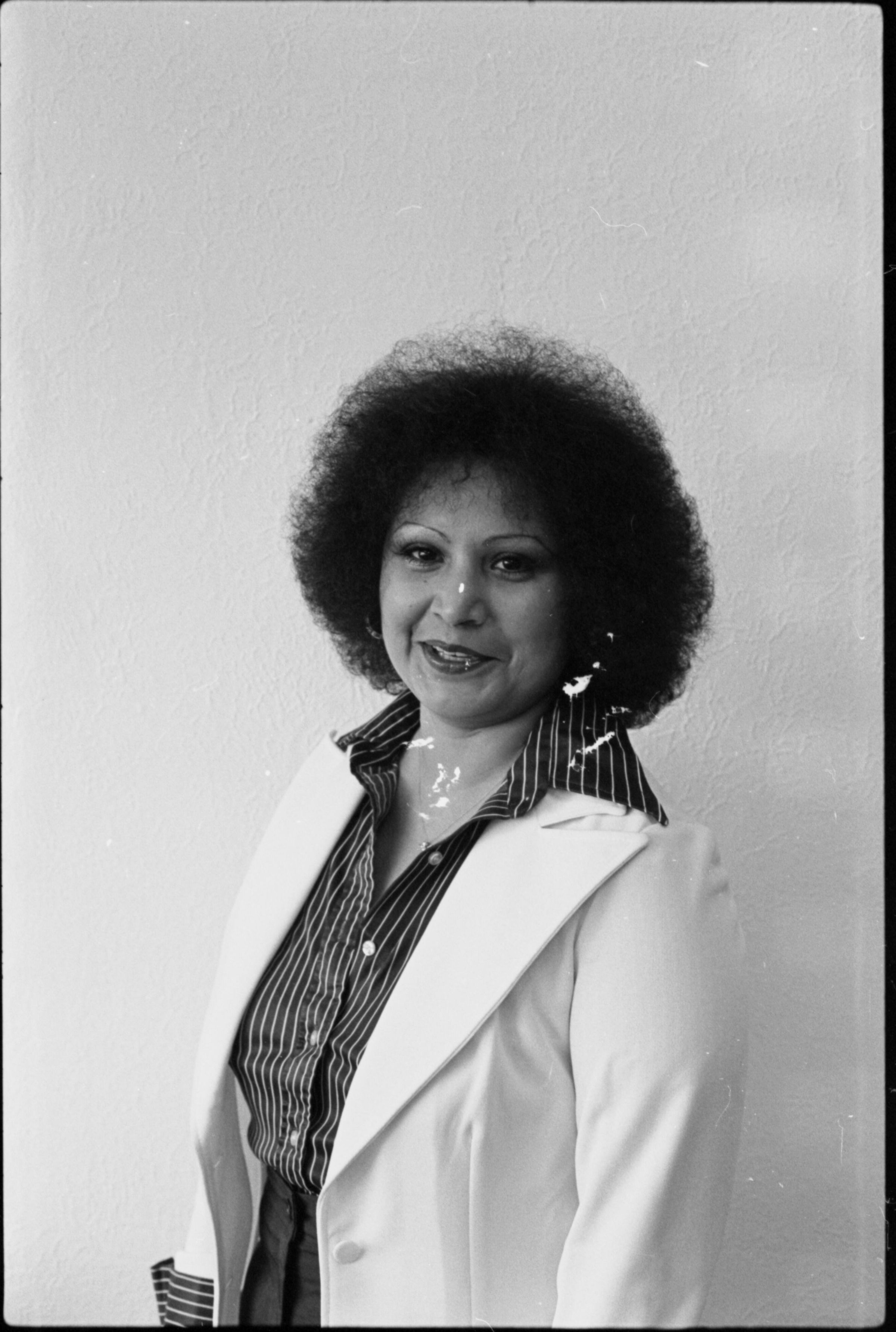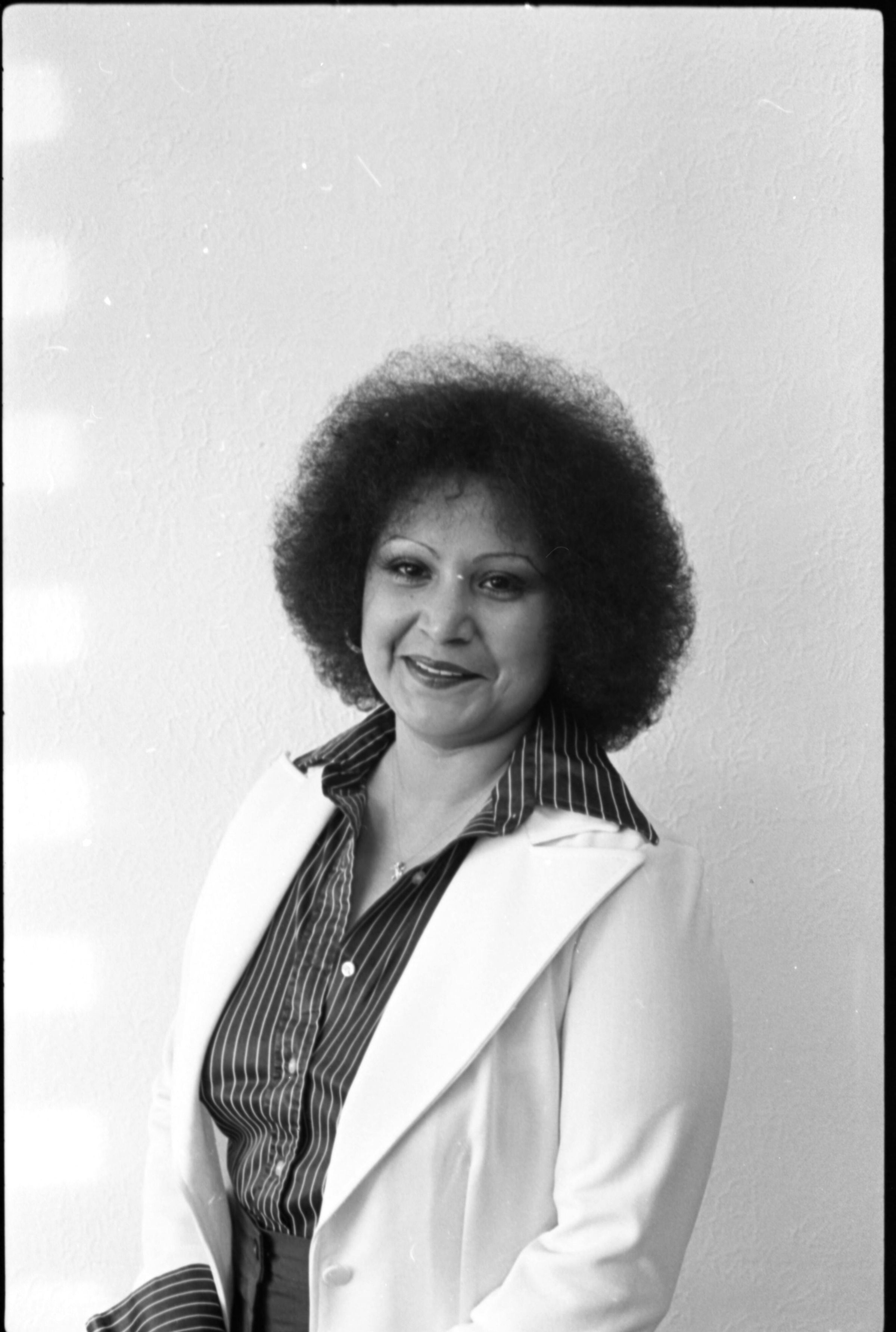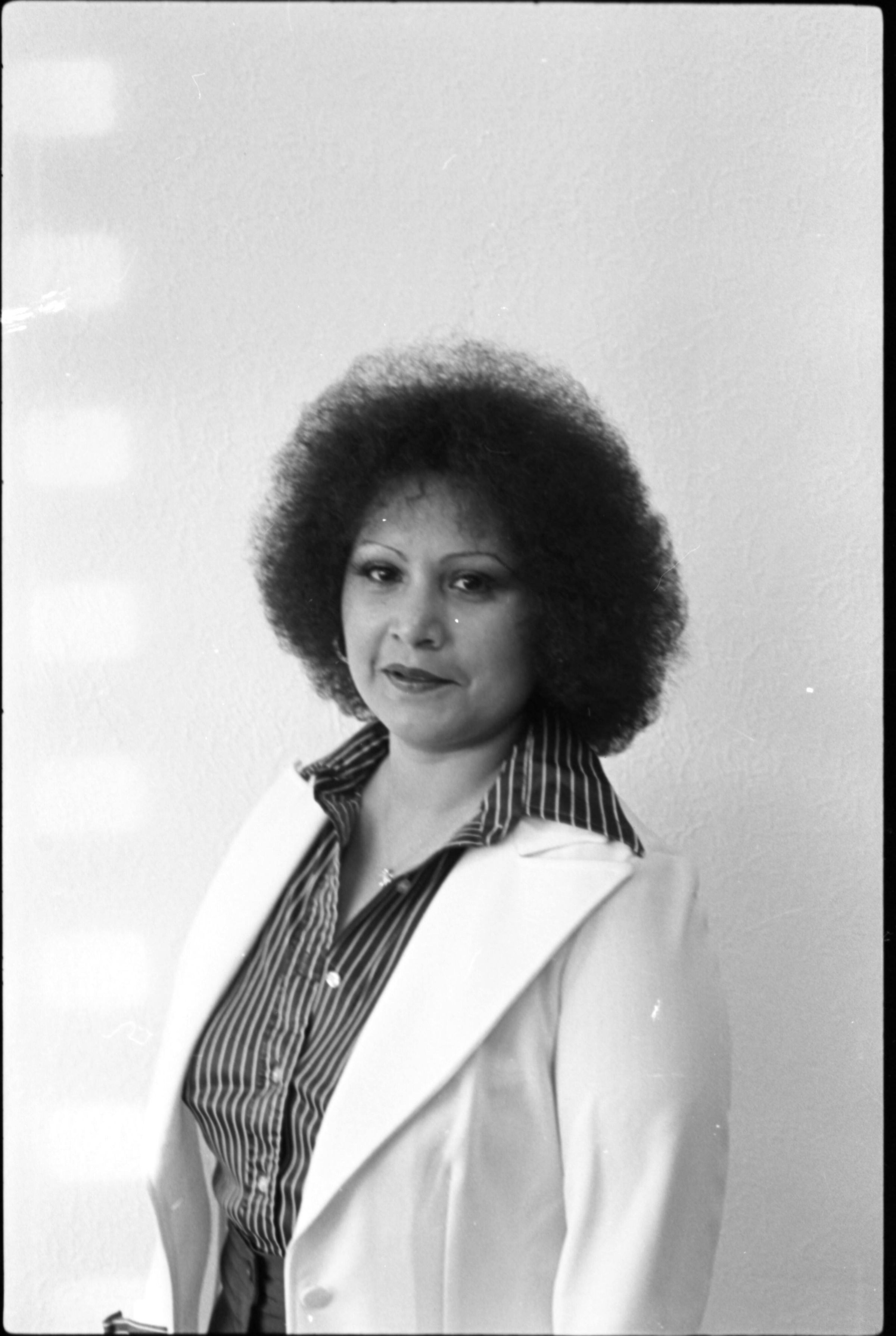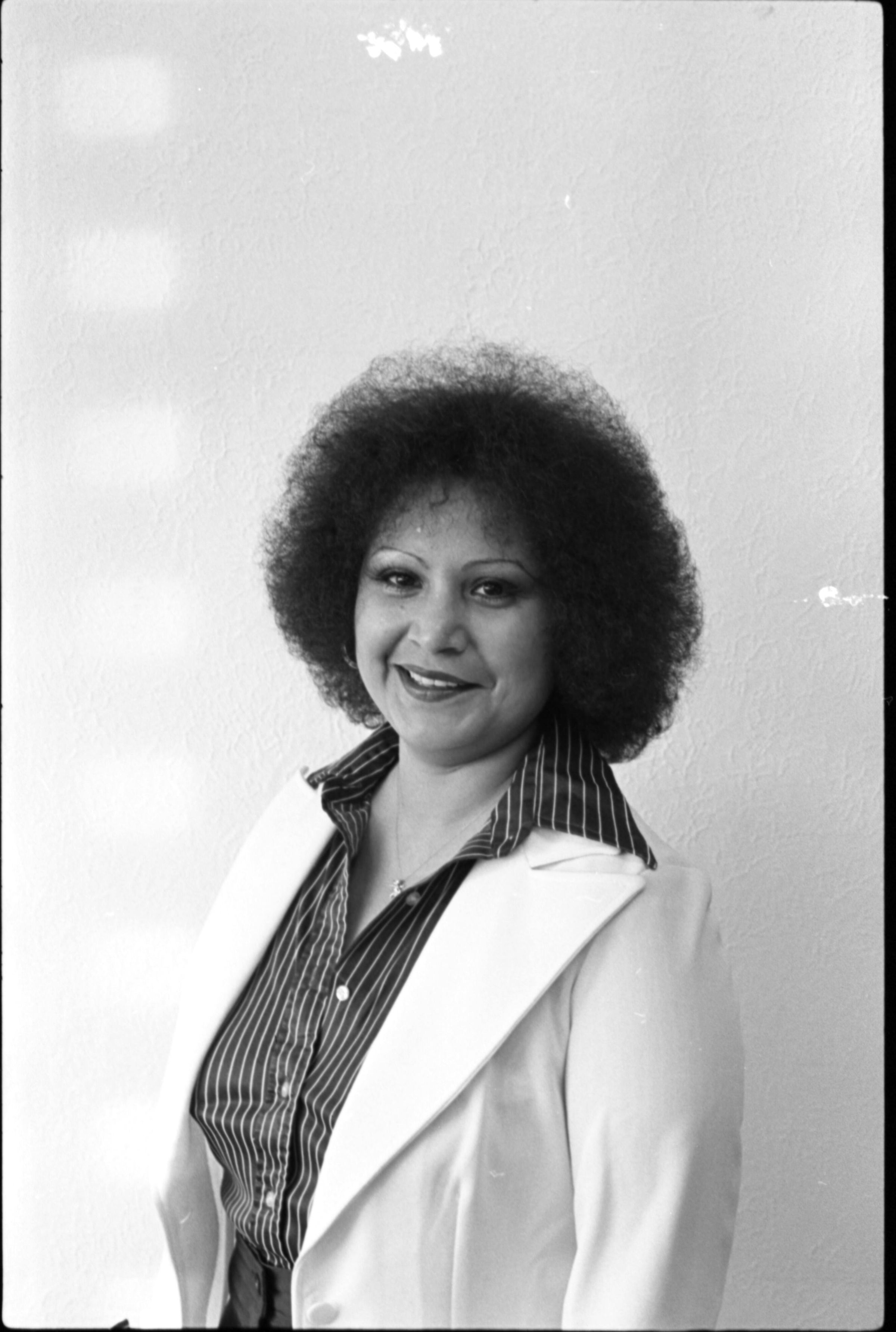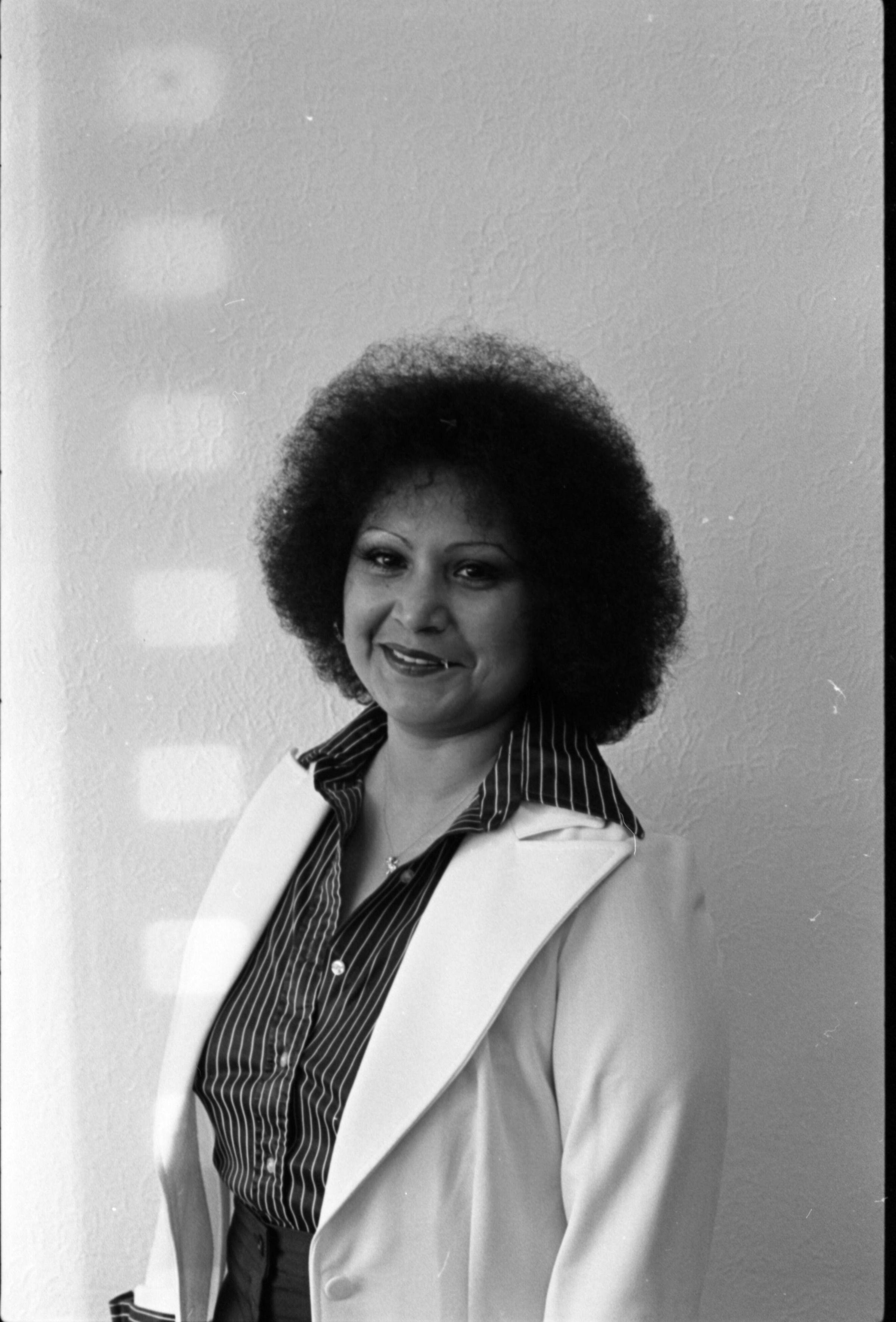 Ed. - National Cable, 1979. These two black and white film negative strips were created for the Lacey Leader newspaper. These images show a woman with very curly hair wearing a blazer over a vertically striped button-up shirt. Her body is oriented toward the left-hand side of the image, and her face is turned somewhat toward the camera.Made/Created