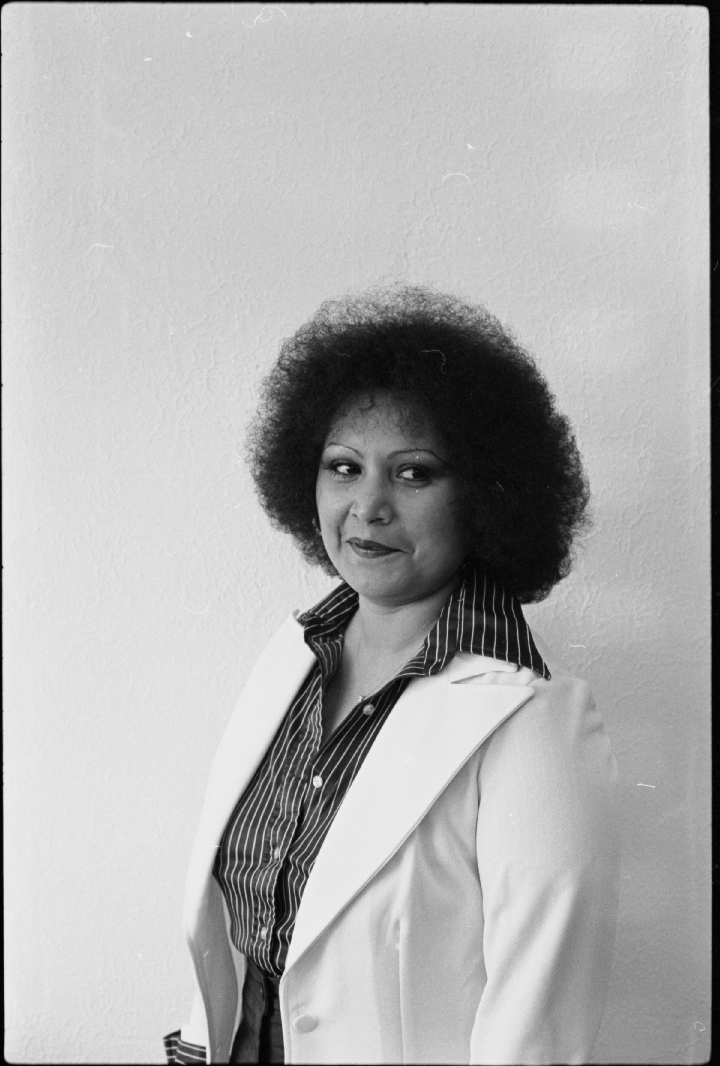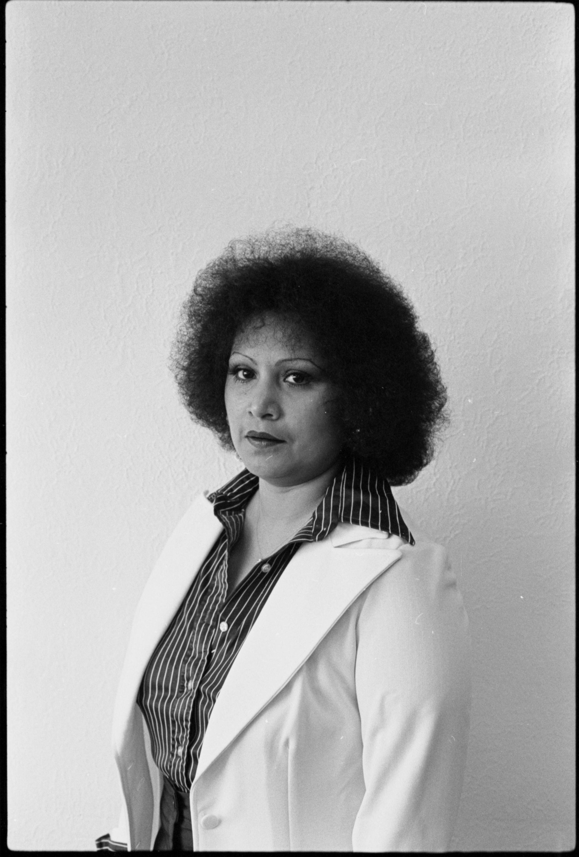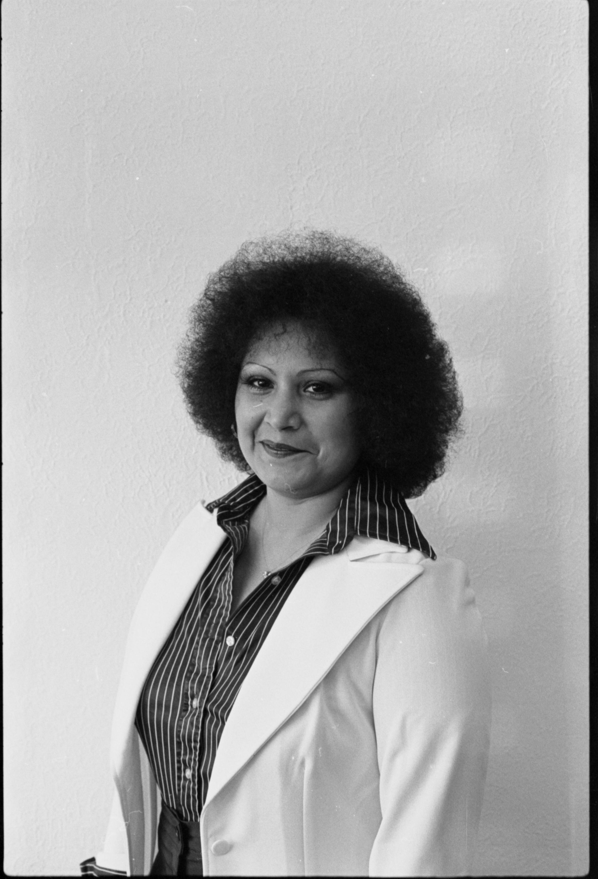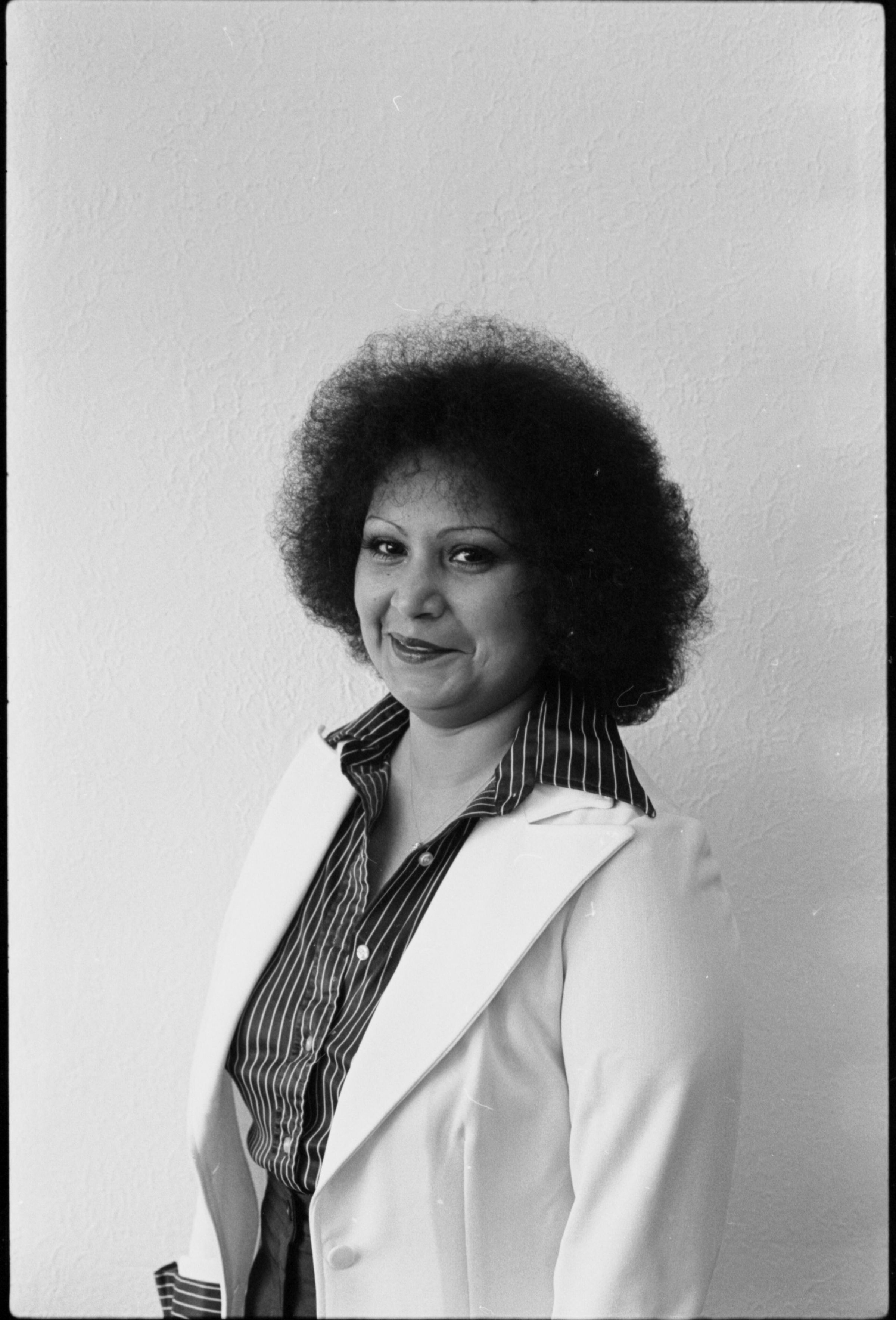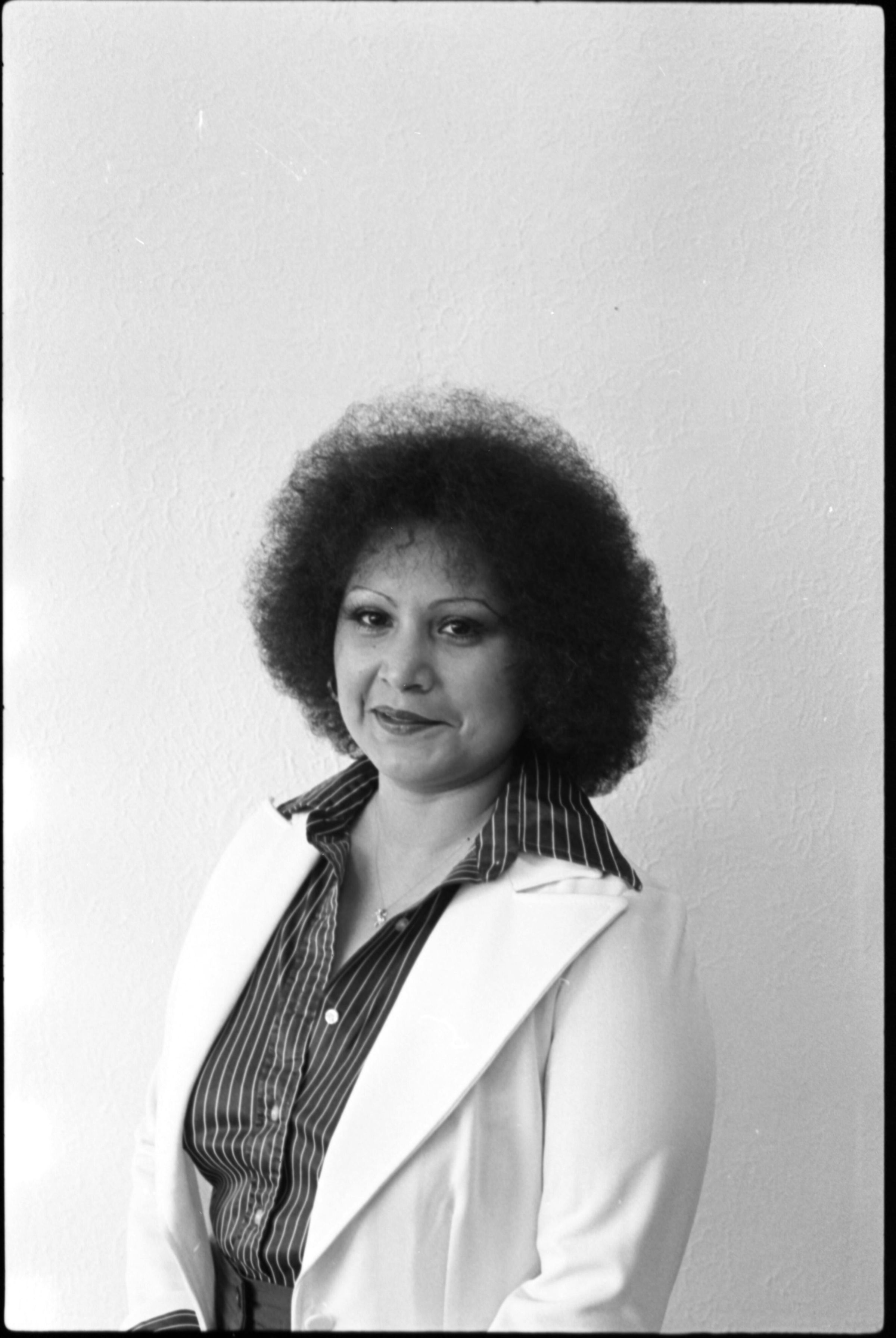Ed. - National Cable, 1979. These two black and white film negative strips were created for the Lacey Leader newspaper. These images show a woman with very curly hair wearing a blazer over a vertically striped button-up shirt. Her body is oriented toward the left-hand side of the image, and her face is turned somewhat toward the camera.Made/Created