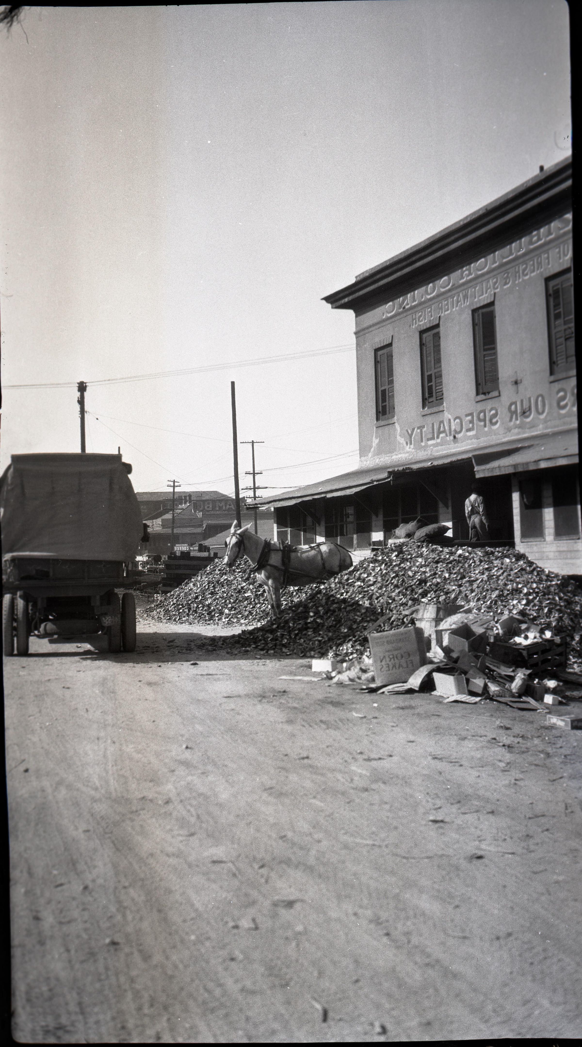 The negative is inserted along with a print of the image into a brown envelope that has typed "New Orleans--Oyster Shells Back of French Market 10/15/29". Stamped is "229" and "indexed".Made/Created