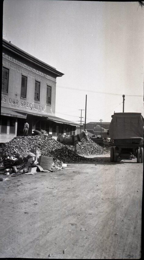 Black and white negative of oyster shells behind a building. In the foreground is a dirt street or alley. To the left of the image is a large pile of shells along with some containers. Behind that is a two-story building with a covered porch. Windows are visible in the second floor, and telephone poles and other structures are visible in the background. At the right is the rear of a truck parked on the road. There is a white border on all sides, and in the bottom border is "#229" and "10/15/29".