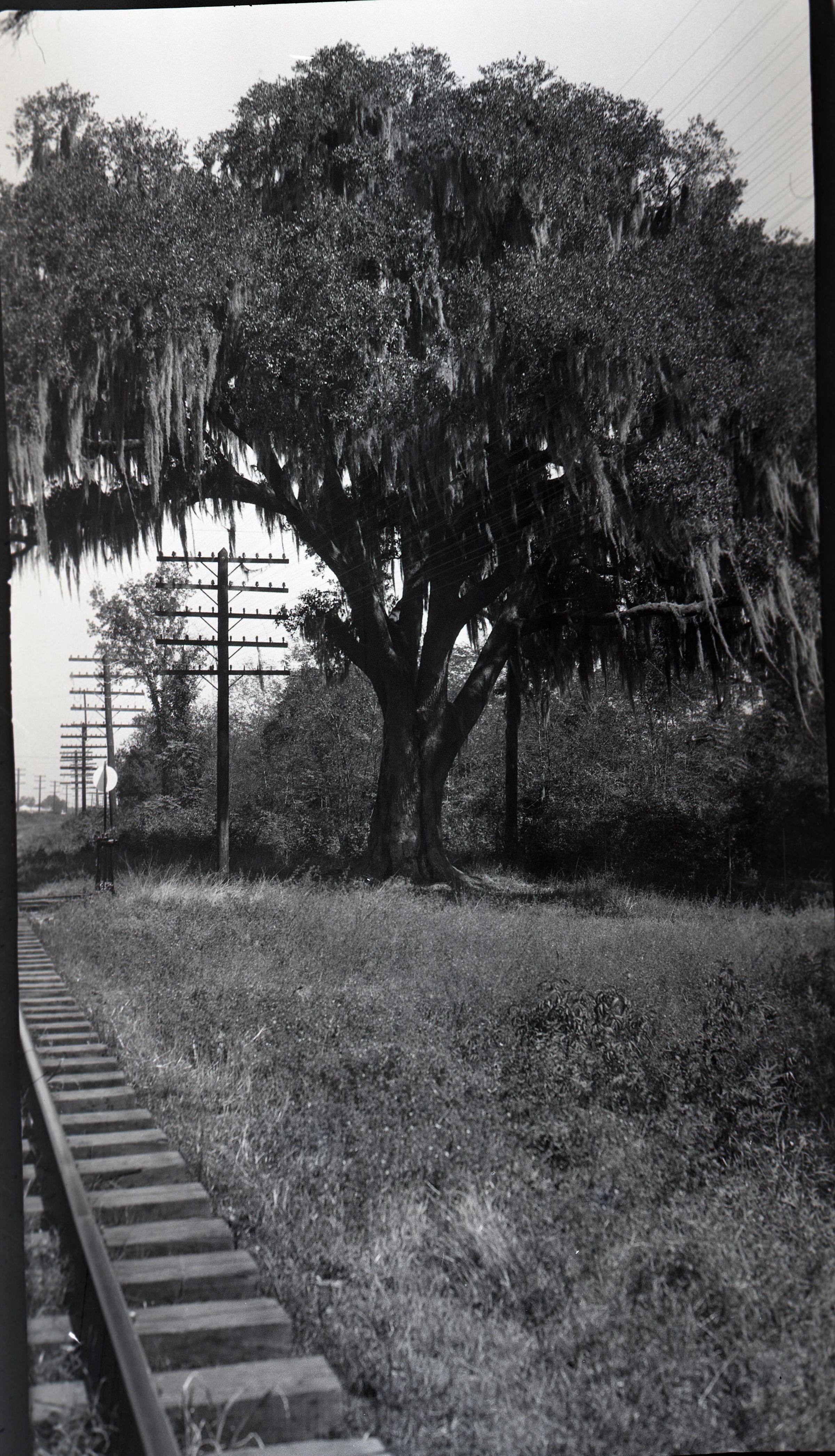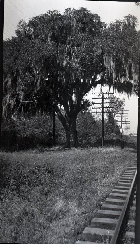 Black and white negative of a tree. In the foreground is grass and railroad ties and a portion of a rail. In the background is a large tree and other trees along with a telephone poles with several arms. There is a white border on all sides, and in the bottom border is "#231" and "10/16/29".