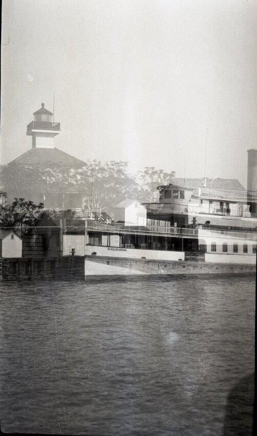 Black and white negative of a steam boat on the Mississippi River. In the foreground is water. Only the front portion of he boat is visible. The prow is pointed and, since the boat is moored at a dock, buildings on the dock appear to be a part of the boat. The boat has several decks with windows and railings. The rounded bridge is visible on the top deck. Behind the boat are trees, and a hill or mound with a tower at the top. There is a white border on all sides, and in the bottom border is "#234" and "10/16/29".