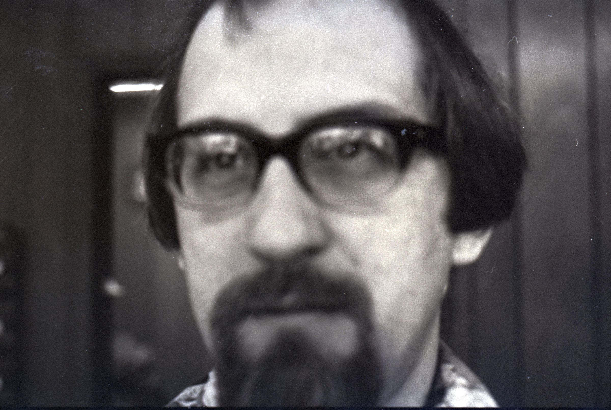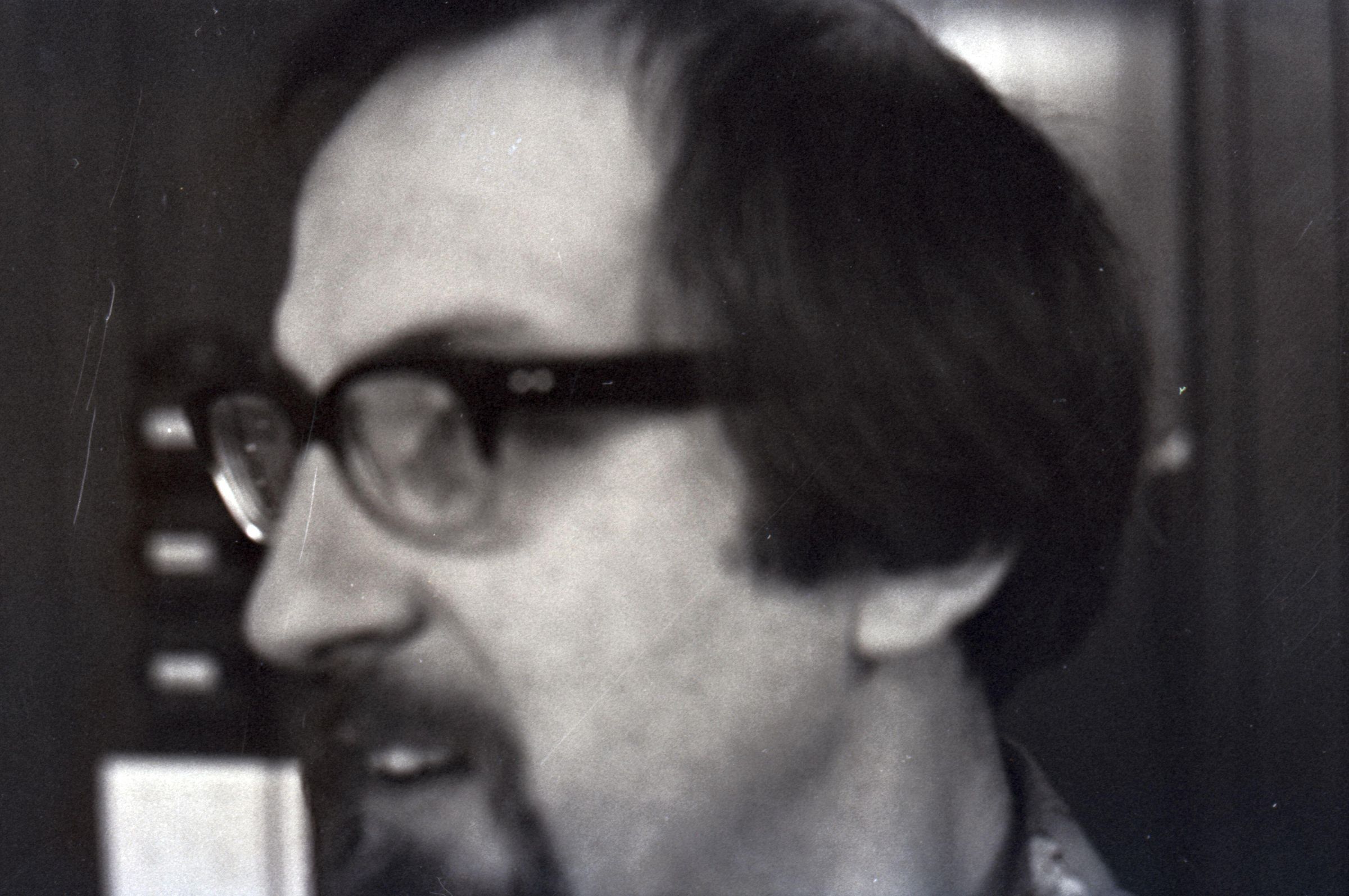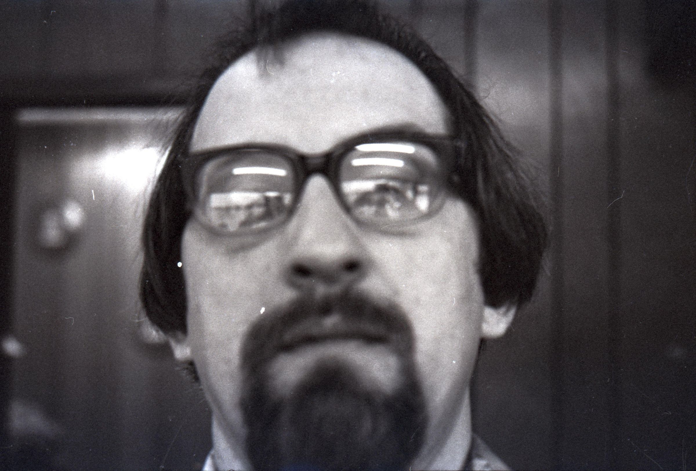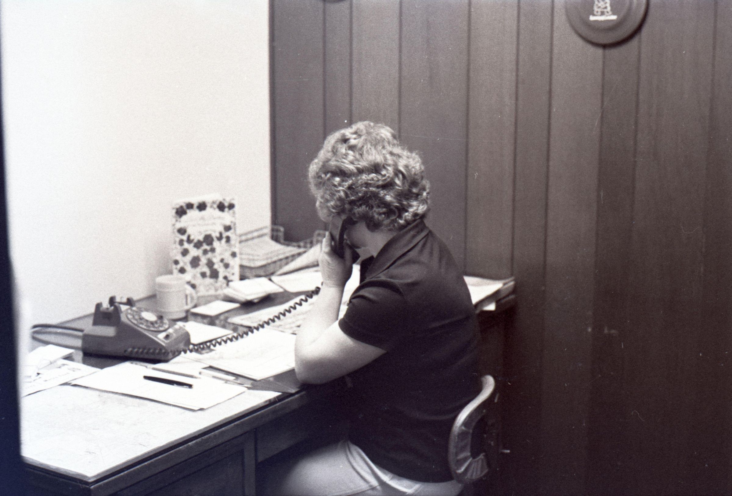 Ken Balsley, Unknown Date. This single black and white film negative strip was created for the Lacey Leader newspaper. These images show an unknown woman sitting at a desk, and Ken Balsley's face from several angles.Made/Created
