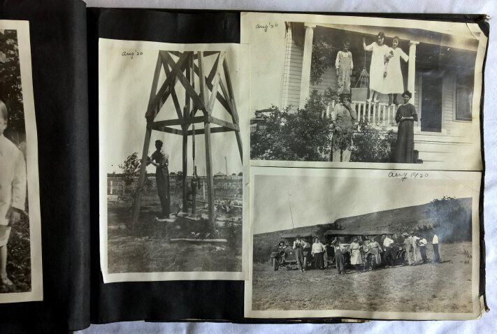 George Elder photo album, 1918-1923. Black cover with black pages. "Photographs" embossed in gold on the front cover. Inside front cover is written in pencil: "To George From Mamie 12-25-1918". Photographs are glued to all but the last page. They range in date from September 26, 1918 to July 4, 1923.