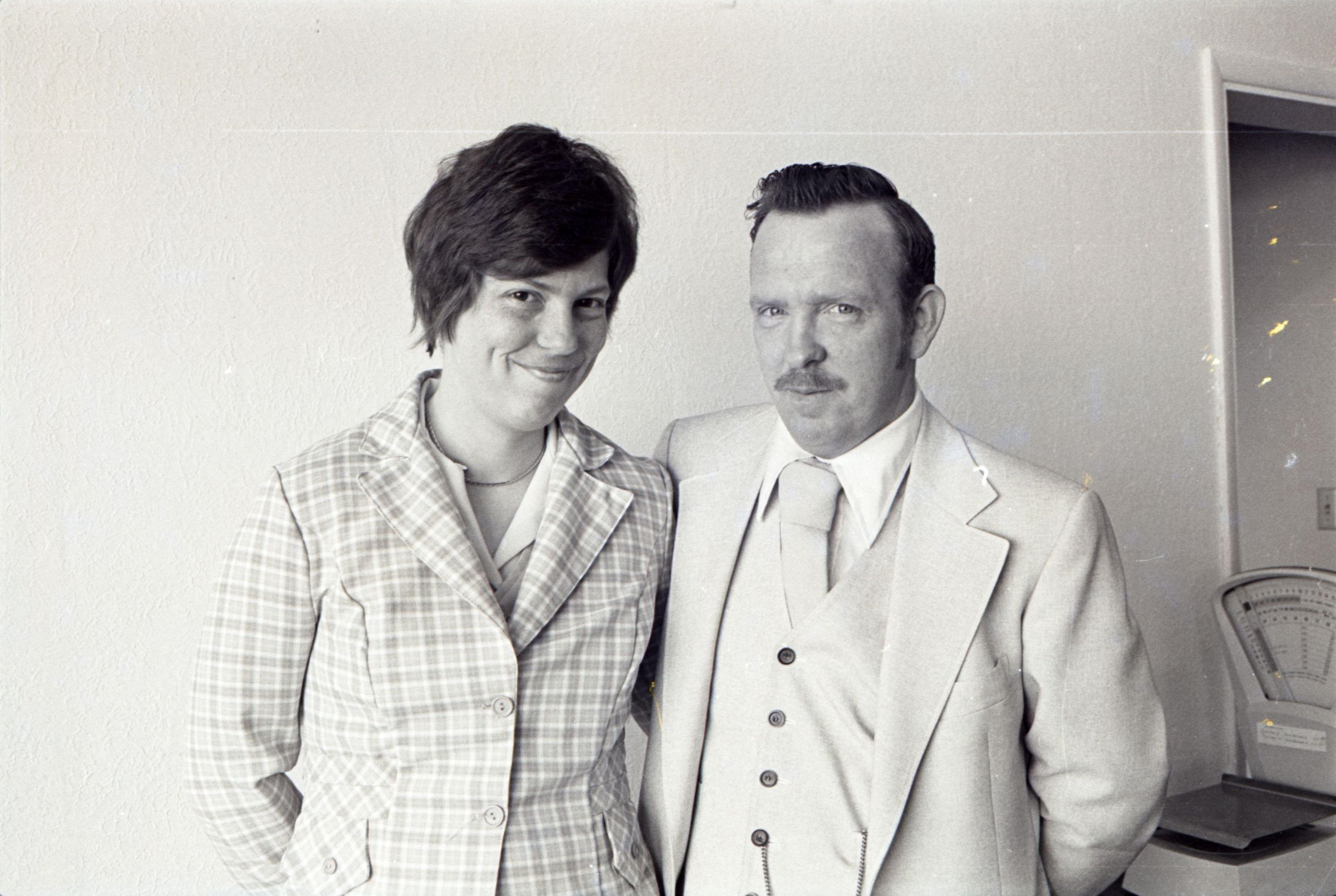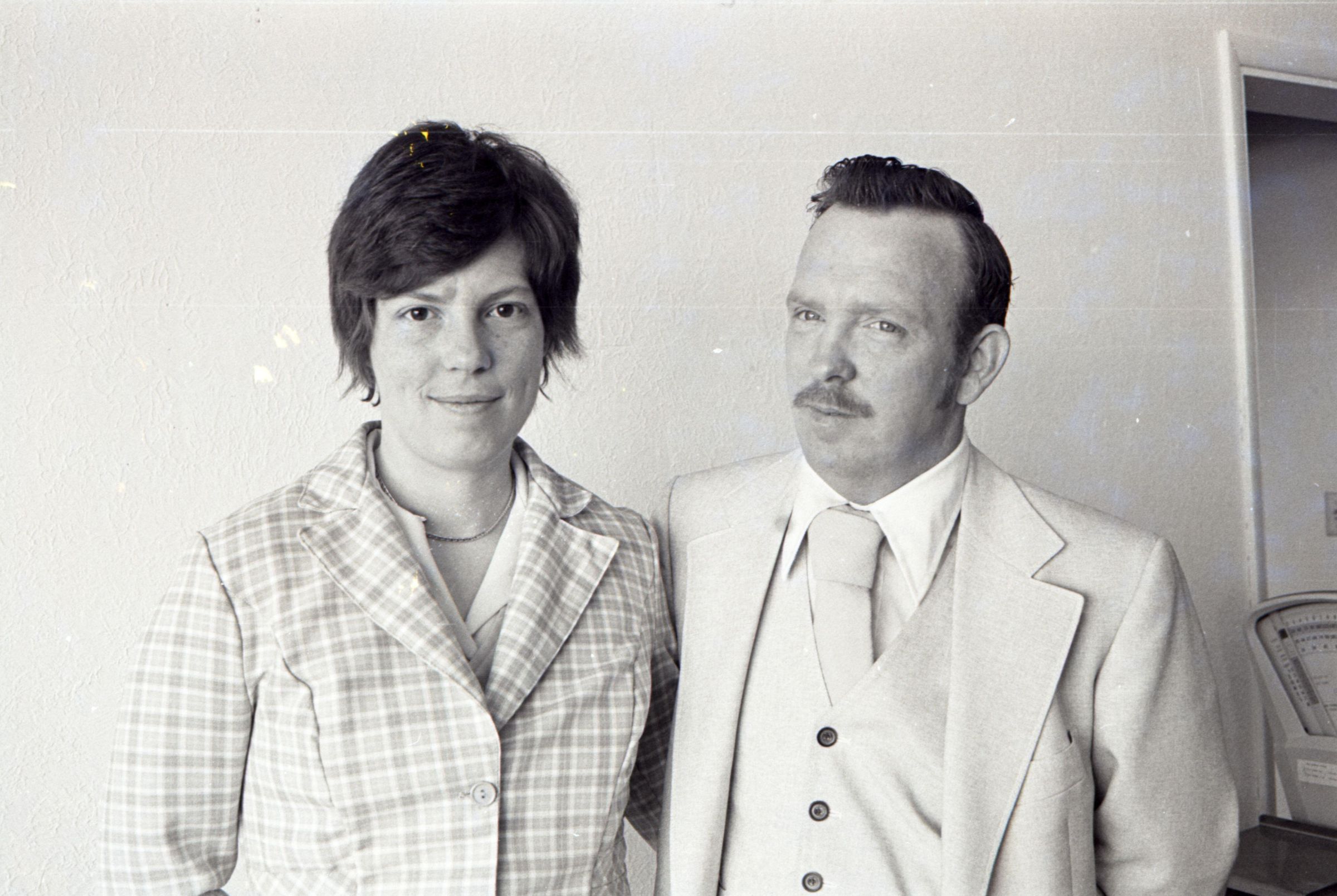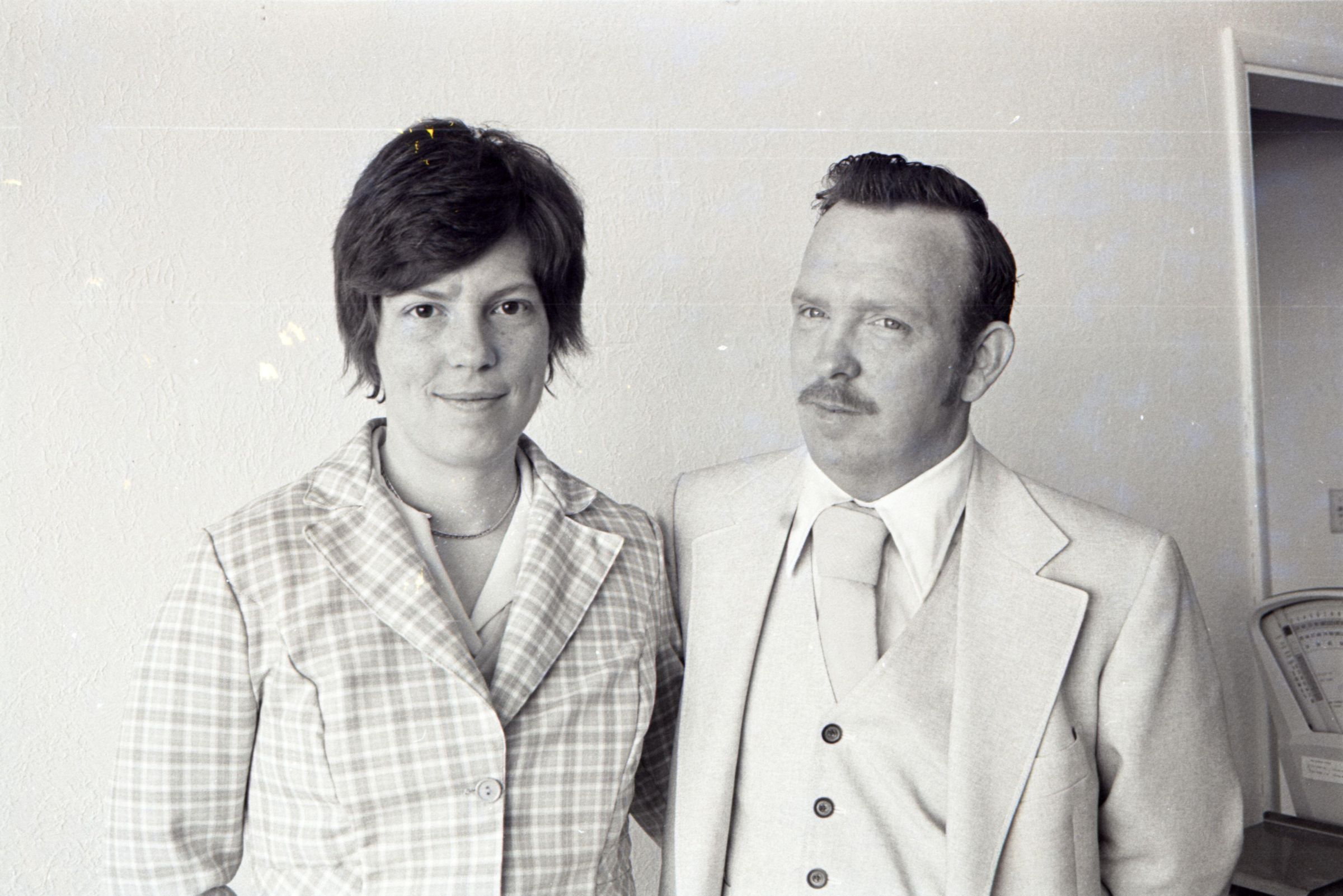 The Taltons, 1979. These two black and white film negative strips were created for the Lacey Leader newspaper. These images show a man (Ralph Talton) and a woman (Carla Talton) standing next to each other.