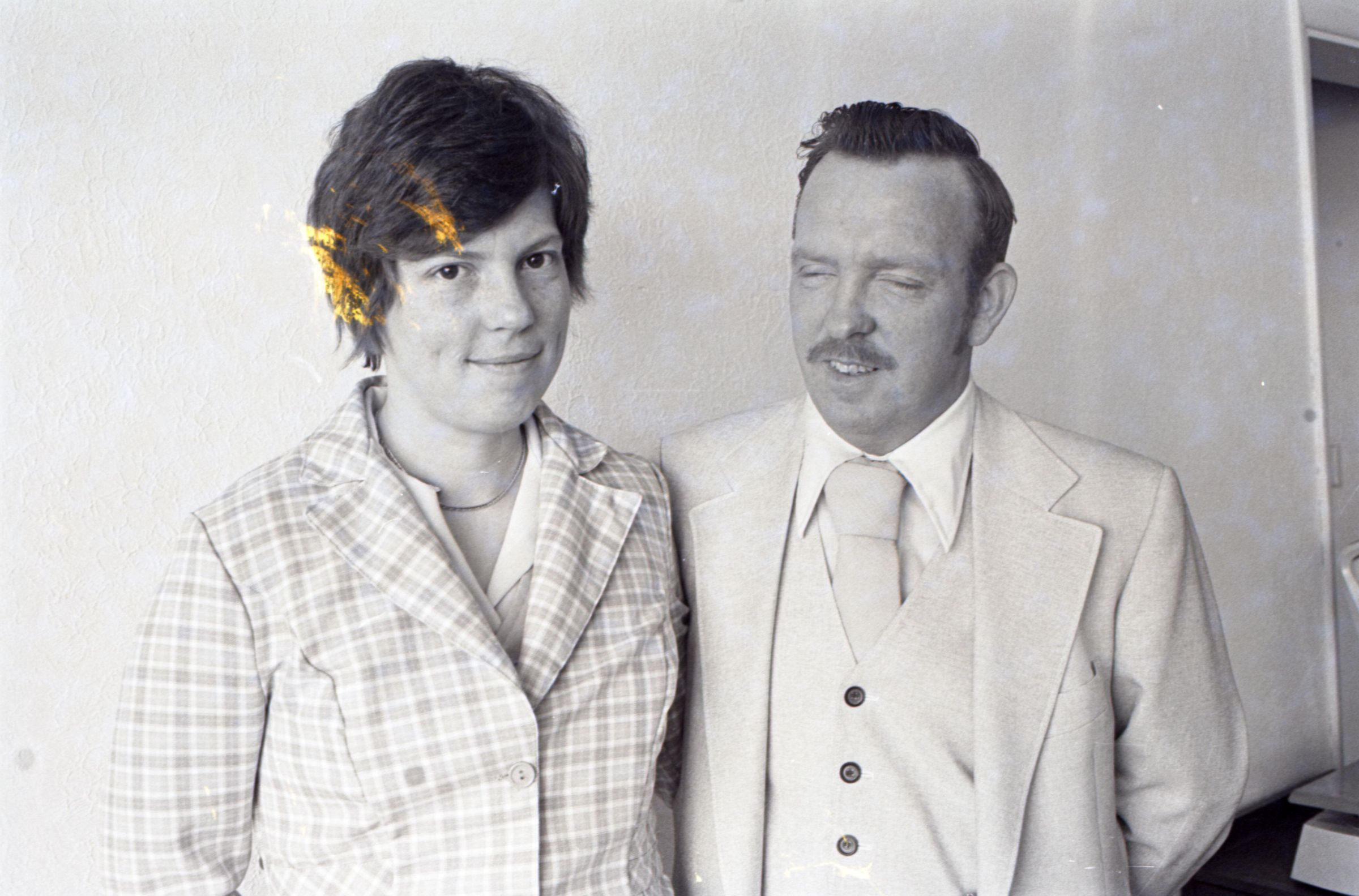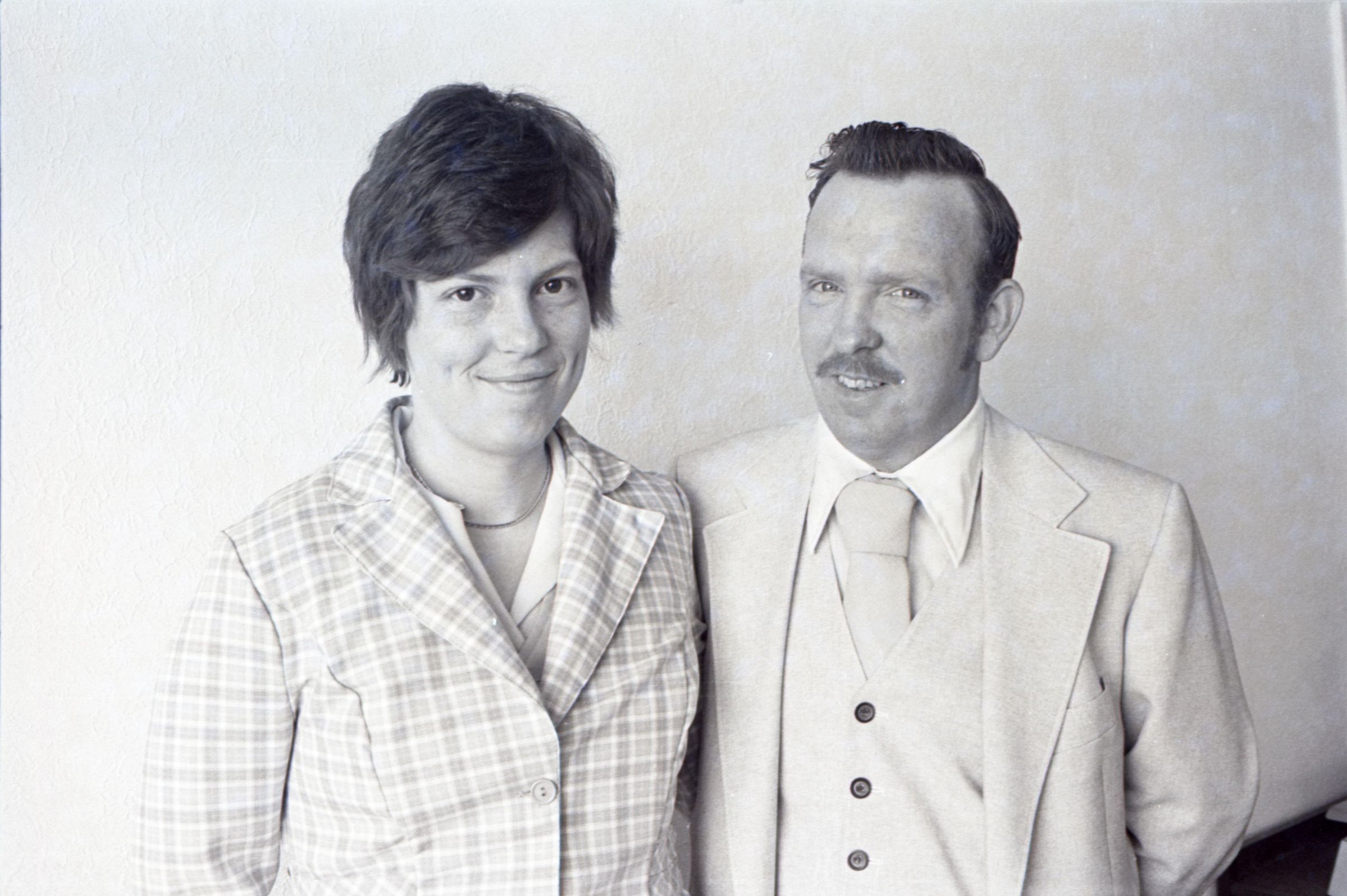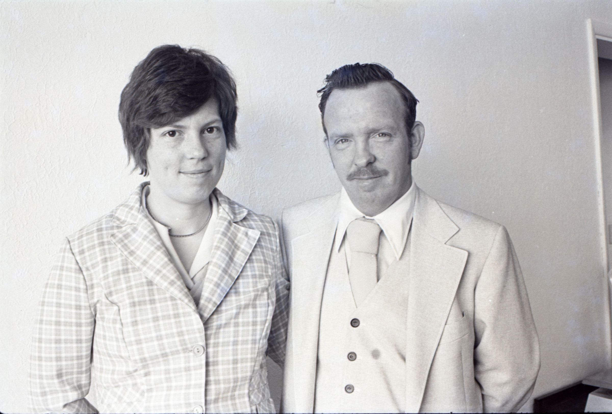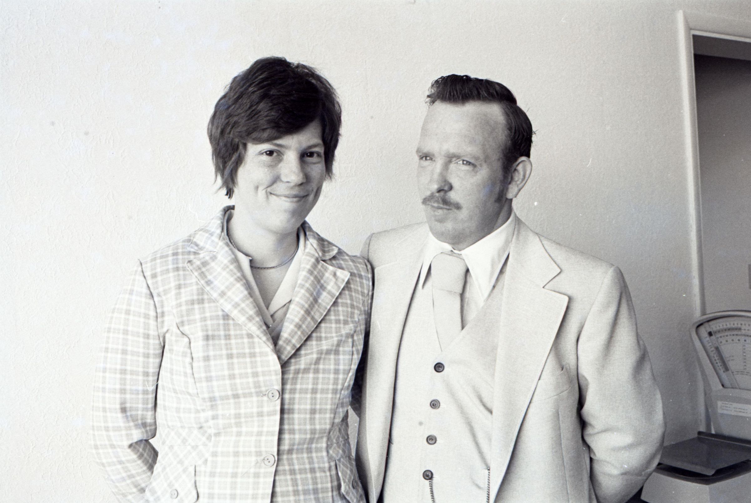 The Taltons, 1979. These two black and white film negative strips were created for the Lacey Leader newspaper. These images show a man (Ralph Talton) and a woman (Carla Talton) standing next to each other.
