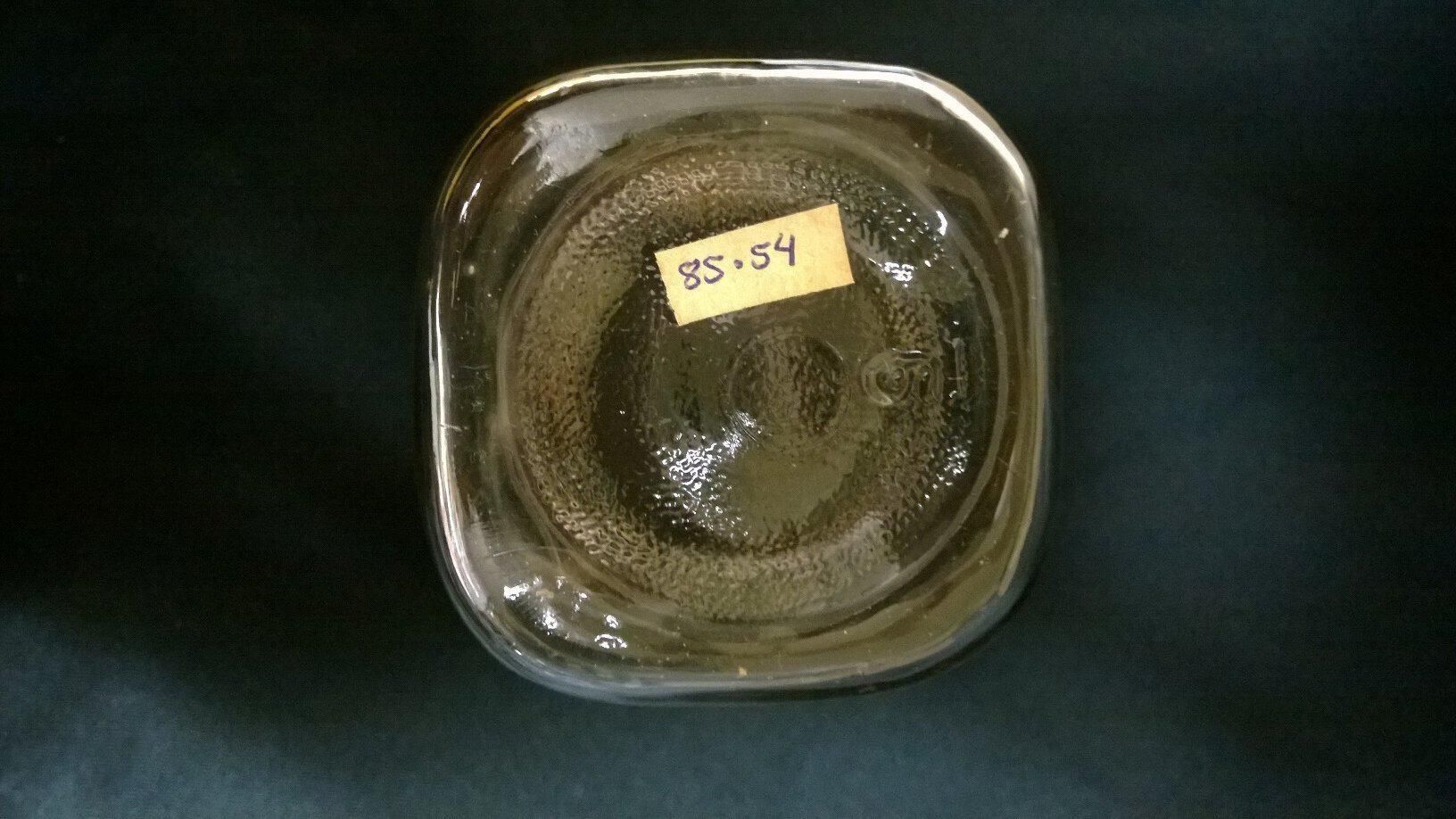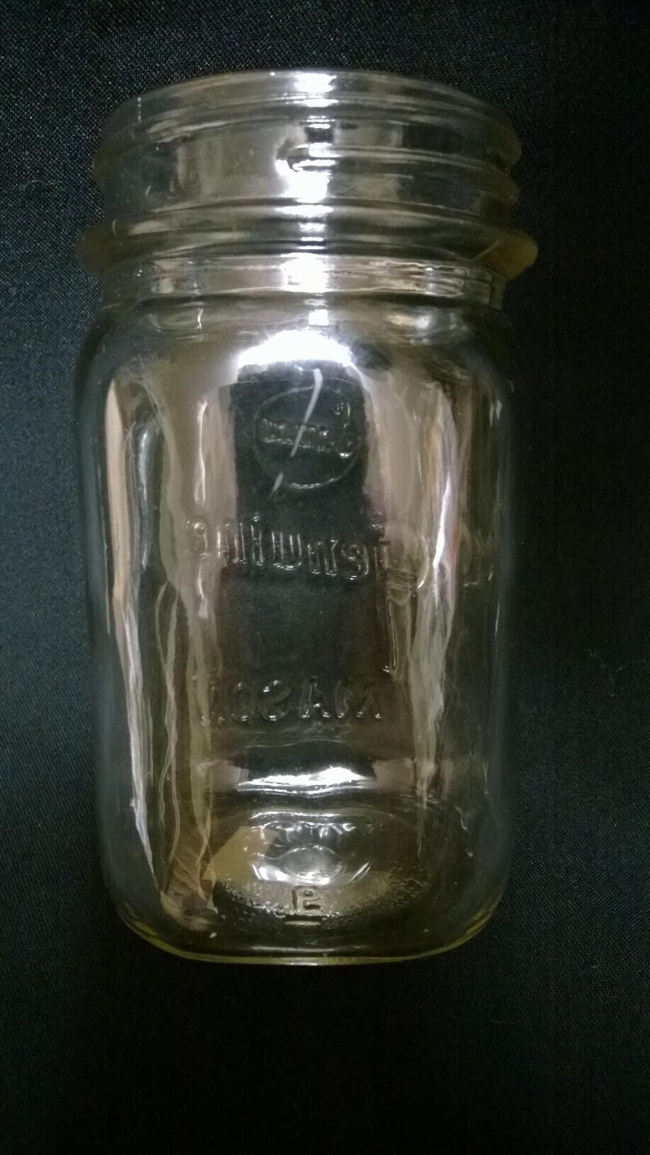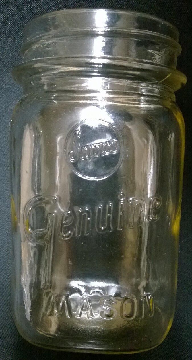 Clear glass Samco 1 pint glass canning jar. Jar is cylindrical in shape with rounded squared off sides. Mouth of jar is threaded for a screw-on lid. Mold seam on two corners go from base side to the top of the mouth without going over the top. There is a horizontal seam where mouth and base were separately applied. The following is embossed on the side: "Samco" (in a circle) "Genuine" and "MASON" and on the bottom: "9" with a line under it. The base of the jar has a rough circular mark with a smaller circle within.