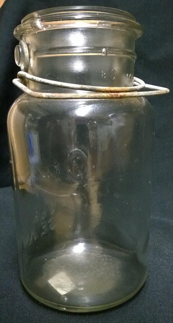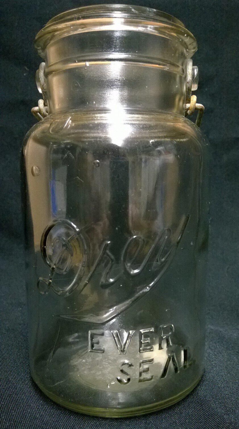 Clear glass Drey one-quart canning jar. The jar is cylindrical in shape with a wire bail for securing a lid. The side mold seams extend from a horizontal mold seam on the side very near the bottom up to but not over the lip. Besides the horizontal seam near the bottom, there is a horizontal mold seam where the top meets the base. Embossed: on the side near the top: "8" and a backwards "S". On the side, "Drey" and "Ever" "Seal".Made/Created
