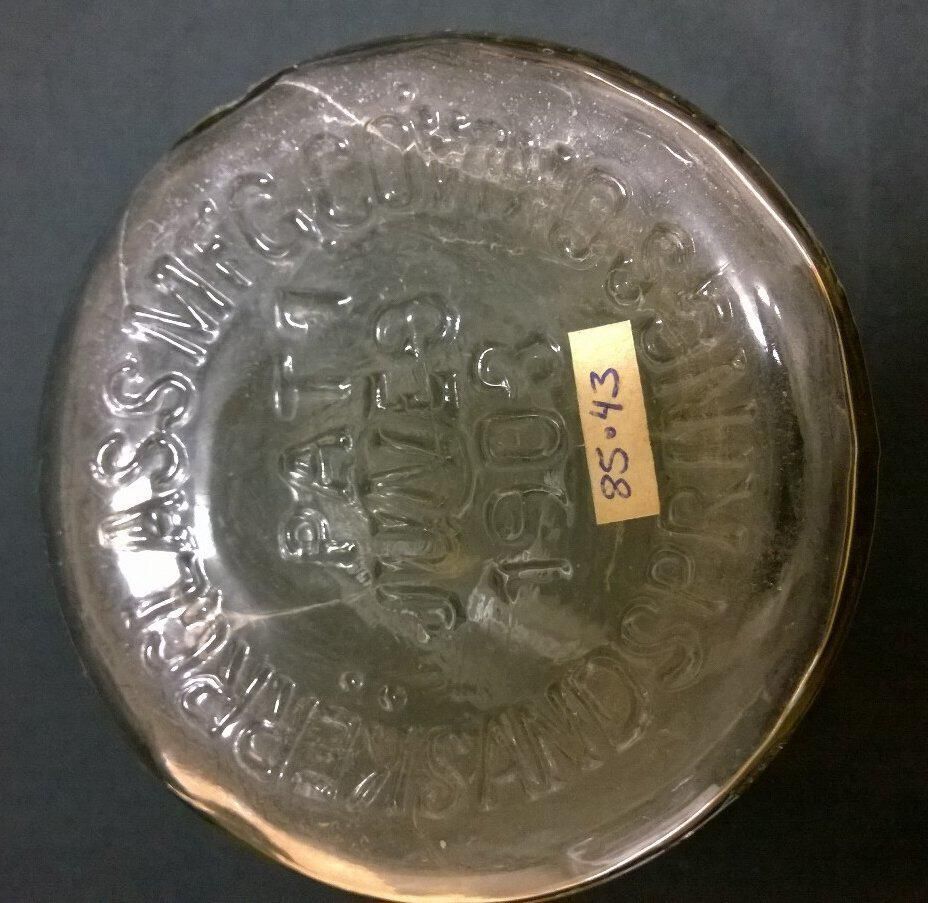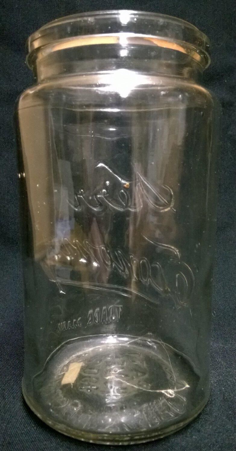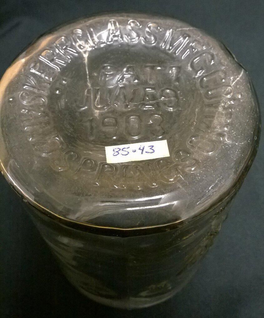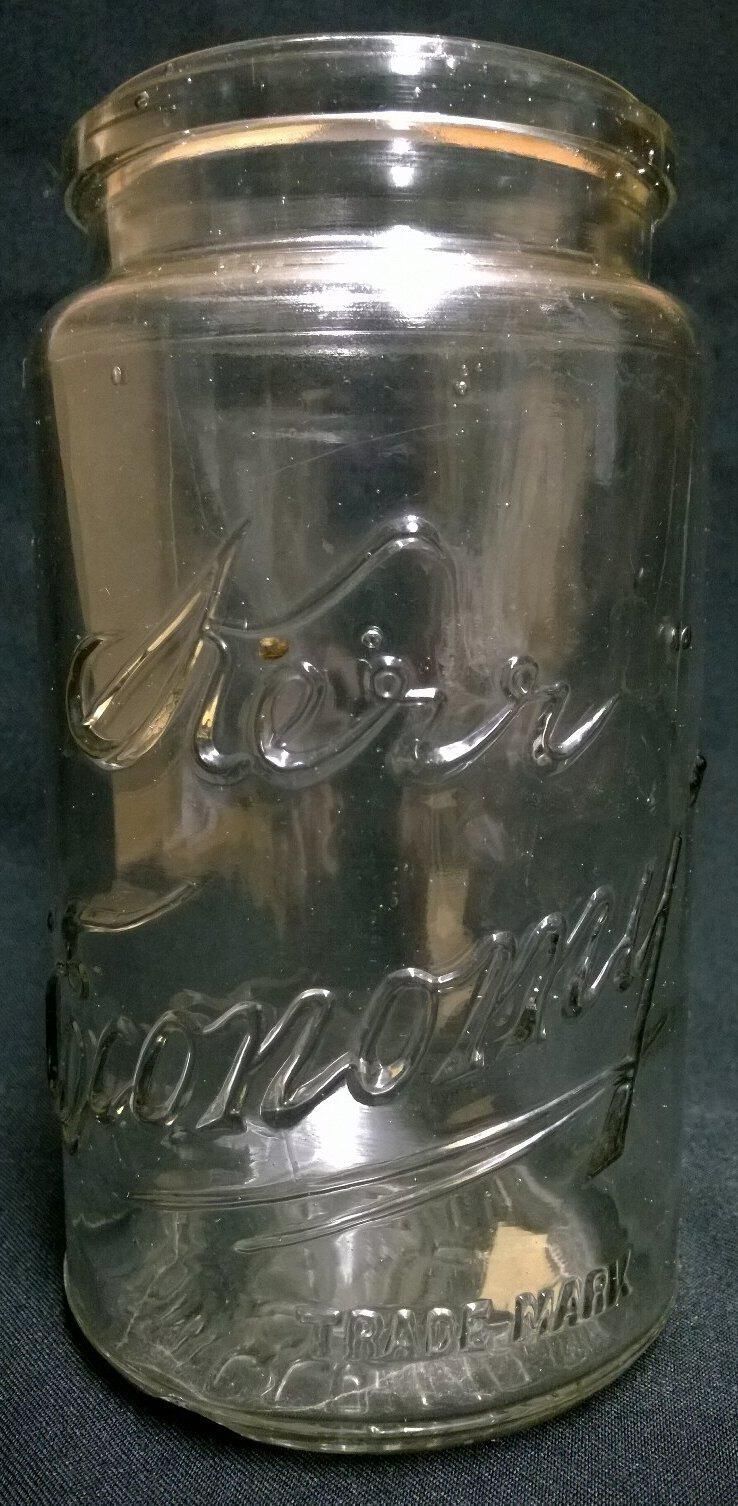 Clear glass Kerr one-quart wide mouth canning jar. The jar is cylindrical in shape with a flat top and no screw threads. The mold seams on the side extend from a horizontal seam on the side very near the bottom and go up to but not over the flat ridge near the lip. Besides the seam near the bottom, there is a seam where the top meets the base (on the shoulder of the base). Embossed: on the side: "Kerr" "Economy" "trademark" and on the bottom: "Kerr Glass Mfg Co" "Sand Springs Okla." "Pat 7 June 9 1903". Slight chip at base. Some bubbles and rough seams.Made/Created