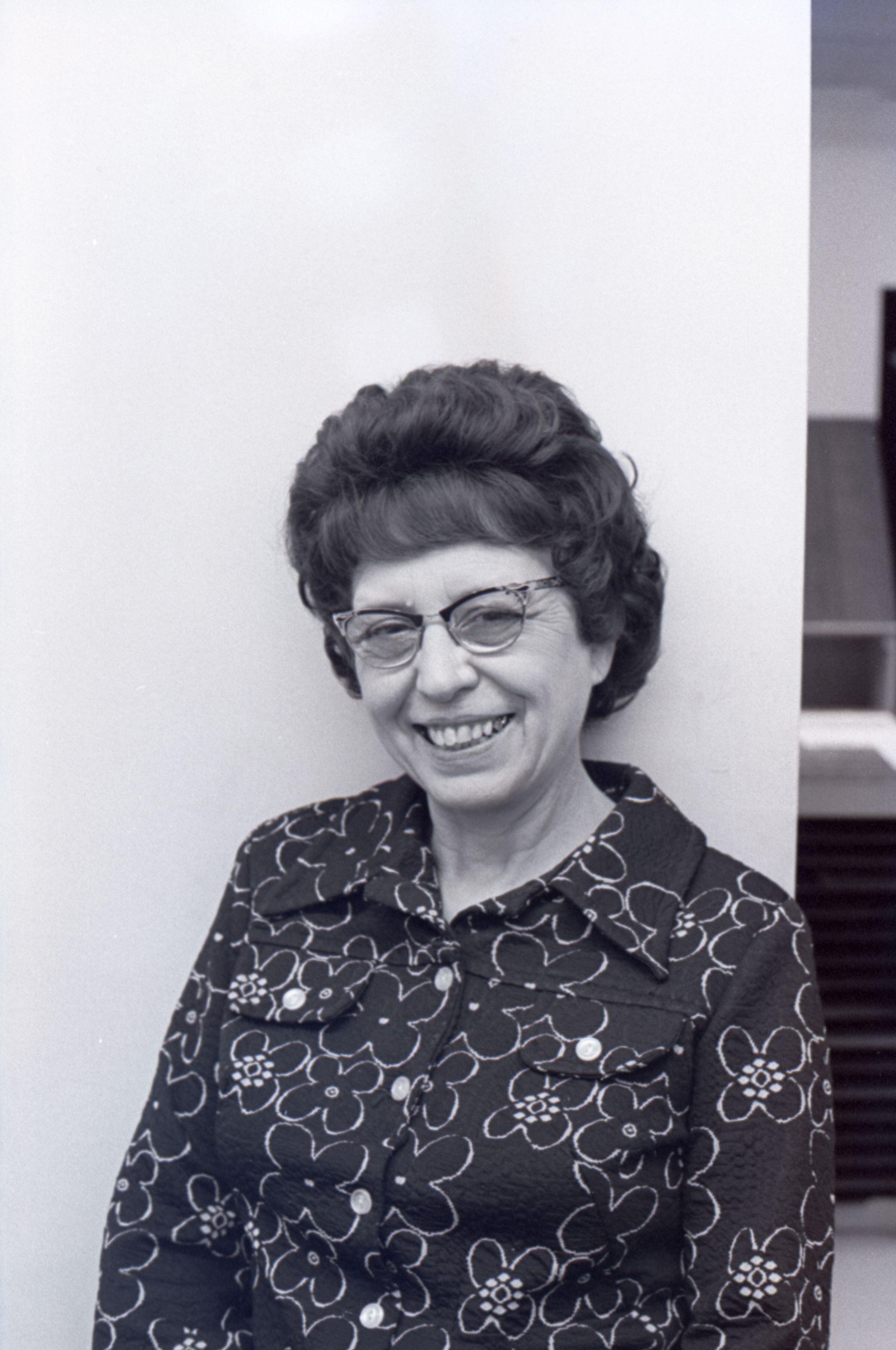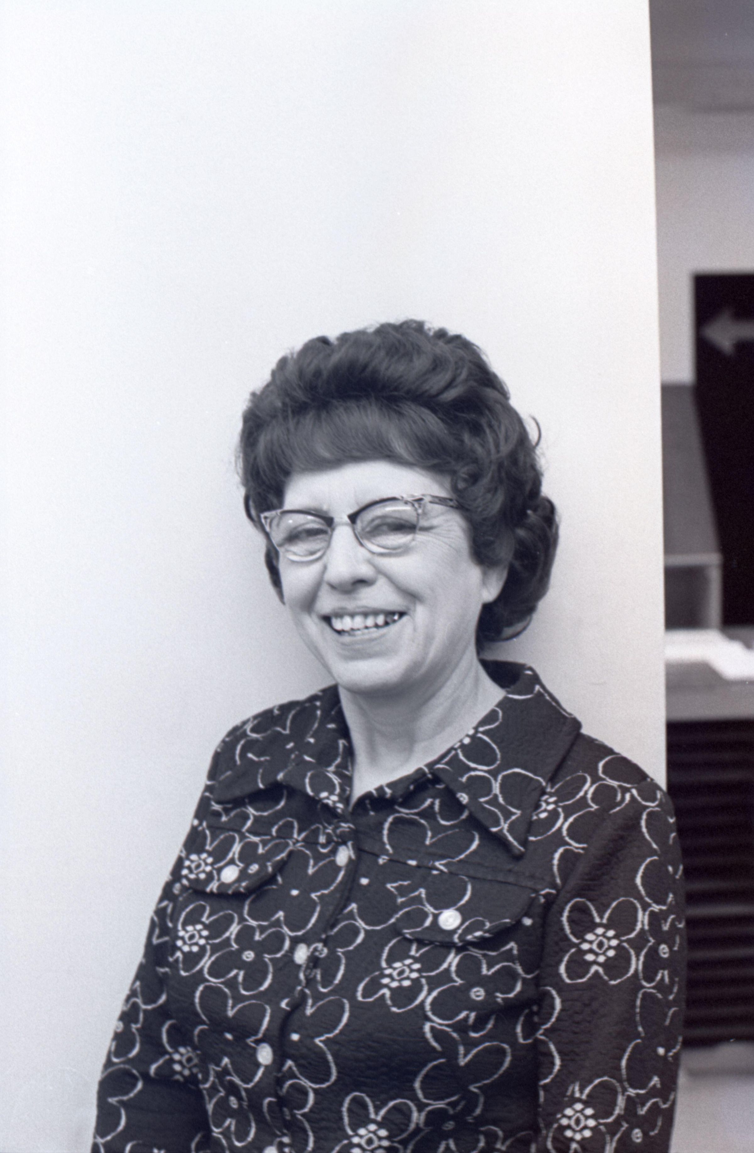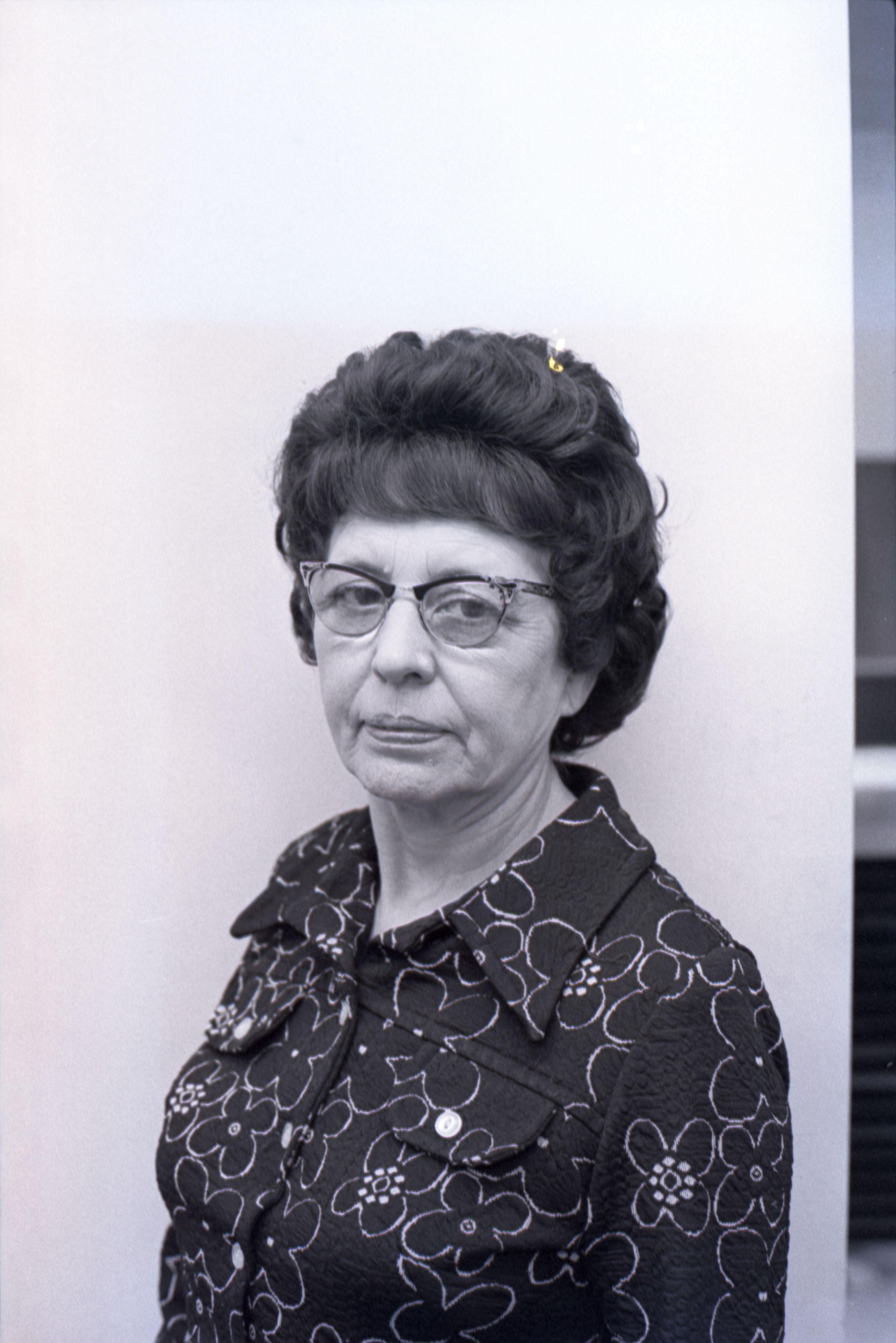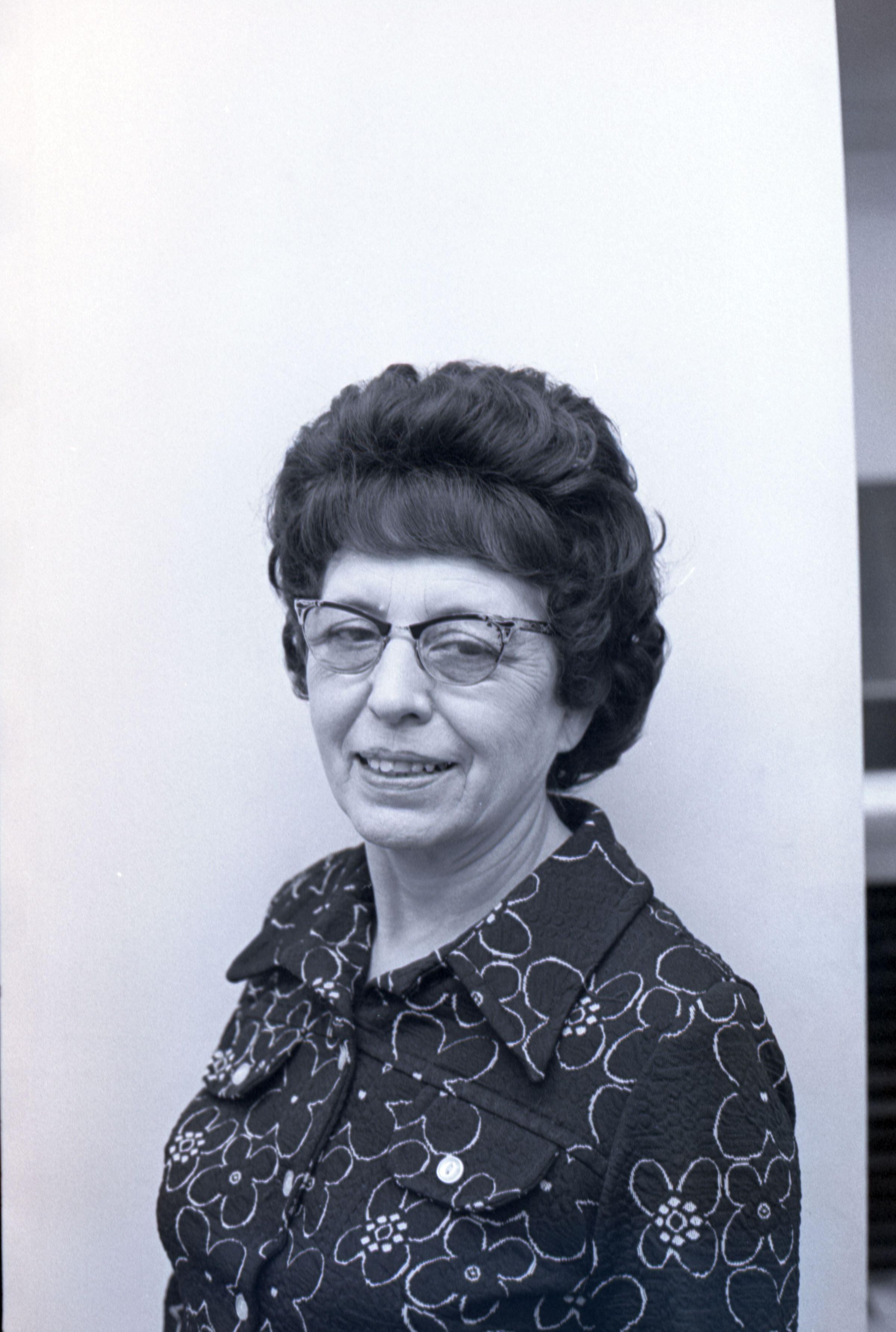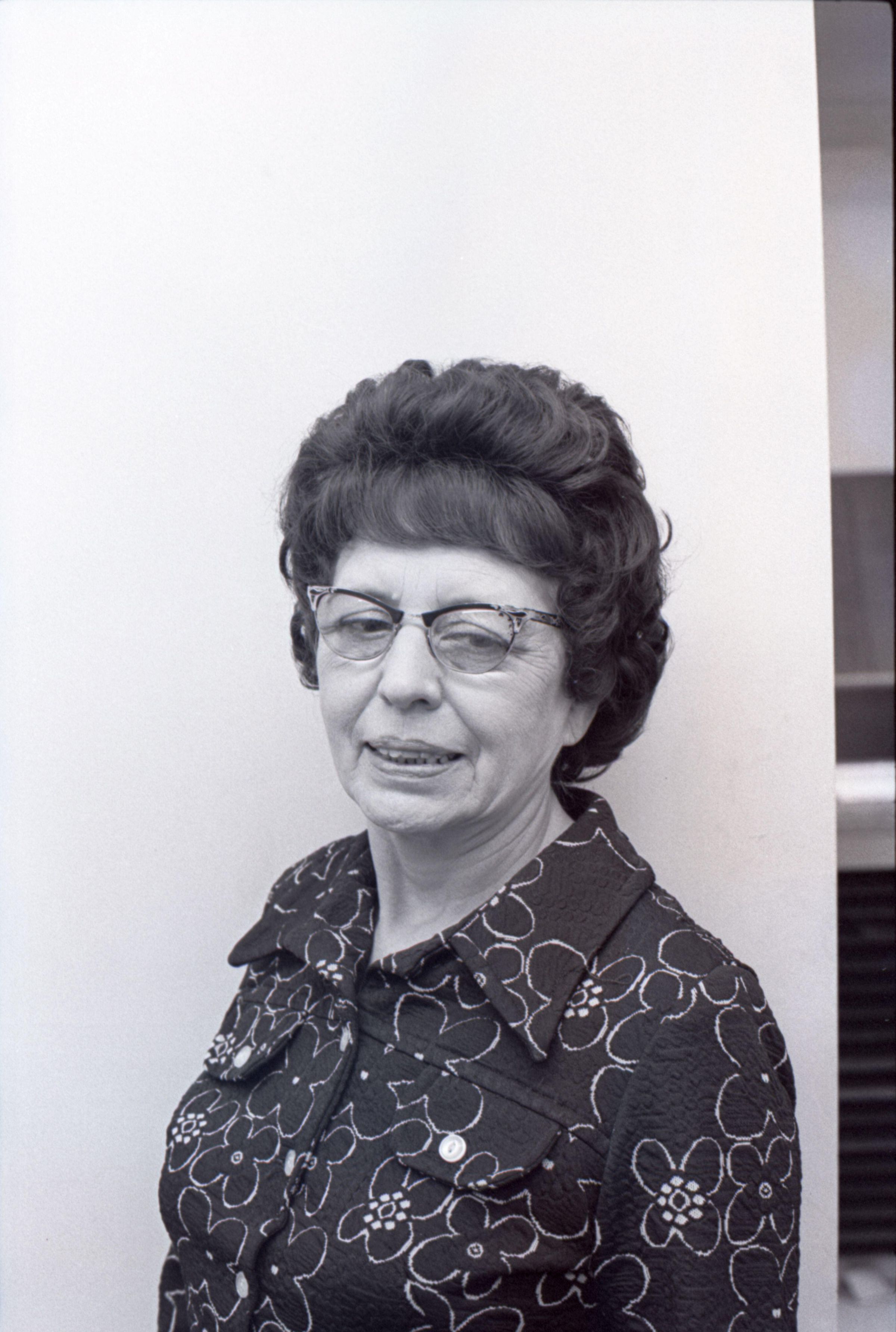 Agnes Kenmir, 1975. These two black and white film negative strips were created for the Lacey Leader newspaper. These images show a woman (Agnes Kenmir) posing for photographs.Made/Created