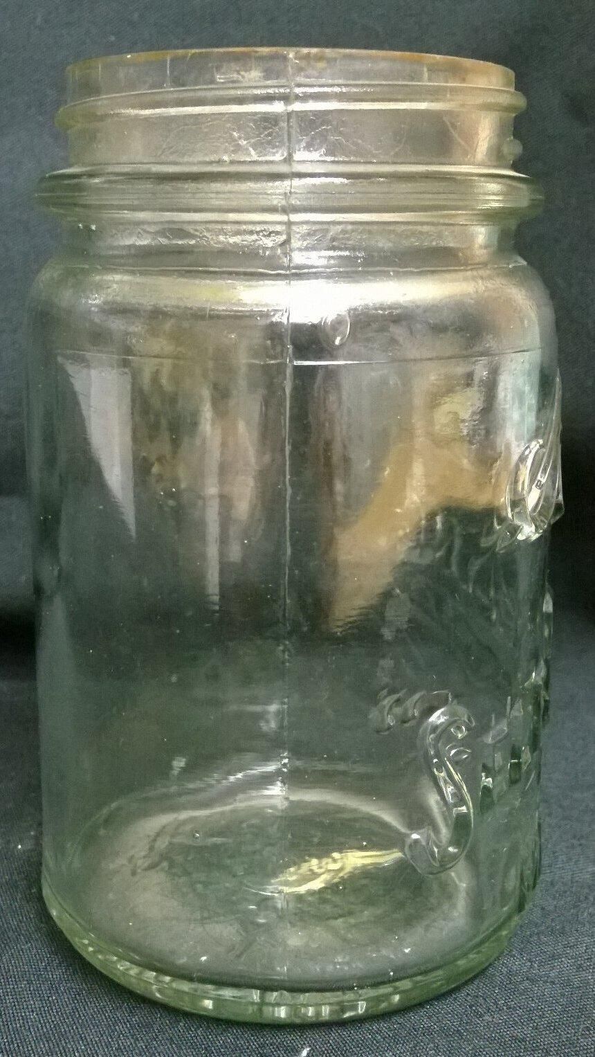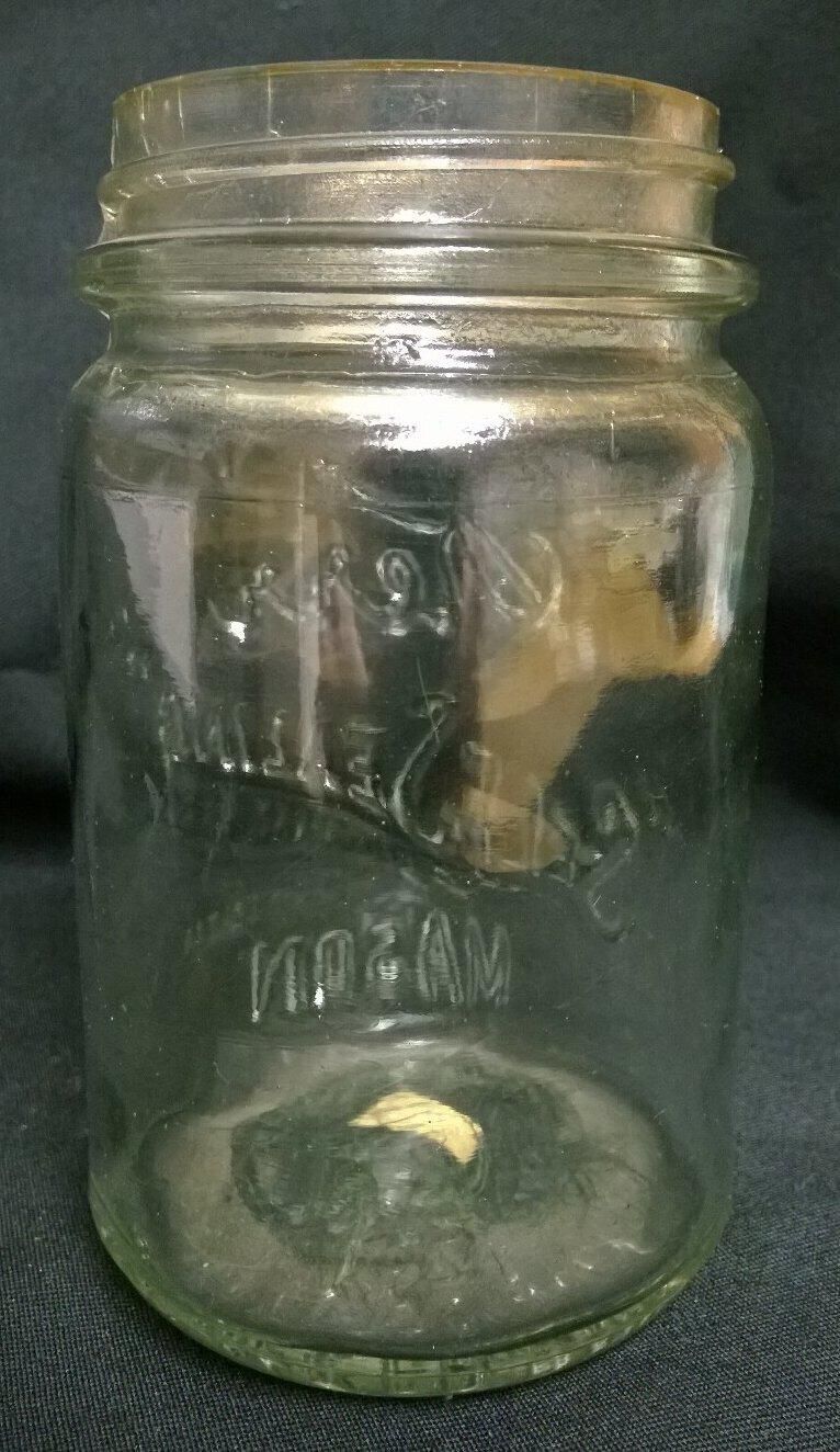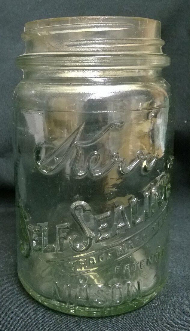Clear glass Kerr one pint preserving jar. The jar is cylindrical in shape with screw threads at the top. The mold seams on the side extend from a horizontal seam on the side very near the bottom and go up to but not over the lip. There is a rough mold line where the top meets the base, and a second smoother line slightly below. Embossed: On the side: "Kerr" "Self Sealing" "trade mark reg" "patented" "Mason". On the bottom: "Kerr Glass Mfg Co" "Sand Springs Okla." "Pat Dec 31 1915".Made/Created