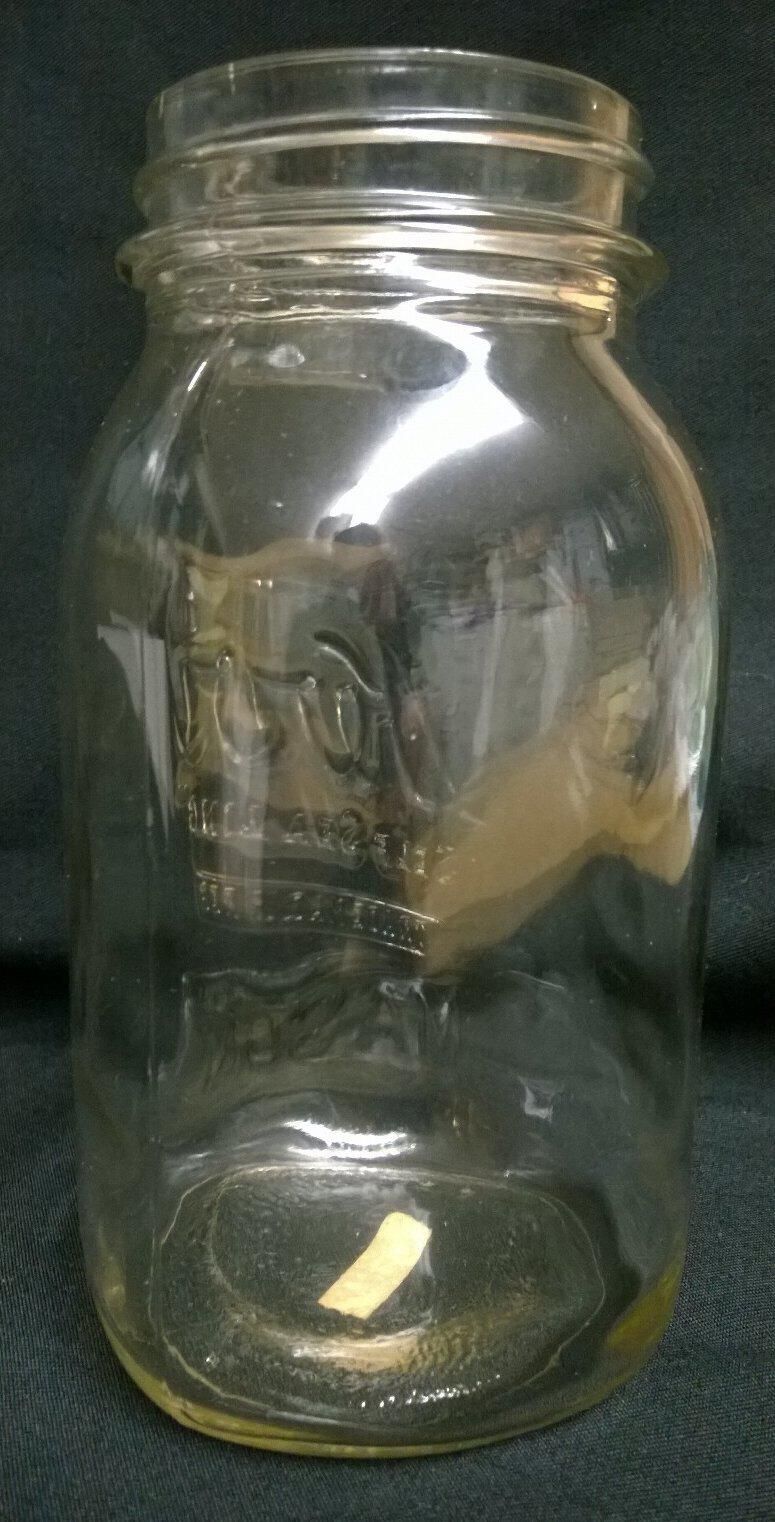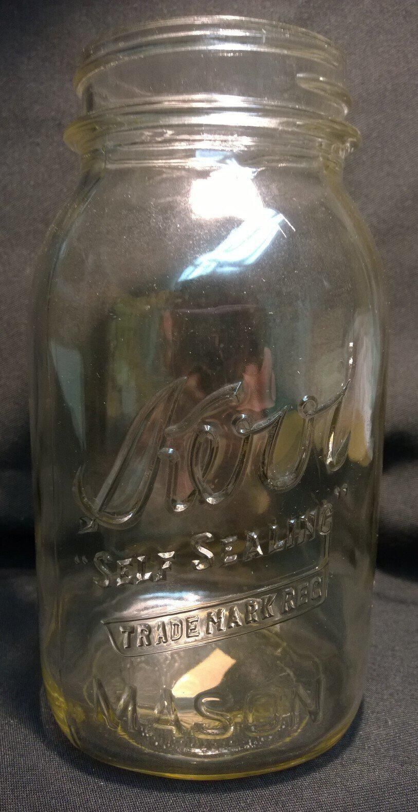Clear glass Kerr one-quart canning jar. The jar is square with rounded corners so that it is almost cylindrical. It has screw threads at the top. The side mold seams extend from a circular seam on the bottom up to but not over the lip. There is also a horizontal seam where the top meets the base. Embossed on side: "Kerr" "Self Sealing" "trade mark reg" "mason" and on bottom: "1".Made/Created