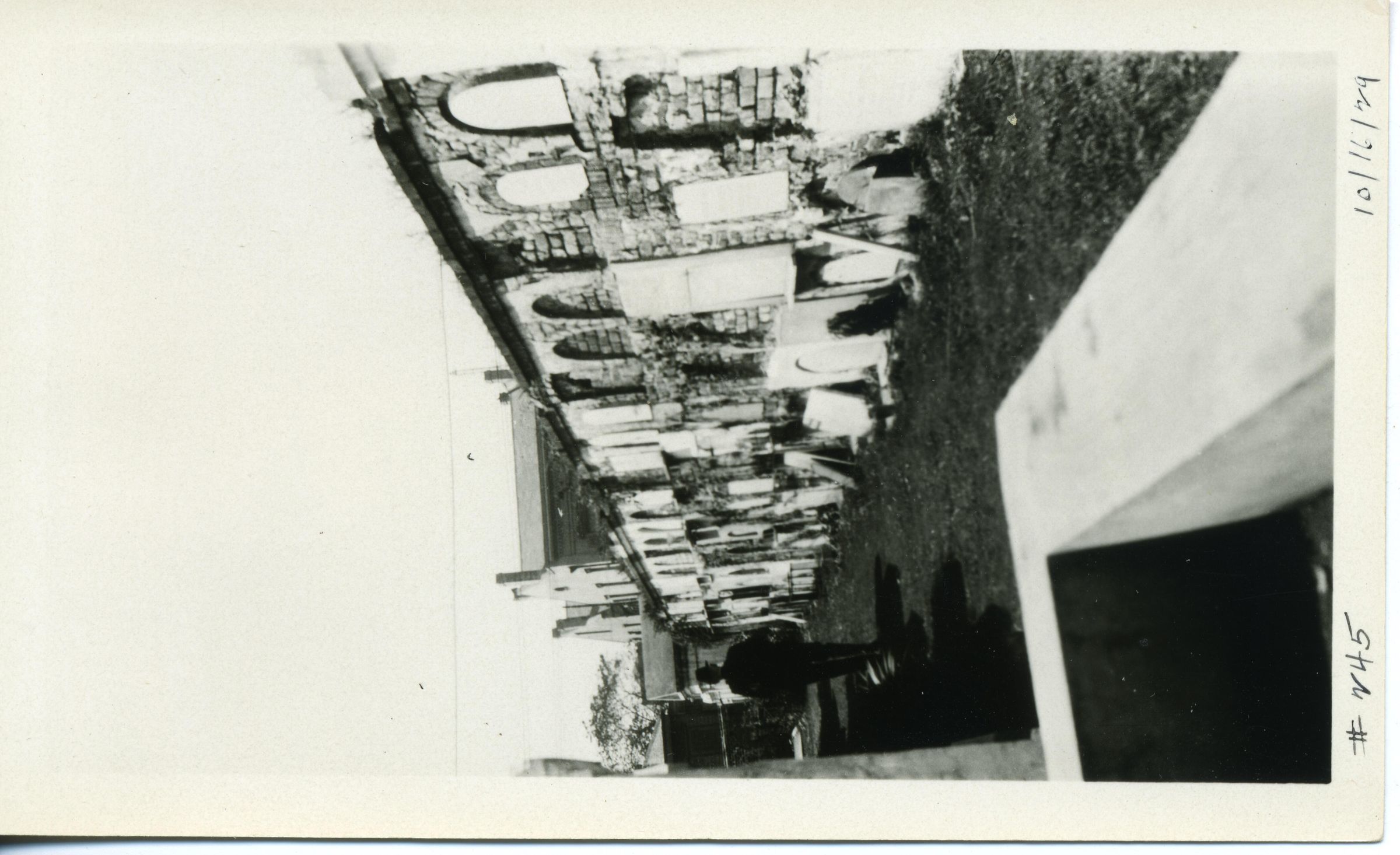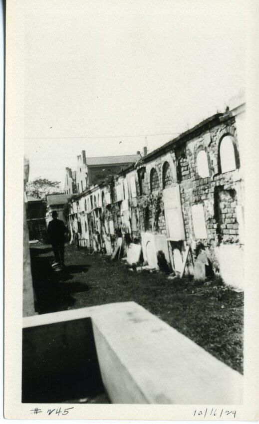 Black and white photo of a cemetery in New Orleans. In the foreground is concrete framework and angling to the left is an unpaved path with a person walking on it. To the right is a row of vaults for burying bodies above ground and behind the row is a building. The vaults are built with stone work and has white flat portions at the openings. The openings are mostly arched shaped.. There is a white border on all sides, and in the bottom border is "#245" and "10/16/29". On the back is "2401".