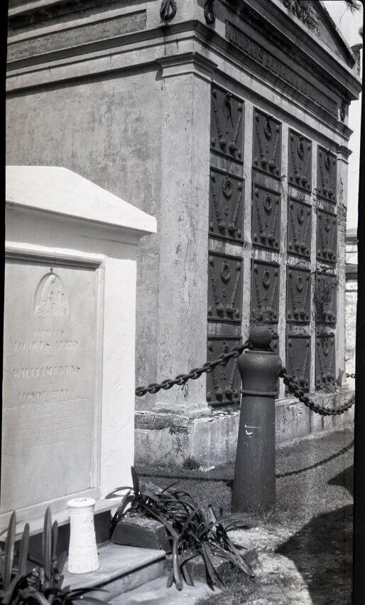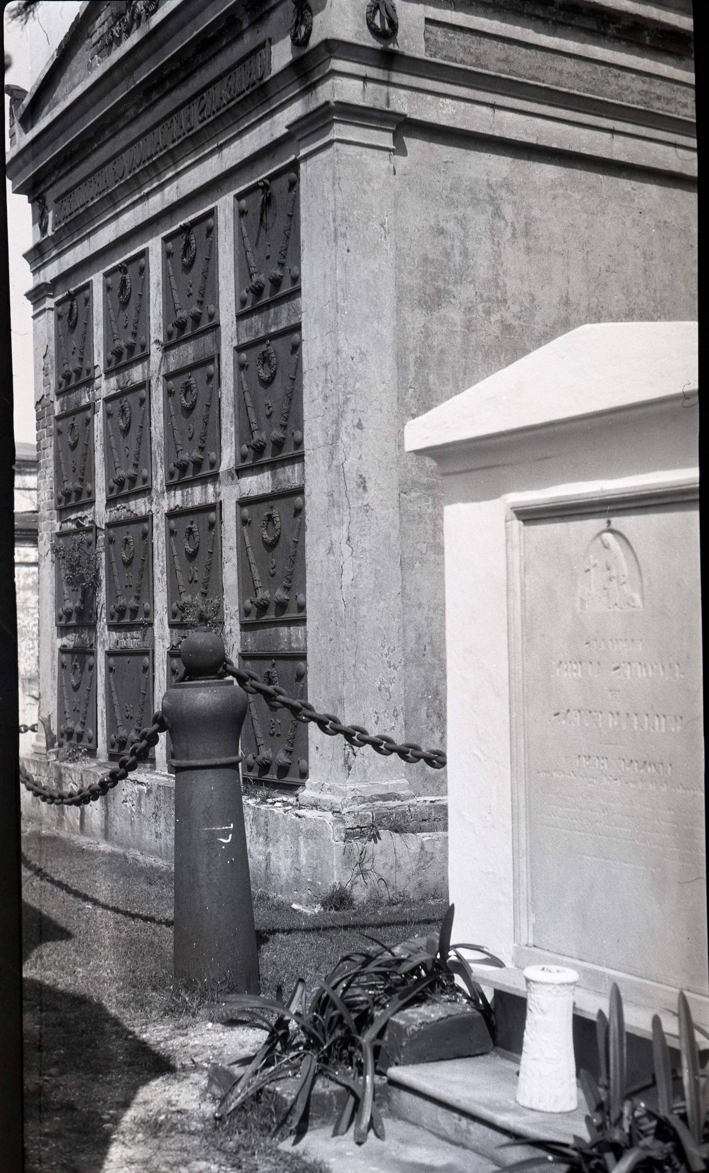Black and white negative of a cemetery in New Orleans. On the left is a white vault with flowers and a vase on the ground next to it. Beyond that is a large dark metal stanchion with chains that are attached but disappear out of sight to the right and left. Behind all that is a large structure with a white wall on the side and 16 metal doors on the front providing spaces for interment. The top of the structure has a gable roof and horizontal ledges that may have writing, but nothing is legible. There is a white border on all sides, and in the bottom border is "#247" and "10/16/29".