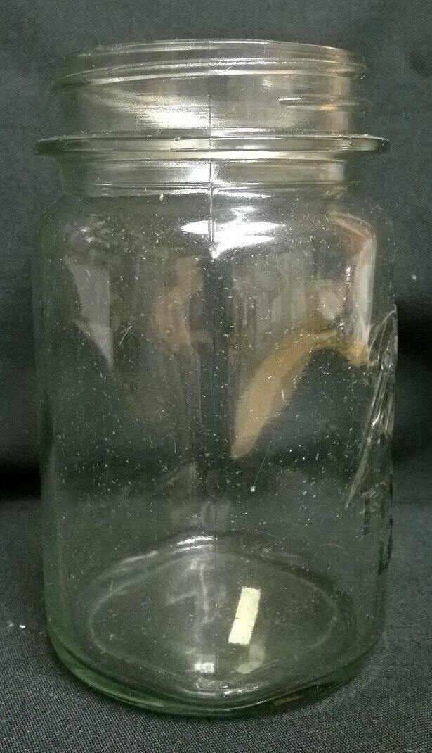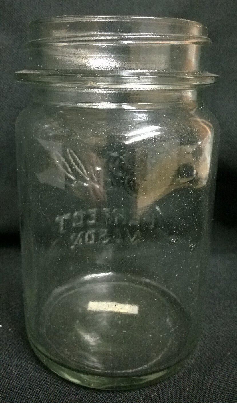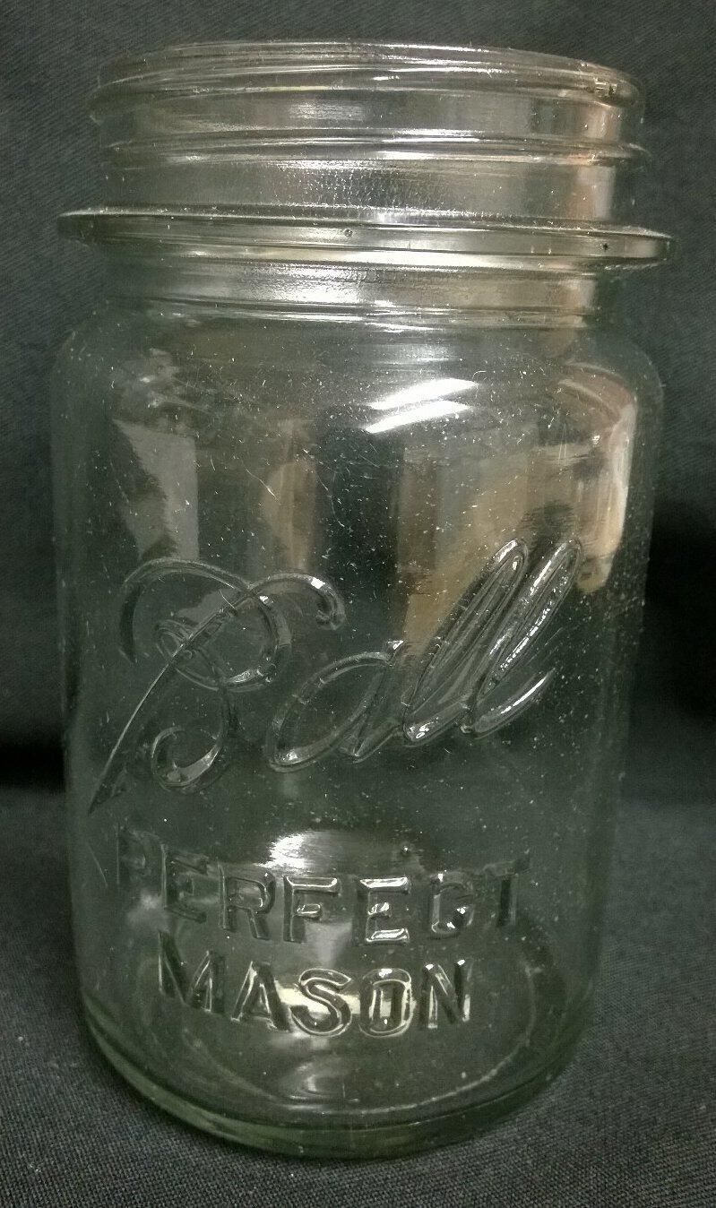Clear glass one-pint canning jar with screw threads for a screw-on lid. There are mold seams on the sides that extend from a horizontal seam on the bottom up to and over the lip. There is also a horizontal seam at the shoulder where the top is attached. Embossed on the side: "Ball" "perfect mason". On the bottom: "4".Made/Created