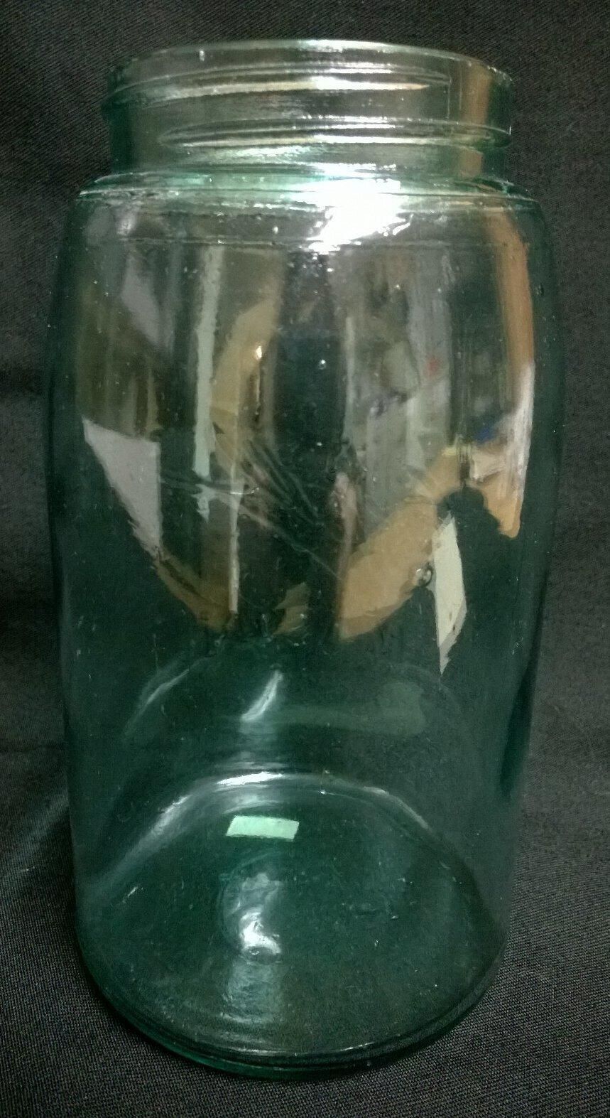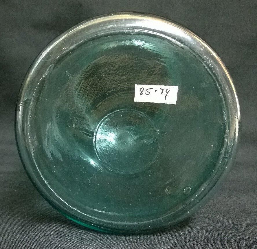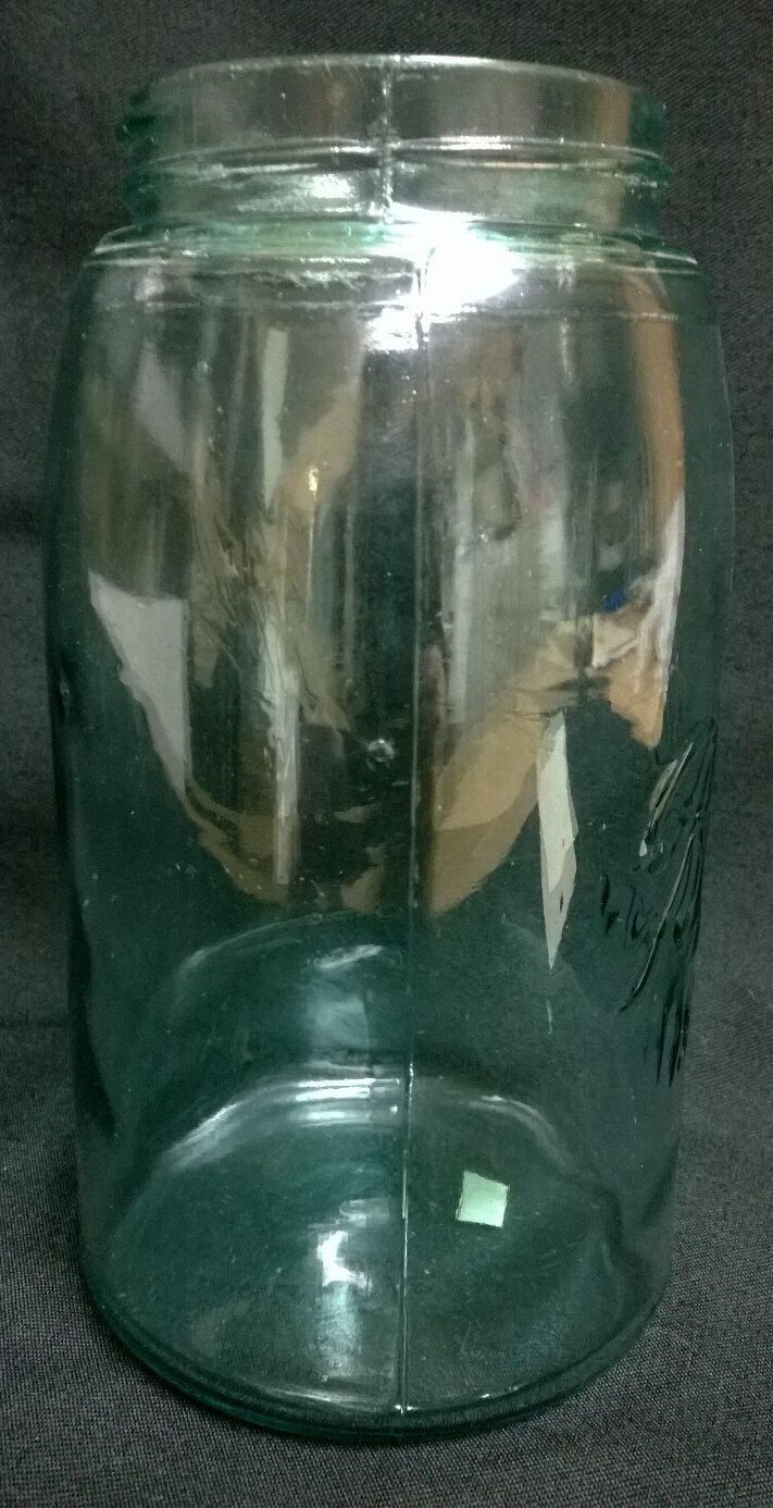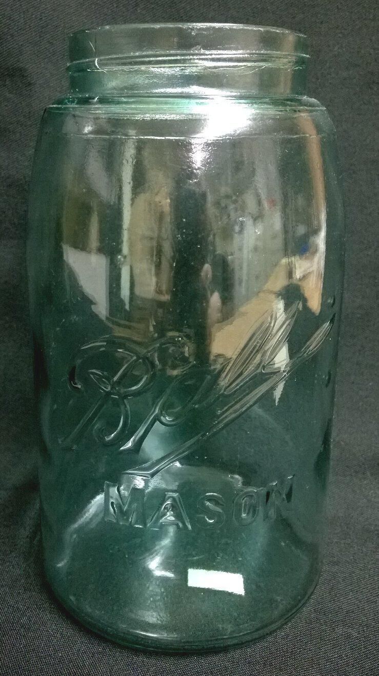 Blue glass Ball one-quart canning jar with screw threads. The jar is cylindrical with threads at the top for a screw lid. Mold seams on the side extend from a horizontal seam on the bottom up to but not over the lip. There is also a seam where the top is joined to the base, and a small circular mark or scar near the center of the bottom. Embossed on the side "Ball" "mason" and on the bottom "J".