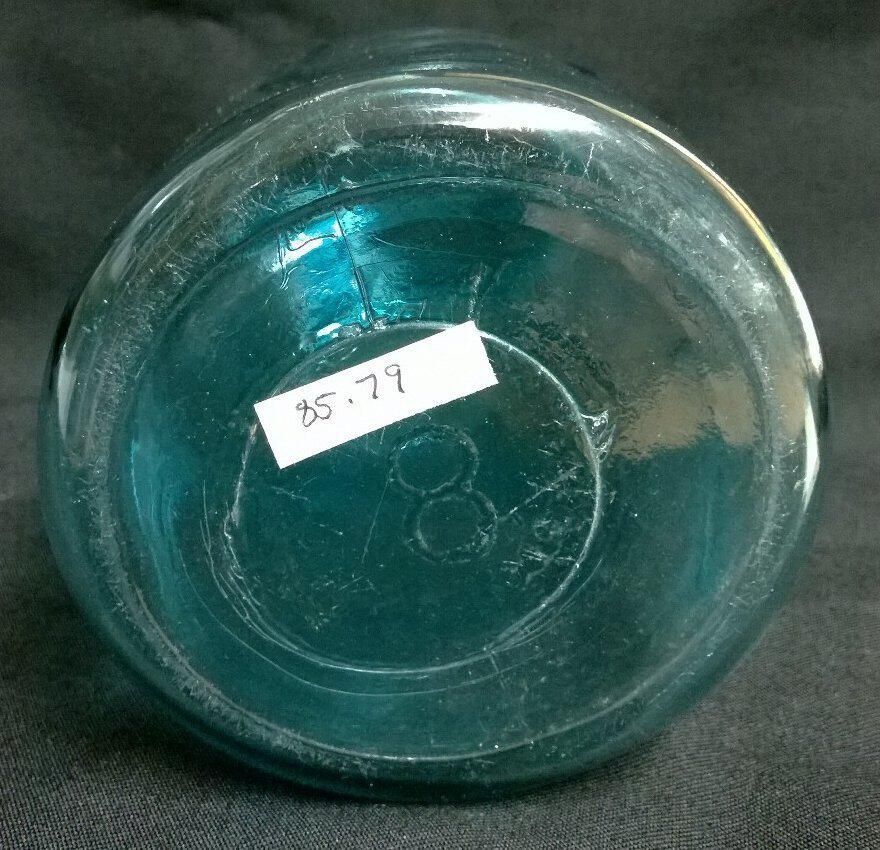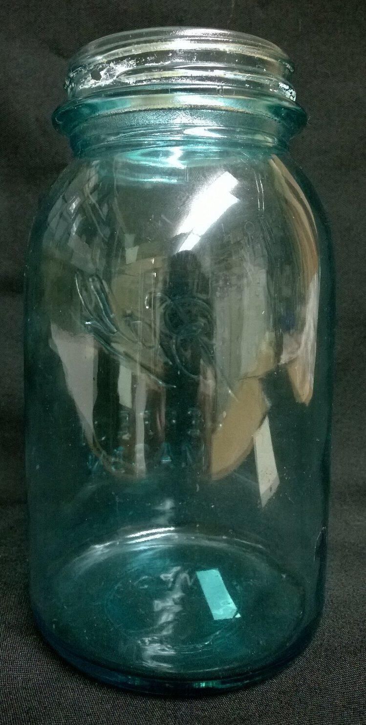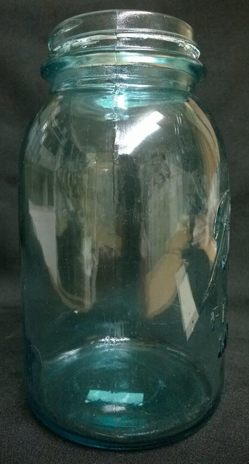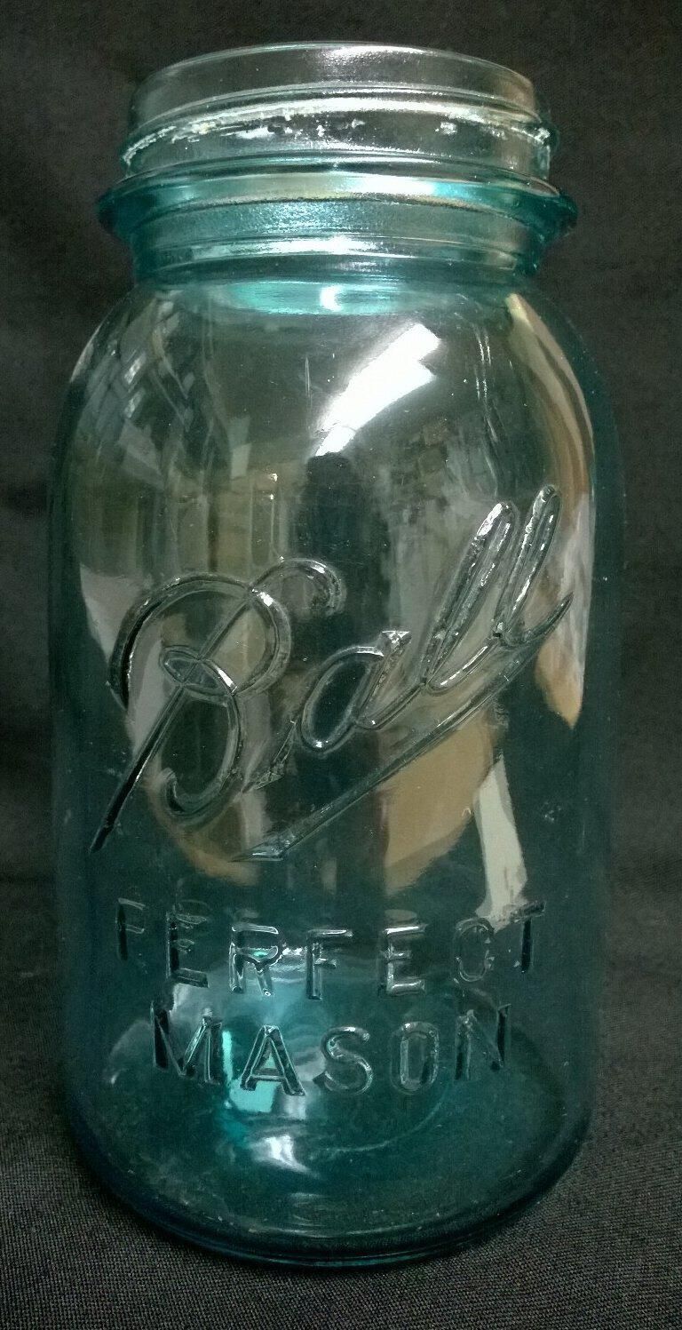 Blue glass Ball one-quart canning jar with screw threads. The jar is cylindrical with threads at the top for a screw lid. Mold seams on the side extend from a horizontal seam on the bottom up to and over the lip. There is also a seam where the top is joined to the base. Embossed on the side "Ball" "perfect mason" and on the bottom "8".Made/Created