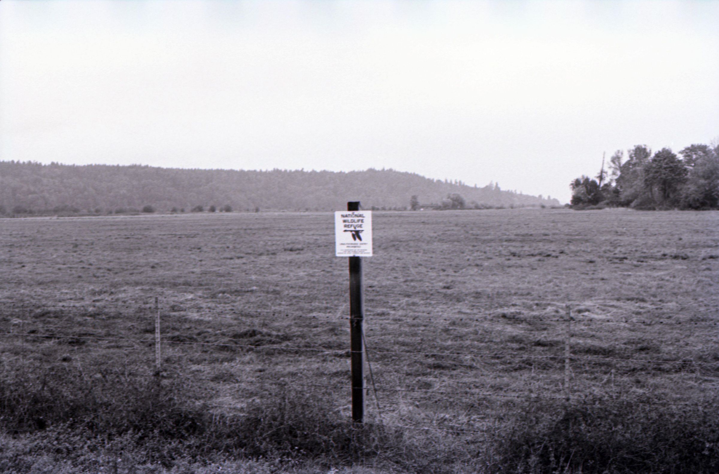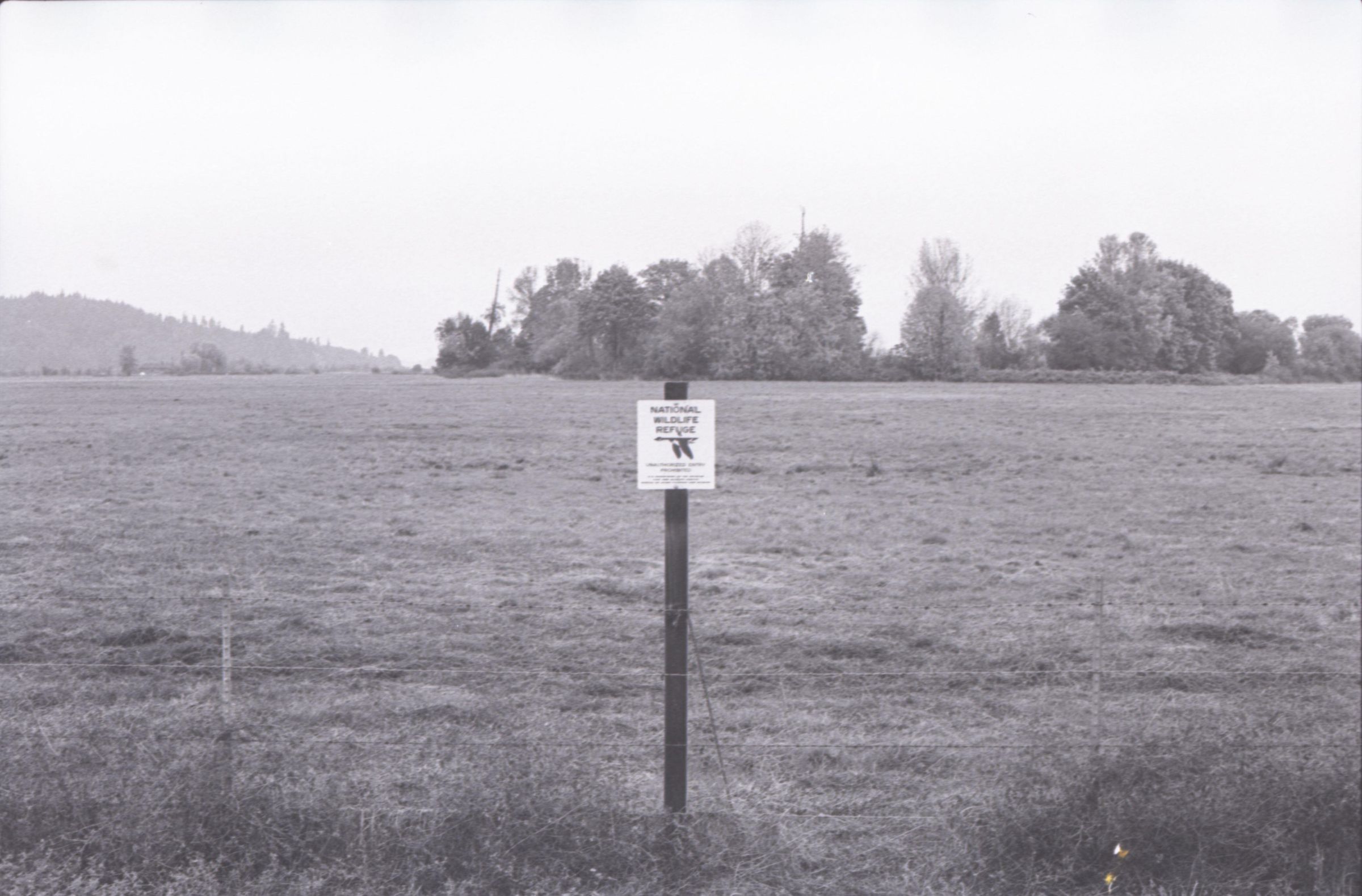 Nisqually Delta, Unknown Date. This single black and white film negative strip was created for the Lacey Leader newspaper. These images show a sign on a fence post at the edge of a large field.Made/Created