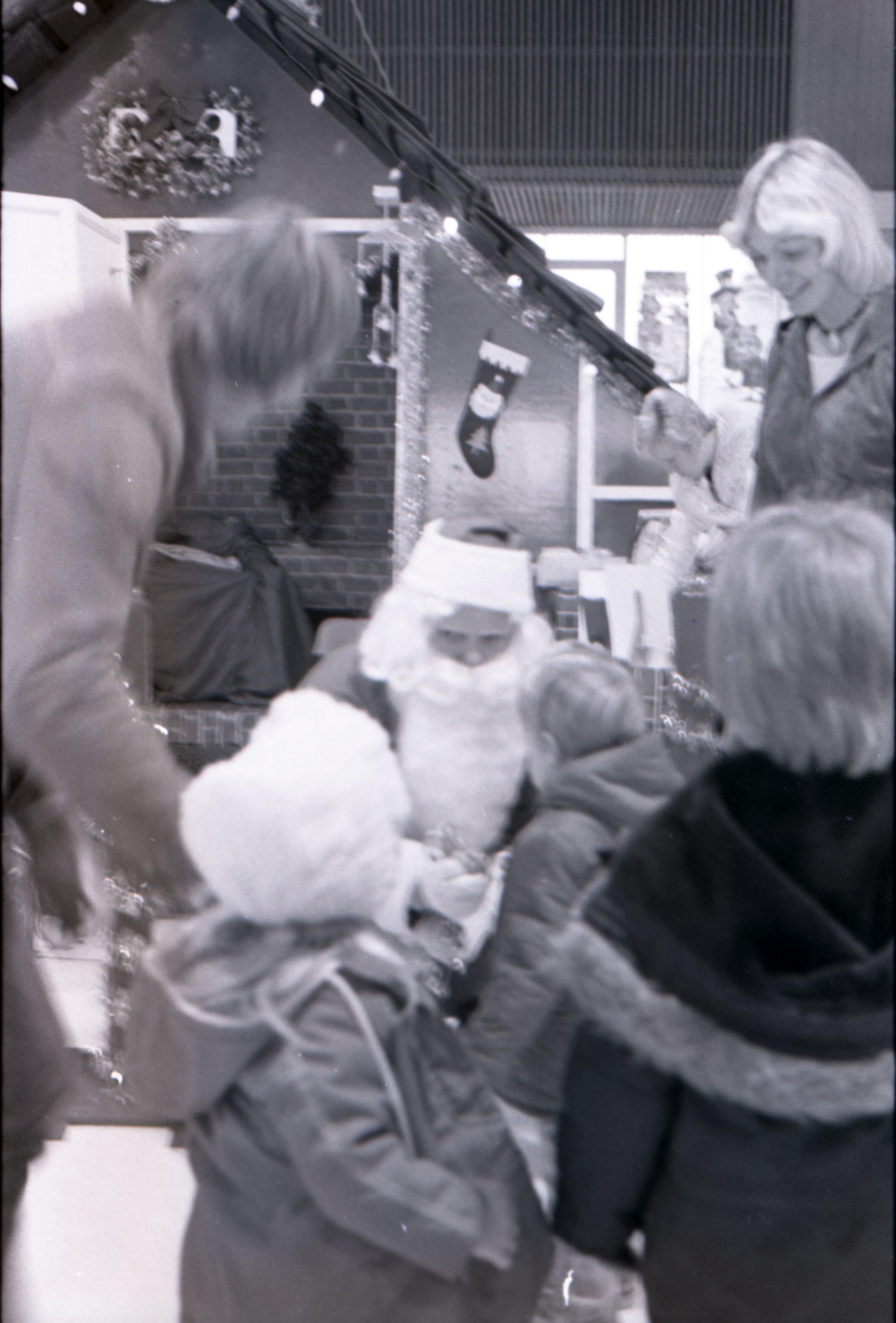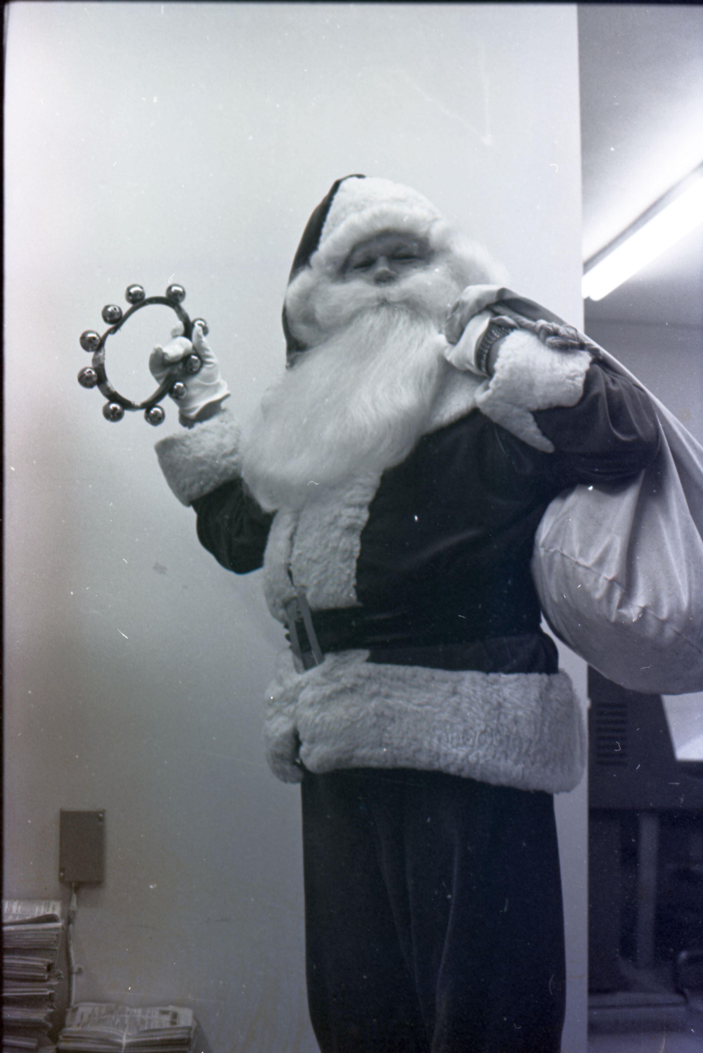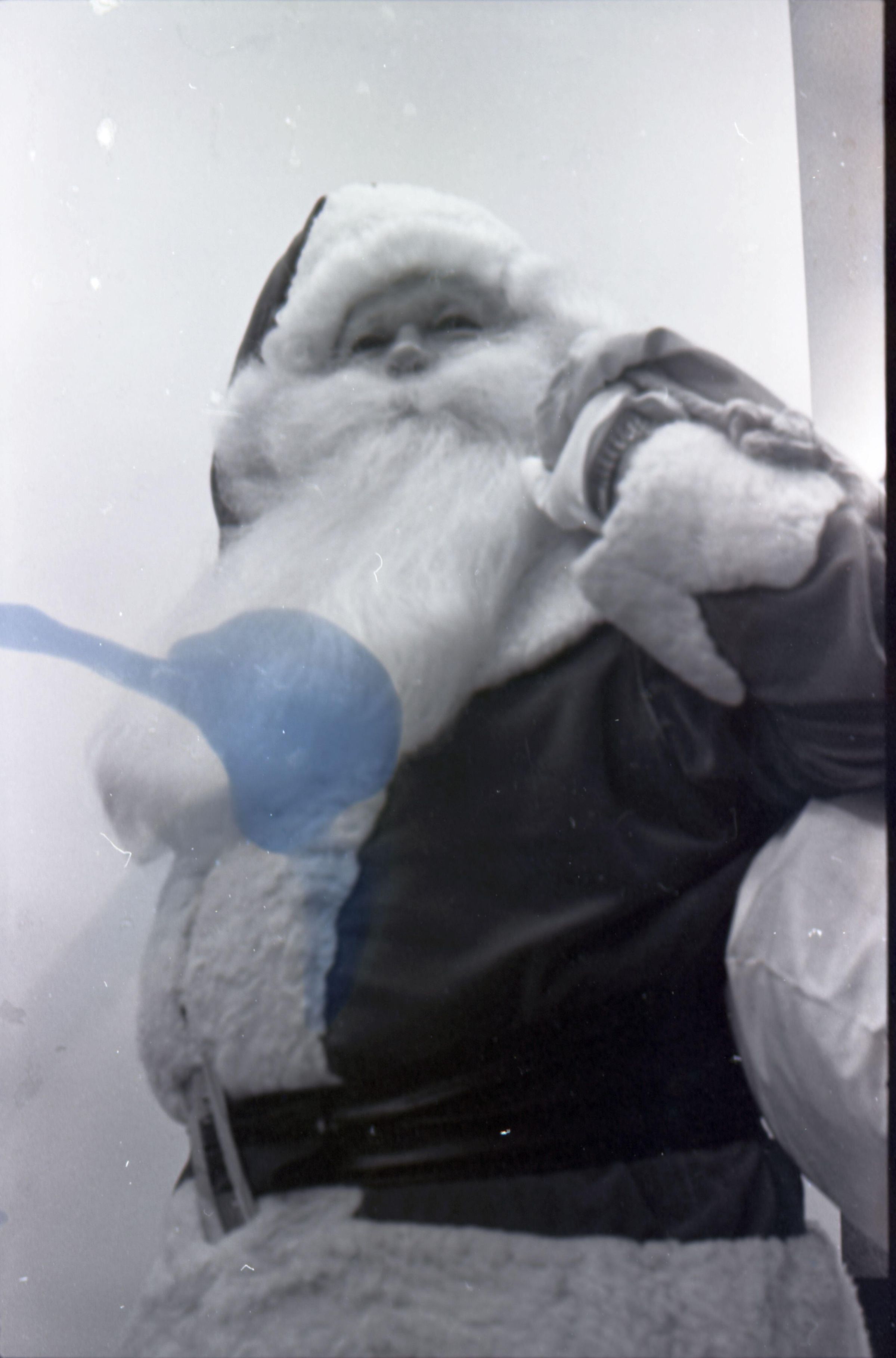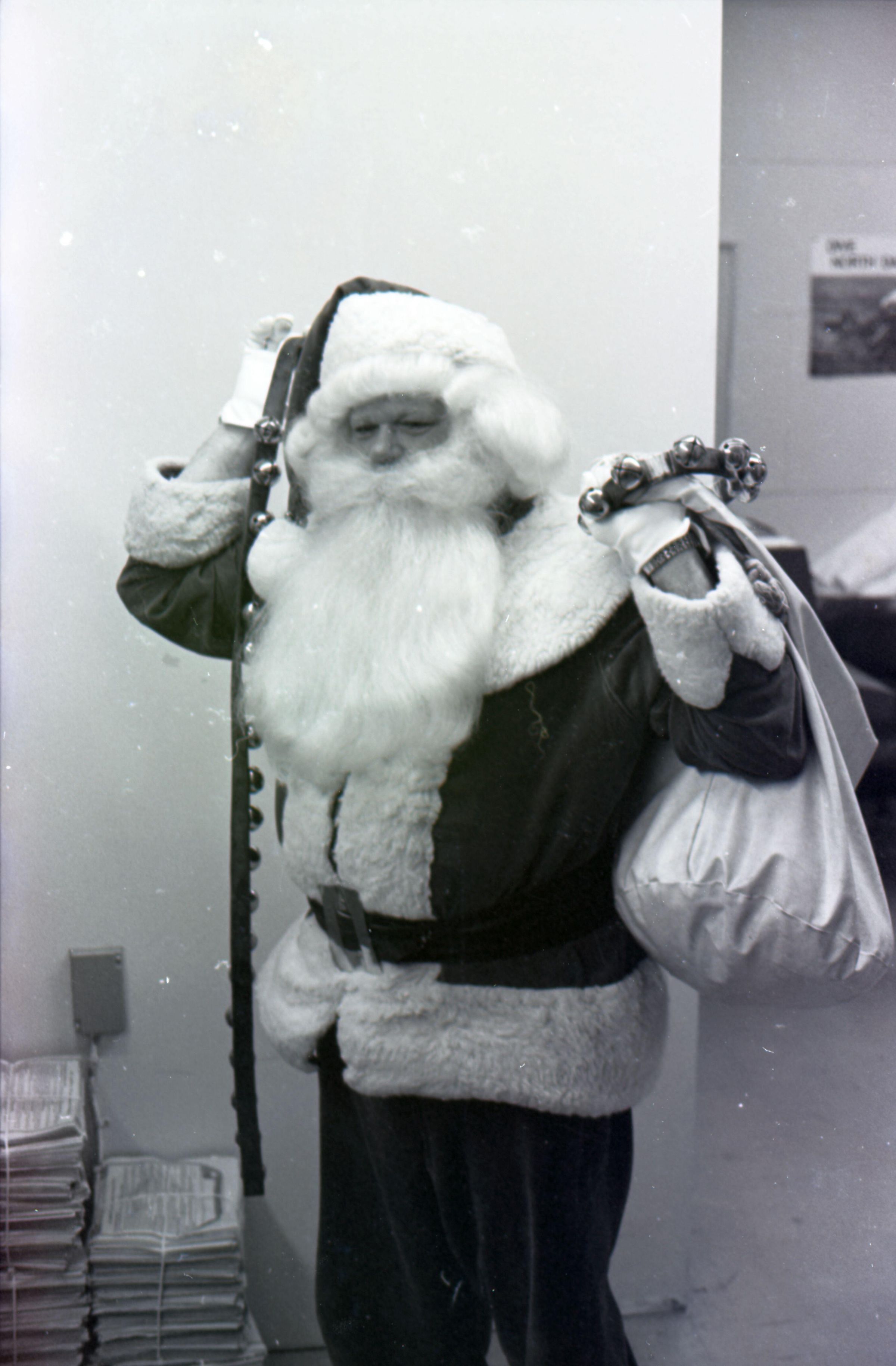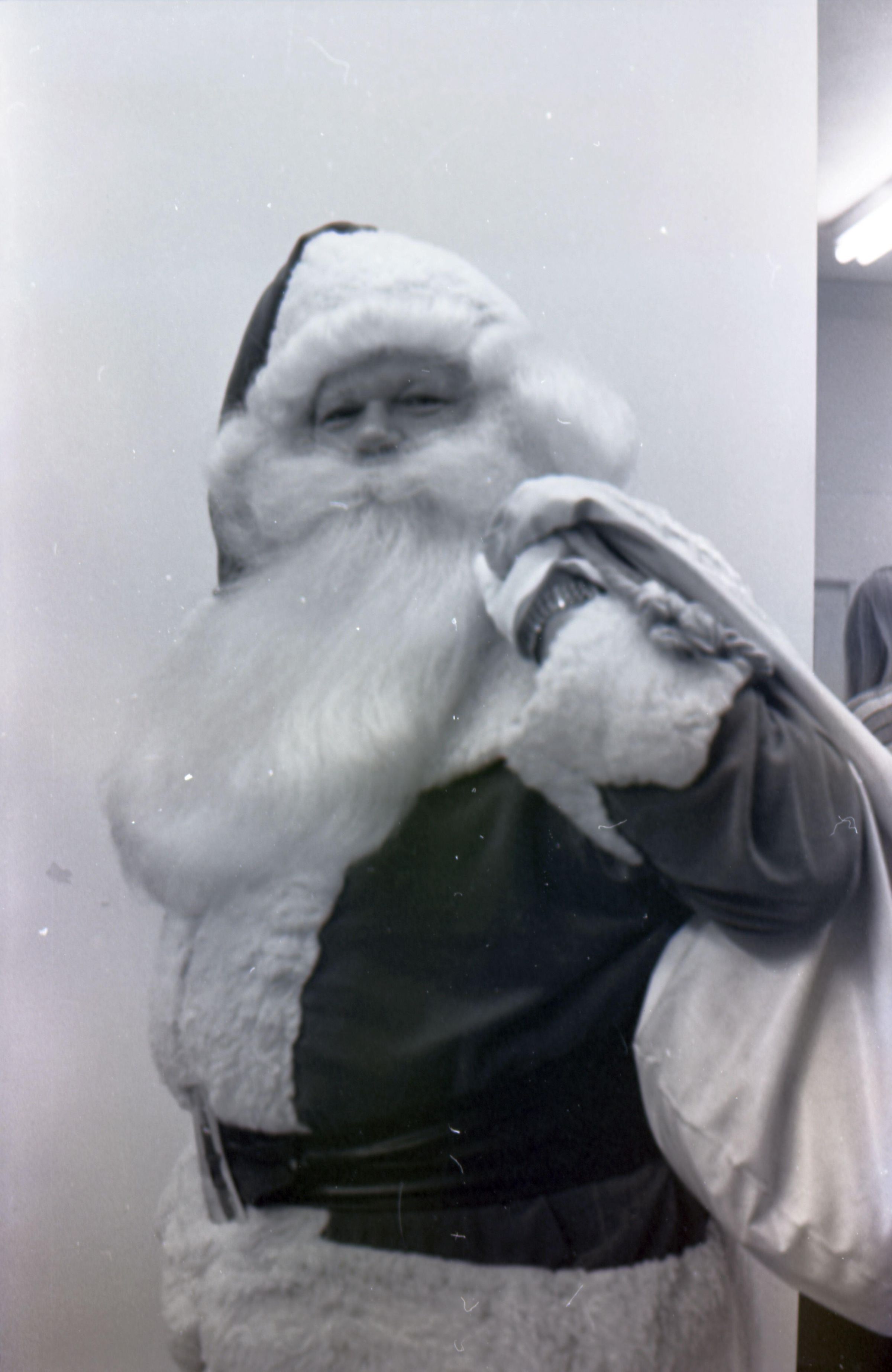 Freeman Rose, 1976. These three black and white film negative strips were created for the Lacey Leader newspaper. These images show a man (Freeman Rose) dressed as Santa Claus posing individually for photos, an unknown man with a mustache, and Freeman Rose dressed as Santa Claus meeting children.Made/Created