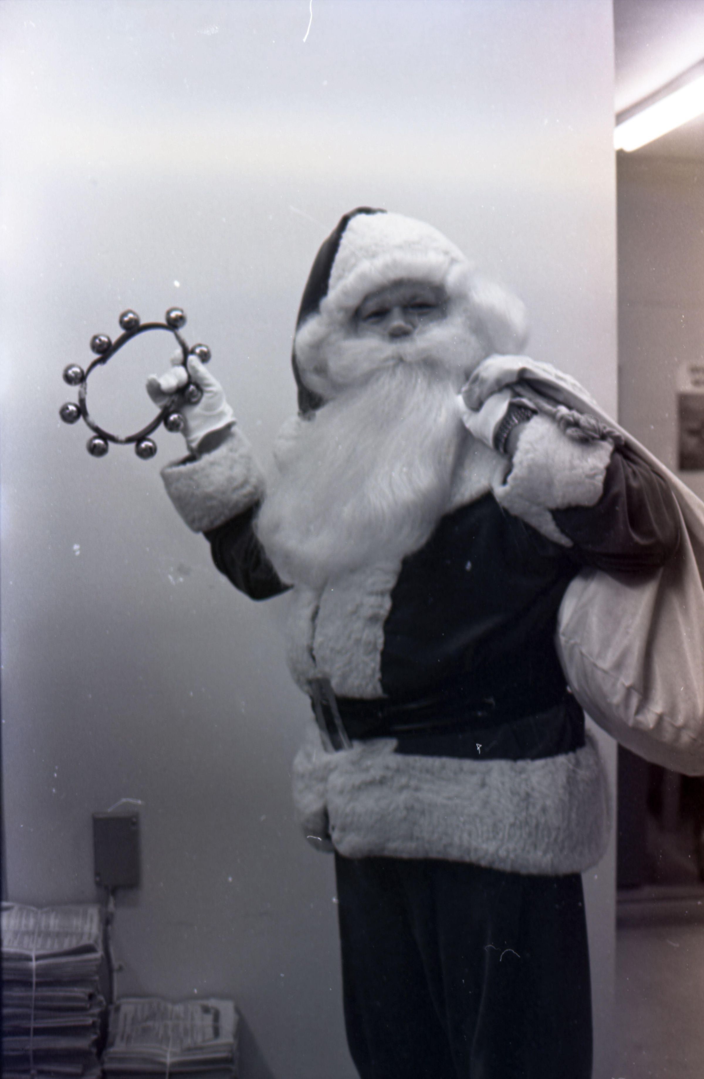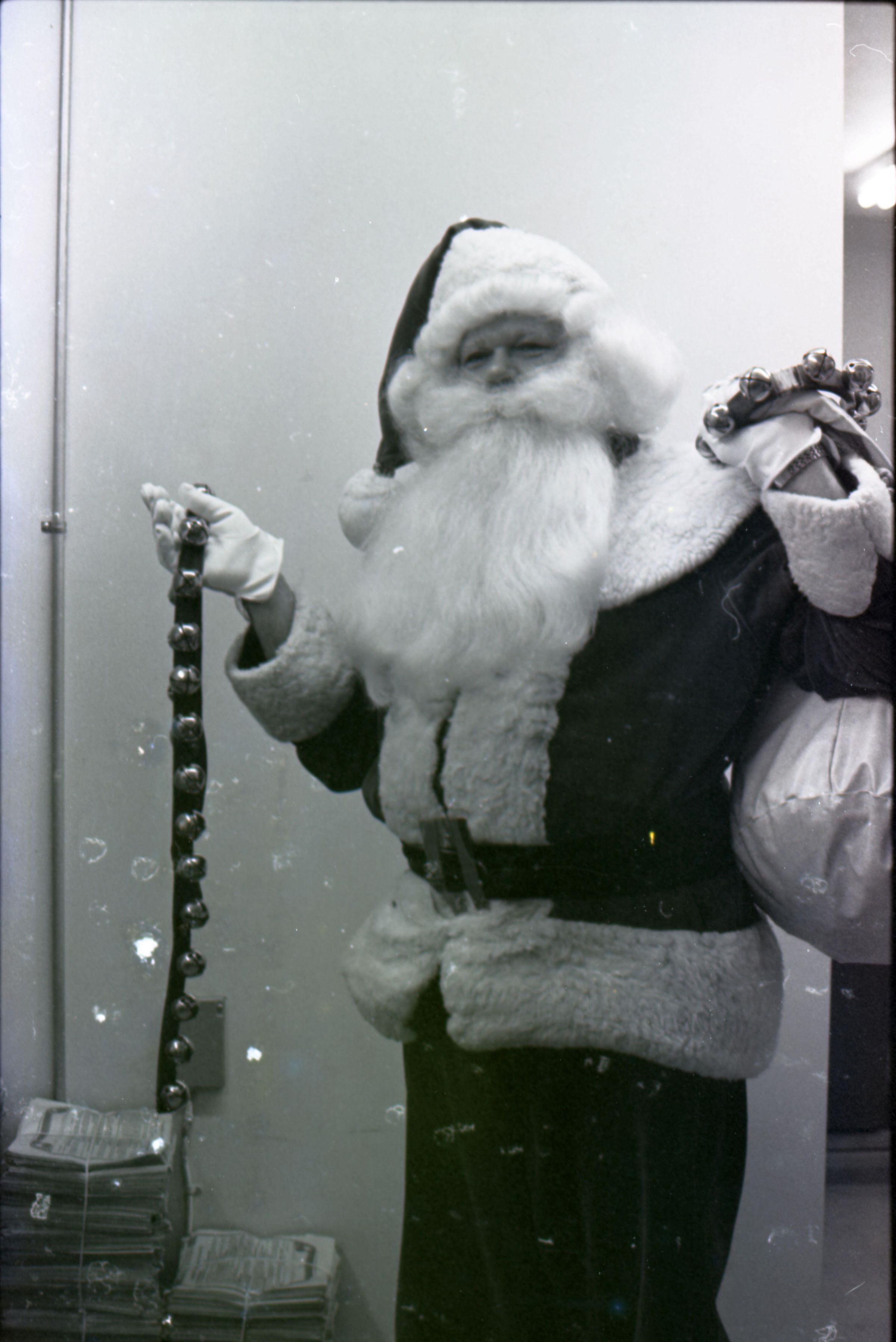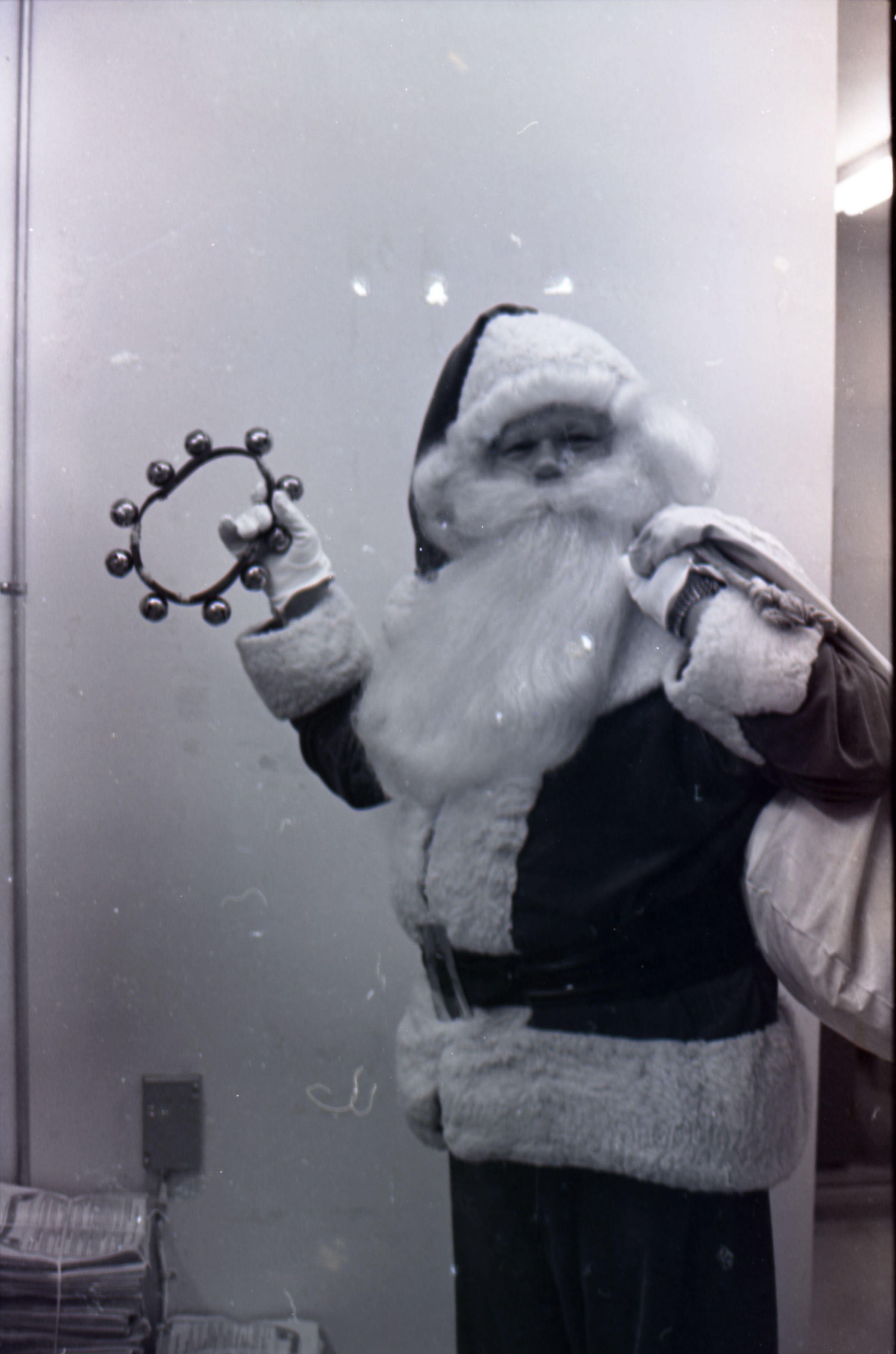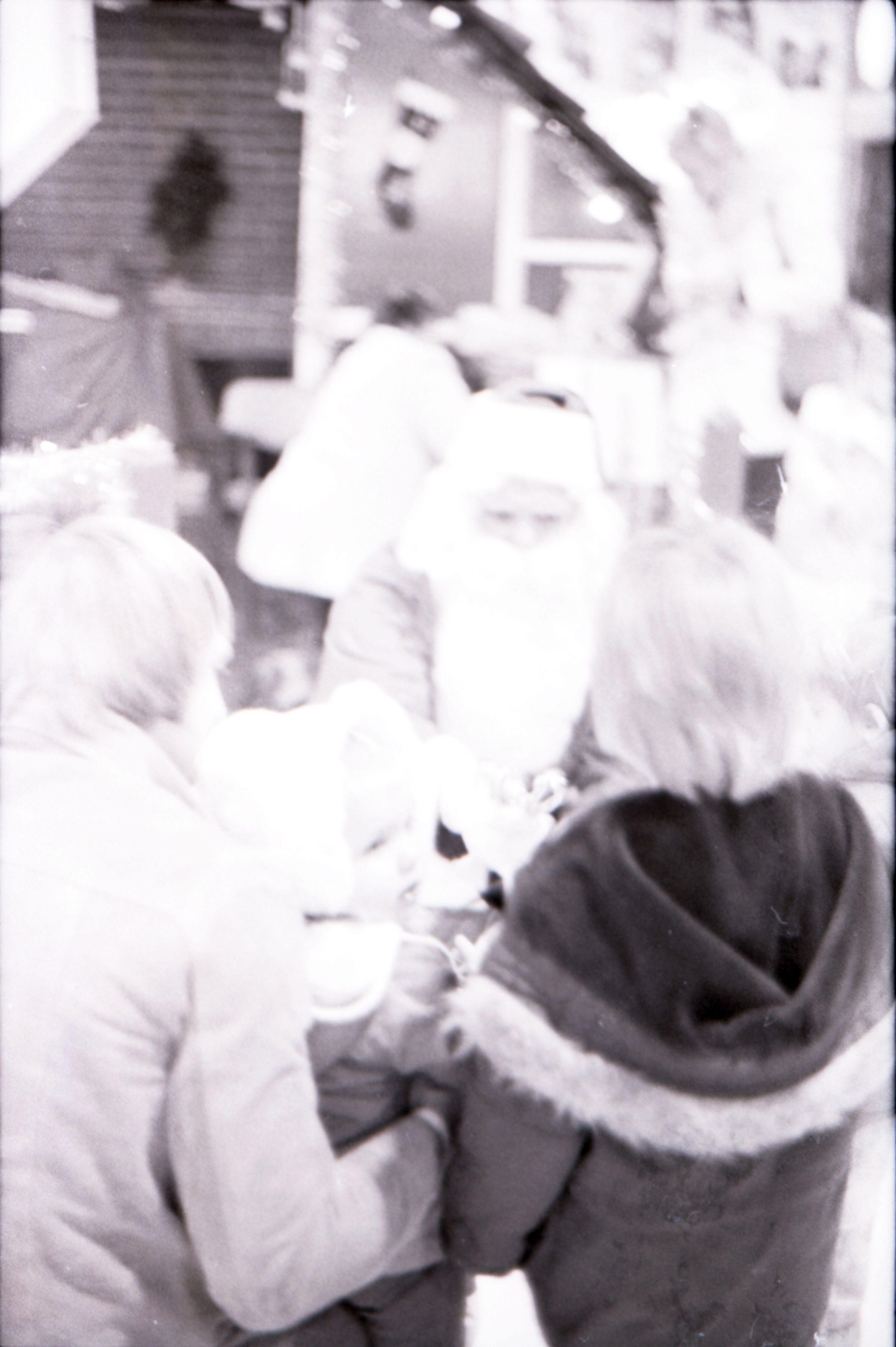 Freeman Rose, 1976. These three black and white film negative strips were created for the Lacey Leader newspaper. These images show a man (Freeman Rose) dressed as Santa Claus posing individually for photos, an unknown man with a mustache, and Freeman Rose dressed as Santa Claus meeting children.Made/Created