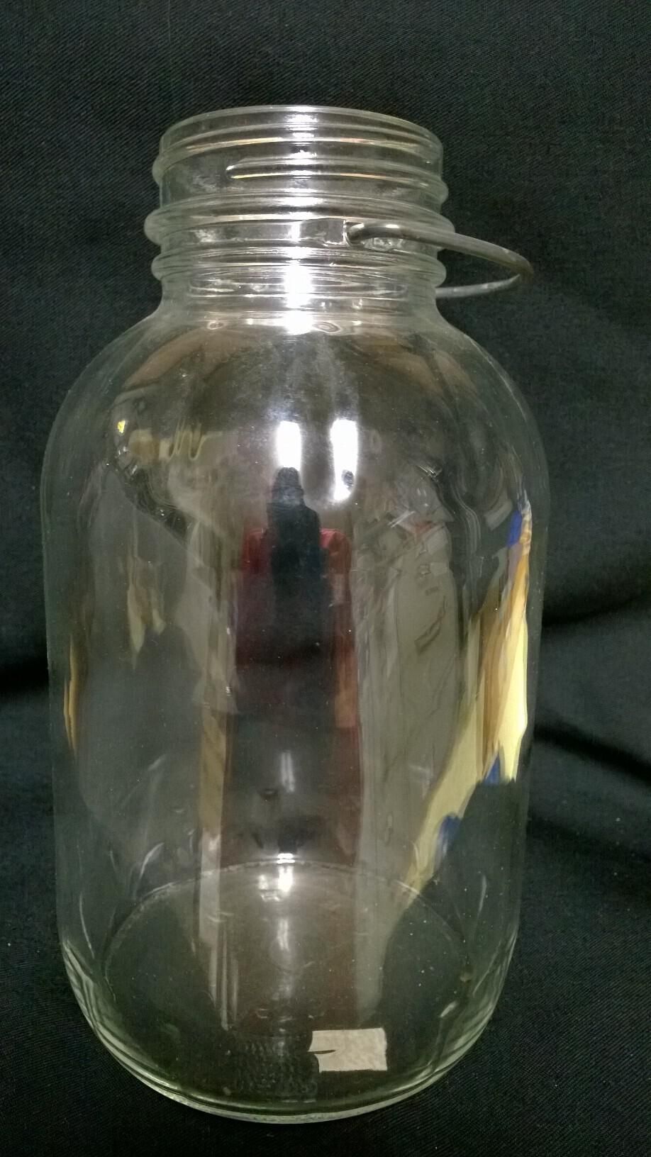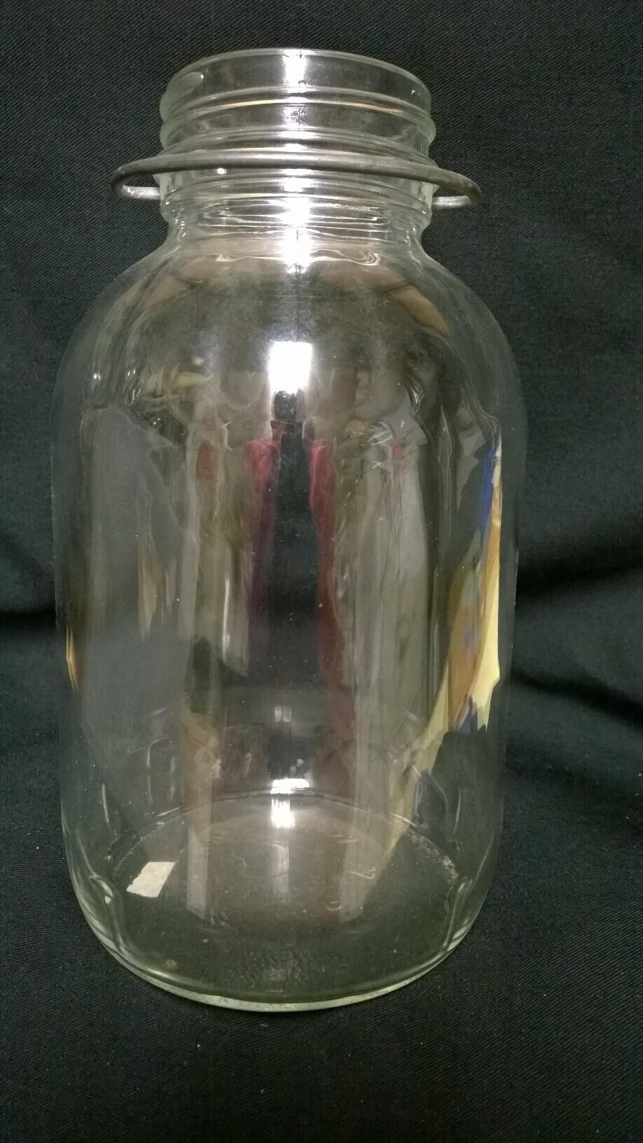 Clear glass 2 quart canning jar with screw threads at the top for a screw-on lid, and a wire carrying handle. The jar is identified as a canning jar by the fact that it has the Hazel-Atlas symbol (a large capital letter "H" with a smaller capital "A" positioned underneath the H, appearing somewhat like a small step-stool or bench) embossed on the bottom. The jar is cylindrical with side mold seams extending from a horizontal bottom seam up to and over the lip. There is also a horizontal seam where the top is attached to the base. The shoulder area has decorative grooves. Embossed on the bottom: "M" then the Hazel-Atlas symbol, then "8". Also embossed on the bottom "6565".Made/Created