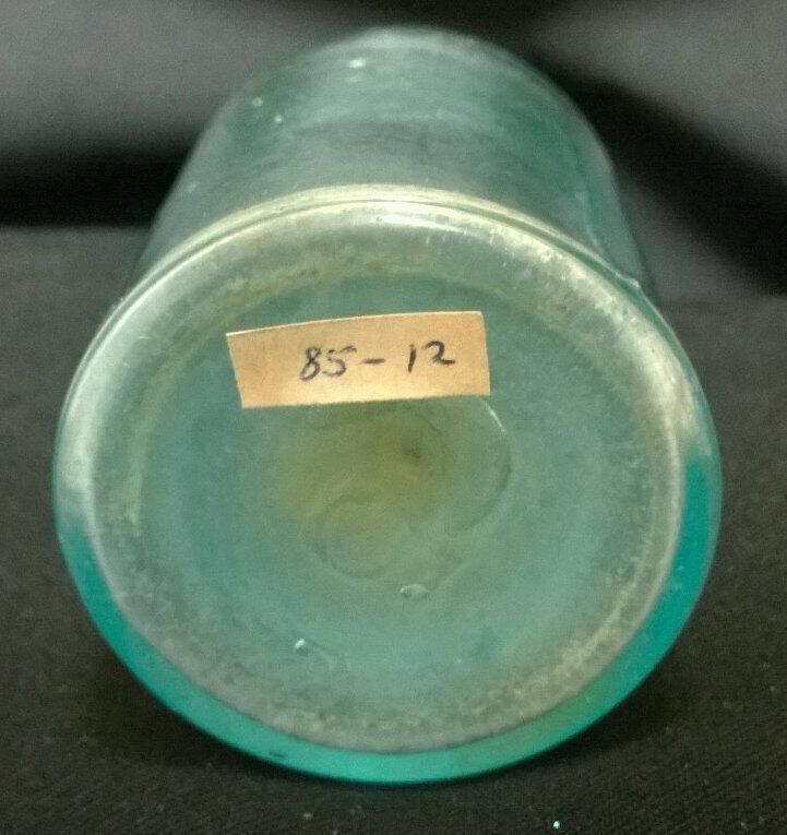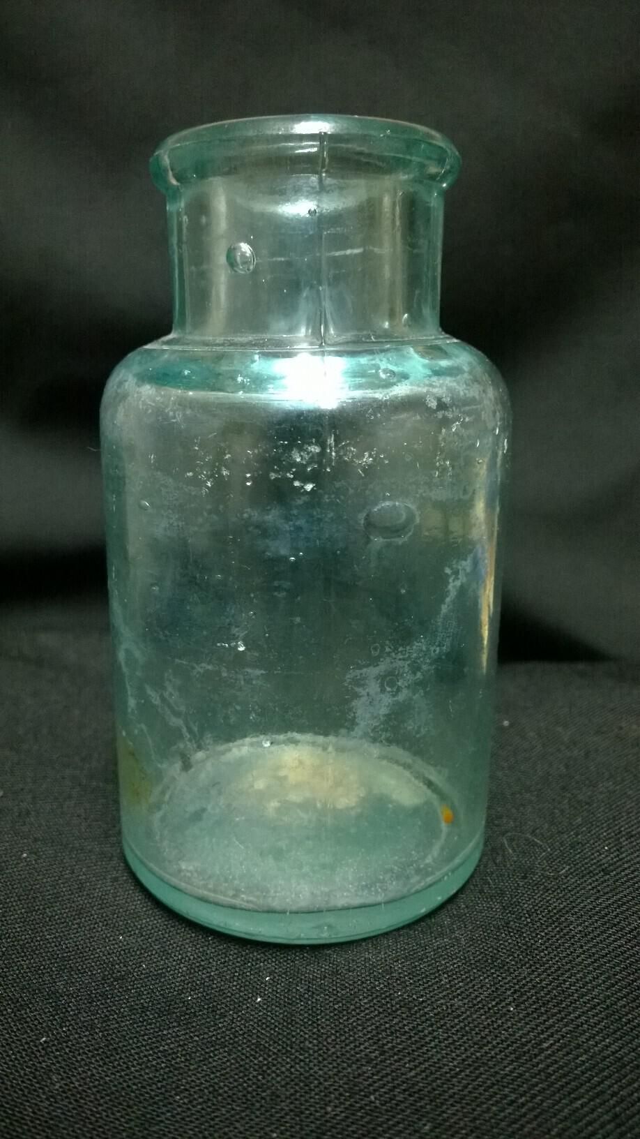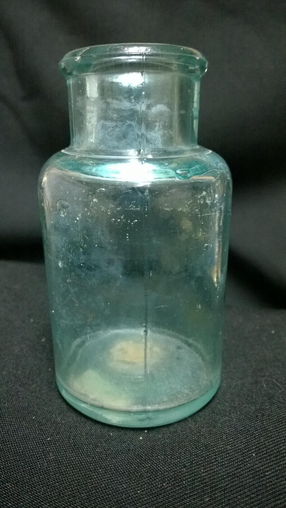 Light blue glass prescription bottle without screw threads (intended for use with a stopper) The bottle has a rounded shoulder below the neck. Mold seams extend from the bottom horizontal seam up to but not over the lip. There is a horizontal seam at the top of the shoulder below the neck, and a horizontal seam at the bottom. There are air bubbles in the glass. Nothing embossed on the side. "5" embossed on bottom. These bottles were used by druggists to dispense serum and other medicines.Made/Created