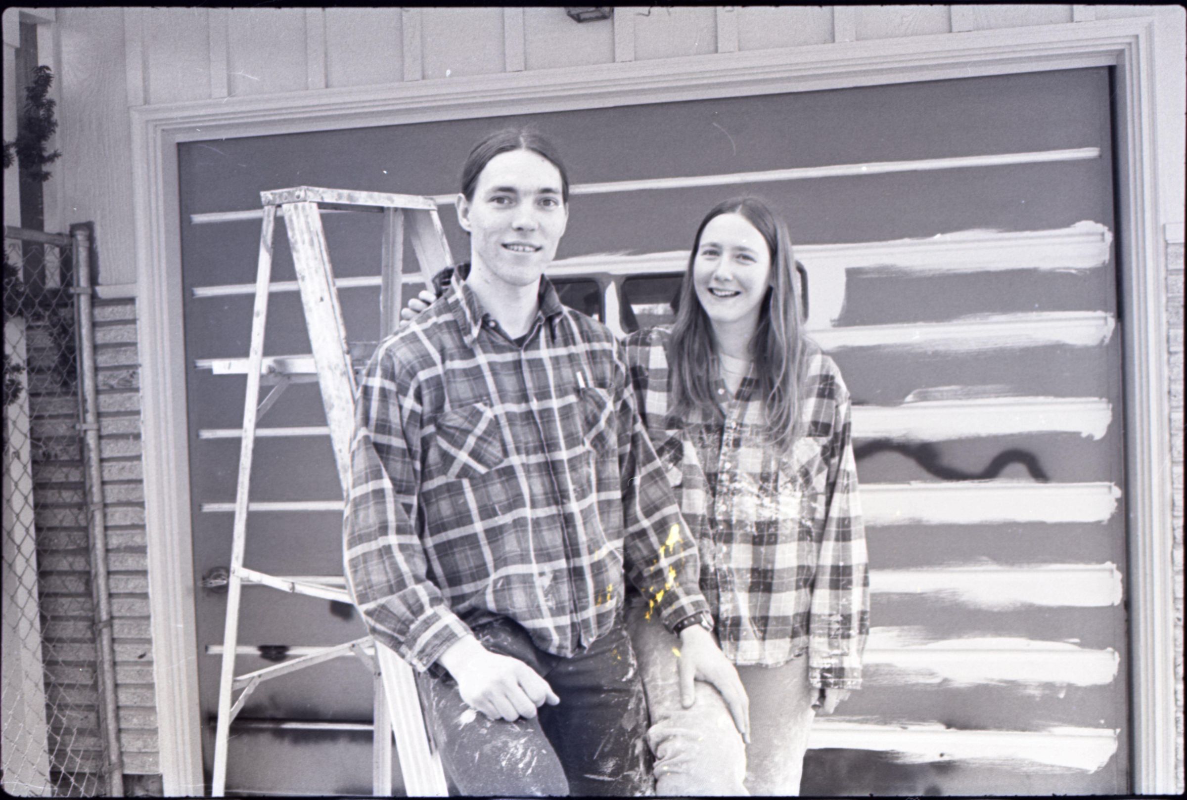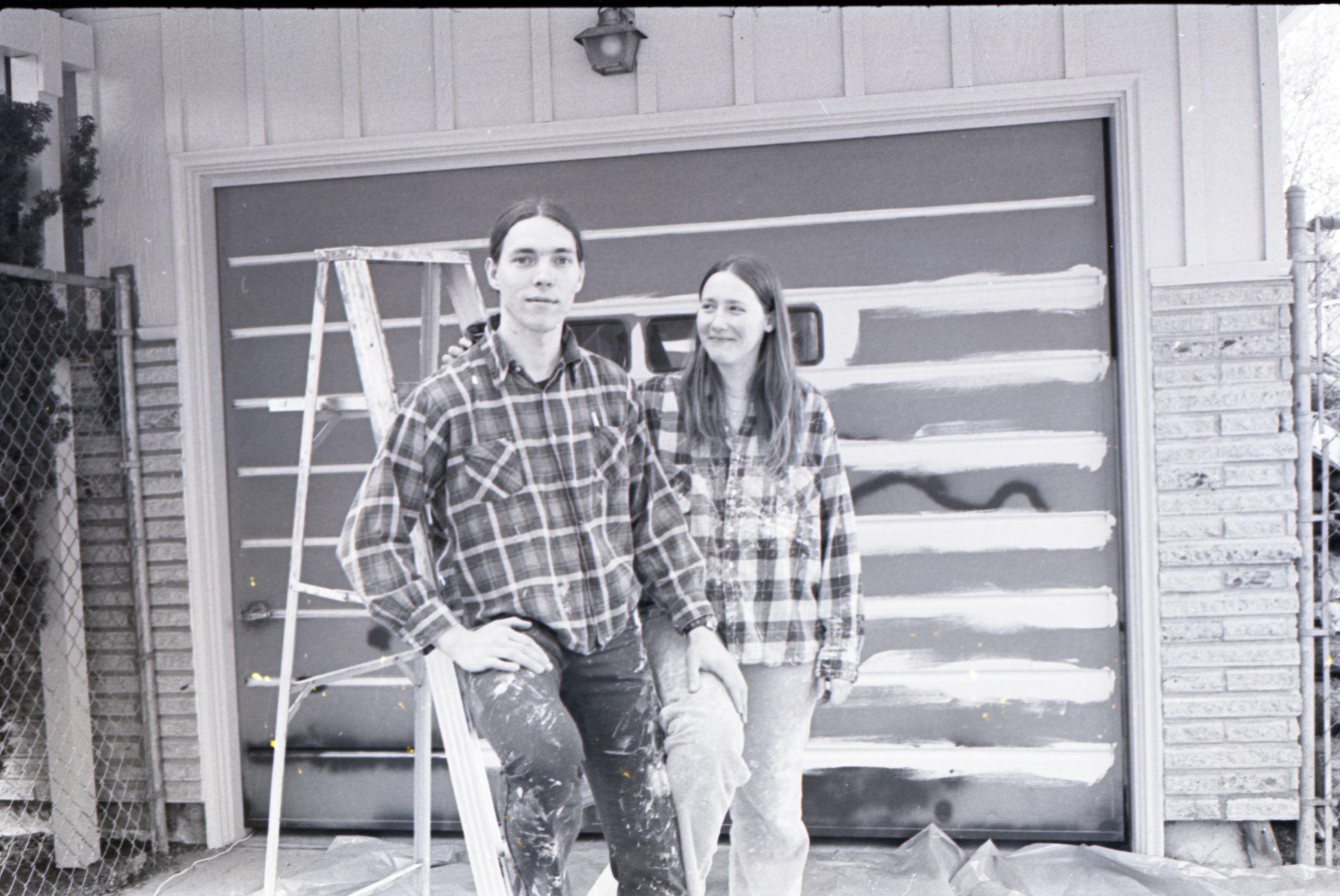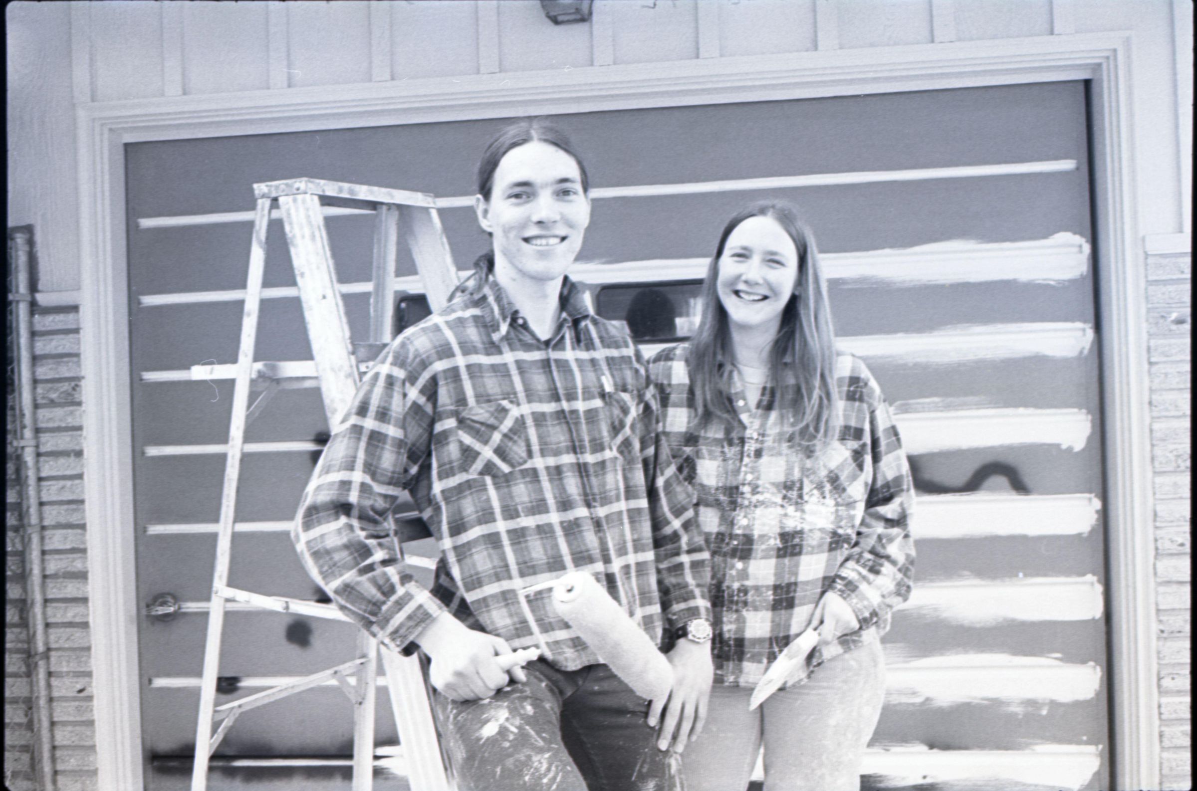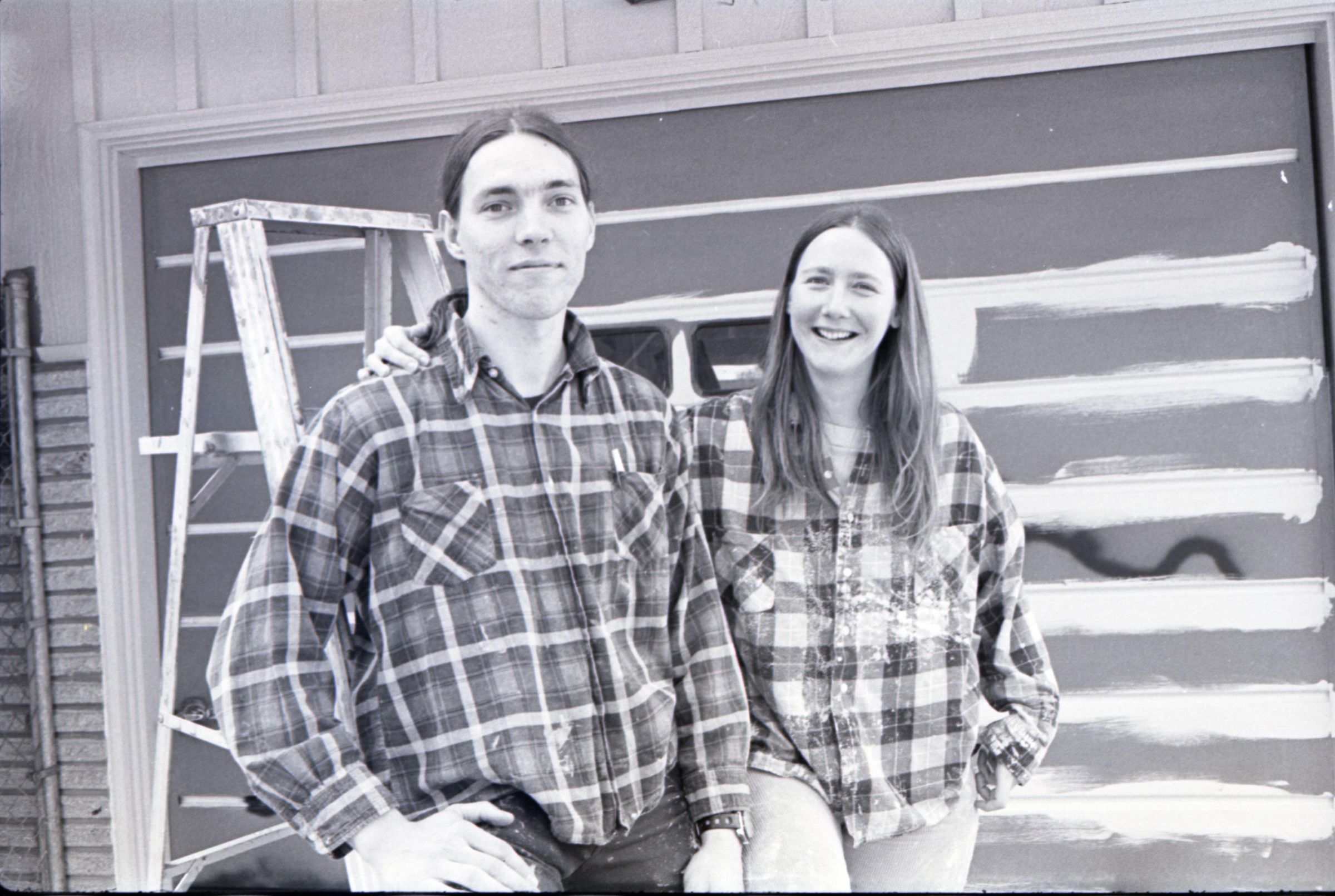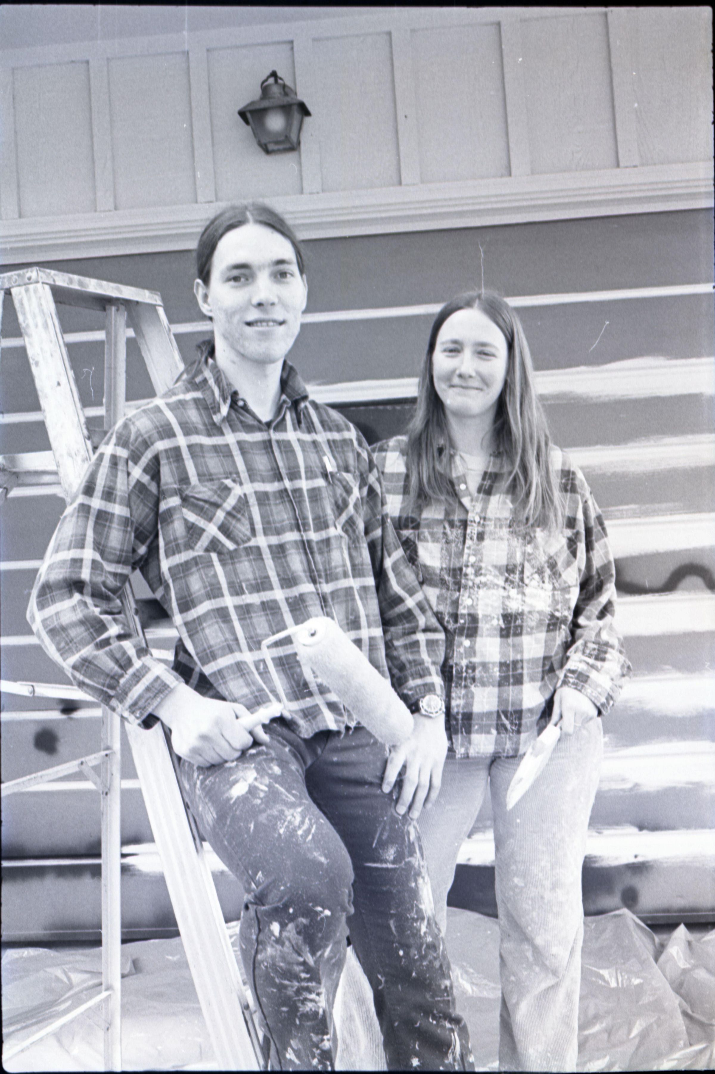 Tom and Dee SepArm, 1979. These two black and white film negative strips were created for the Lacey Leader newspaper. These images show a young man (Tom SepArm, at left) and a young woman (Dee SepArm at right) posing together for photos. Both people are wearing plaid shirts. The young man is wearing jeans and the young woman appears to be wearing corduroy pants. Both have paint on their shirt and pants. There is a ladder immediately to the left of of the young man, and he is leaning on it slightly. There is a partially painted garage door behind the man and woman.