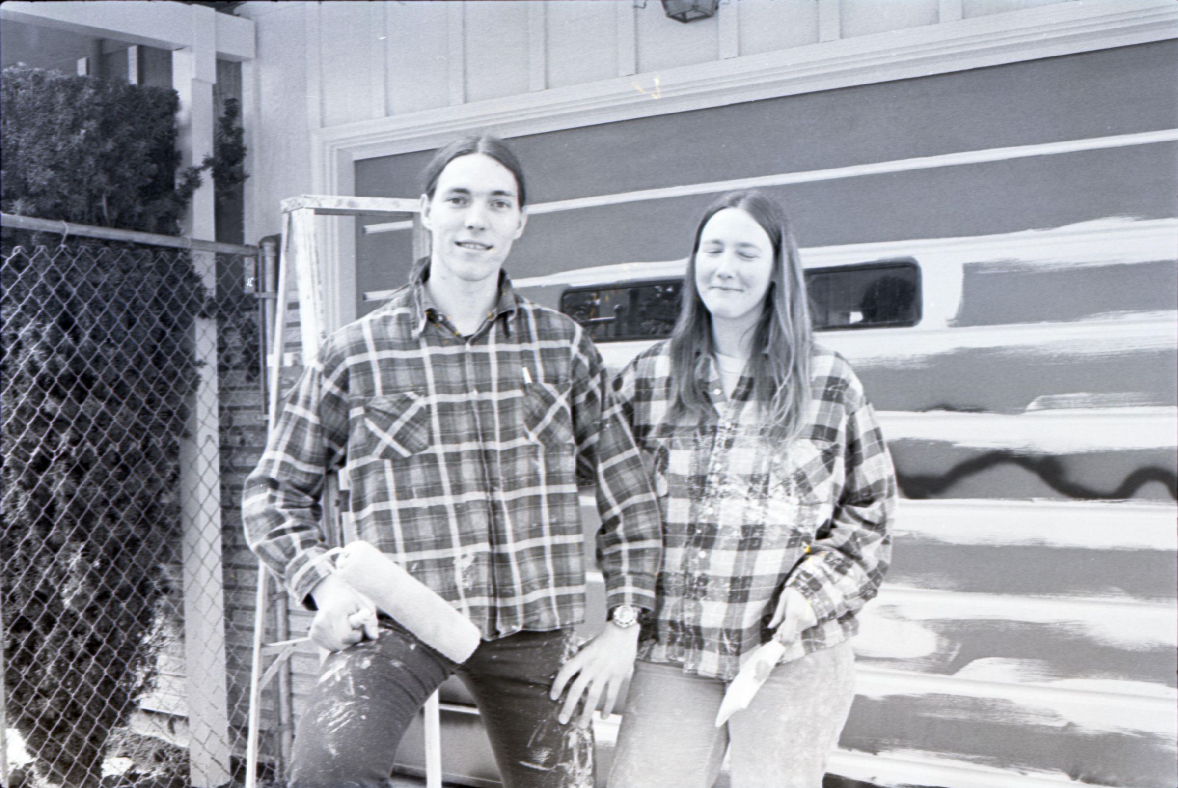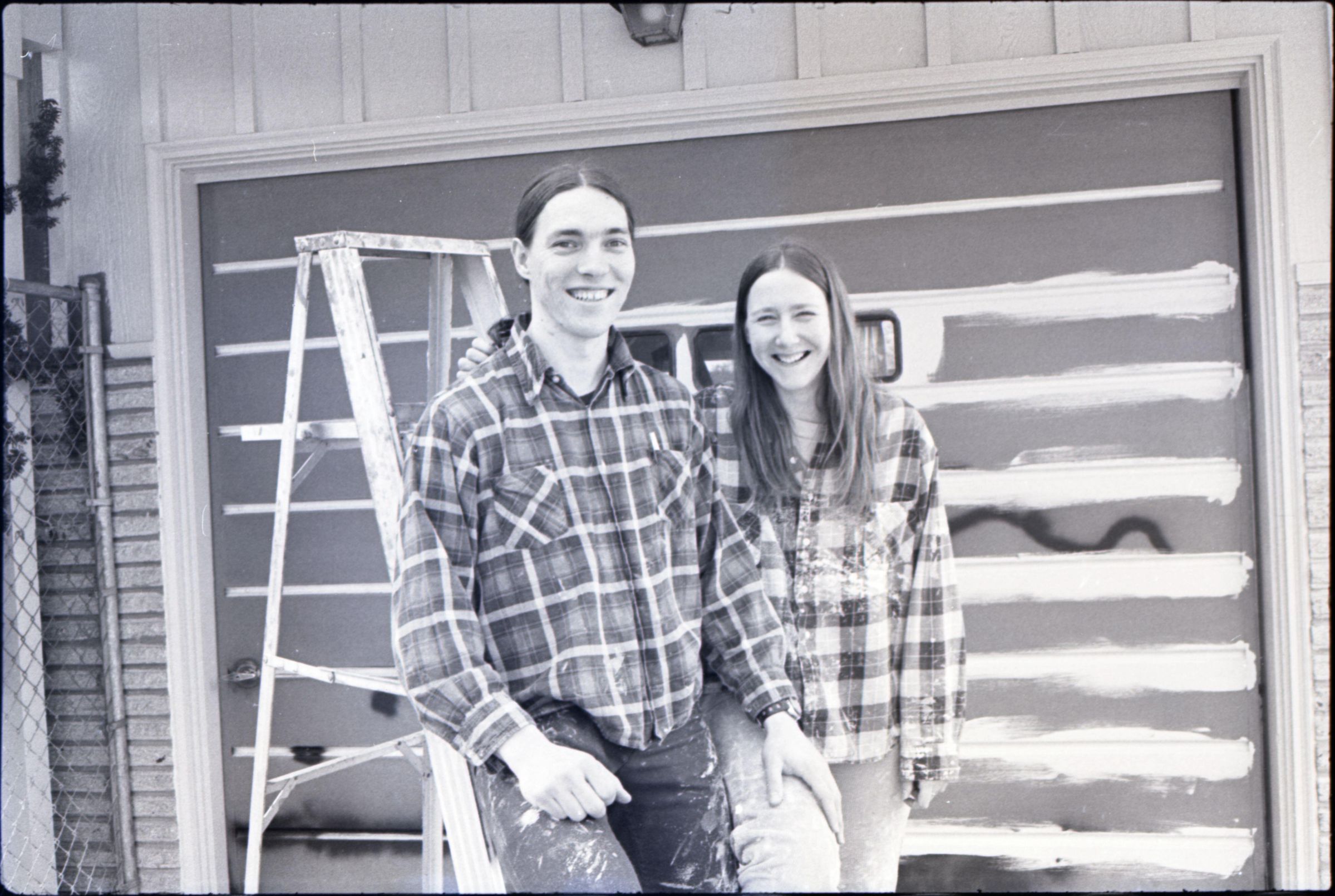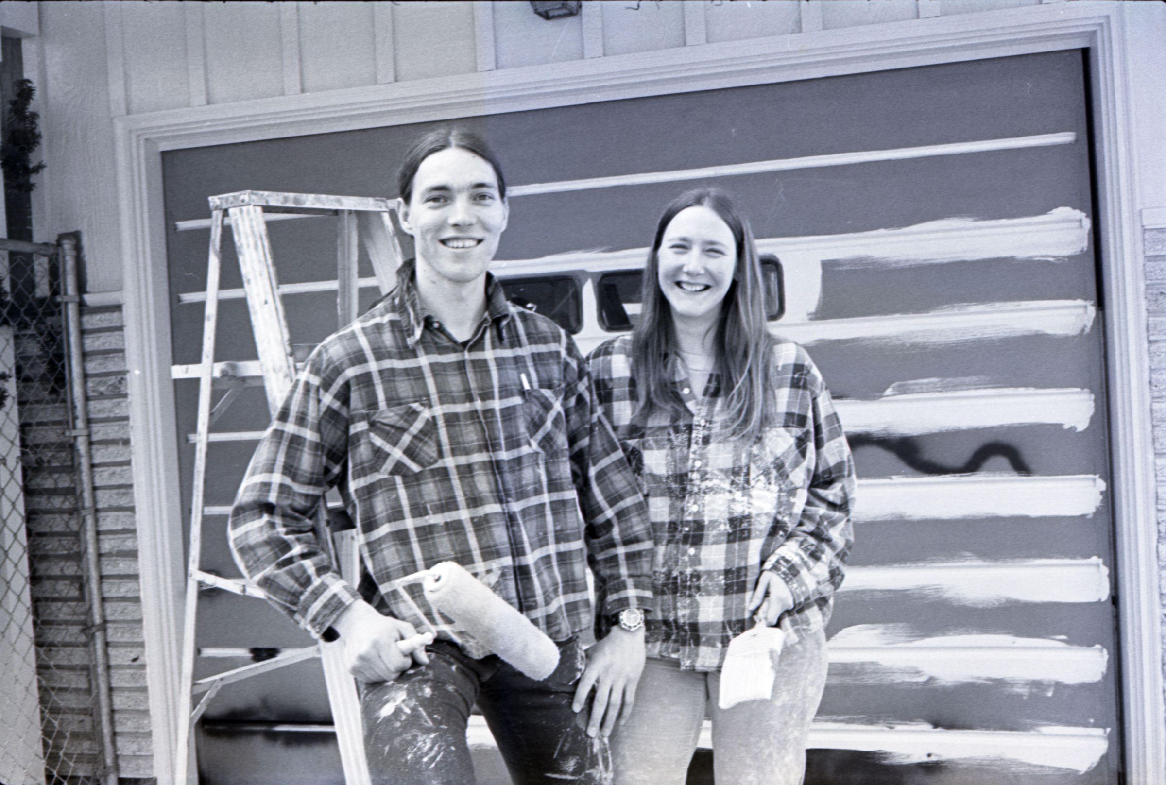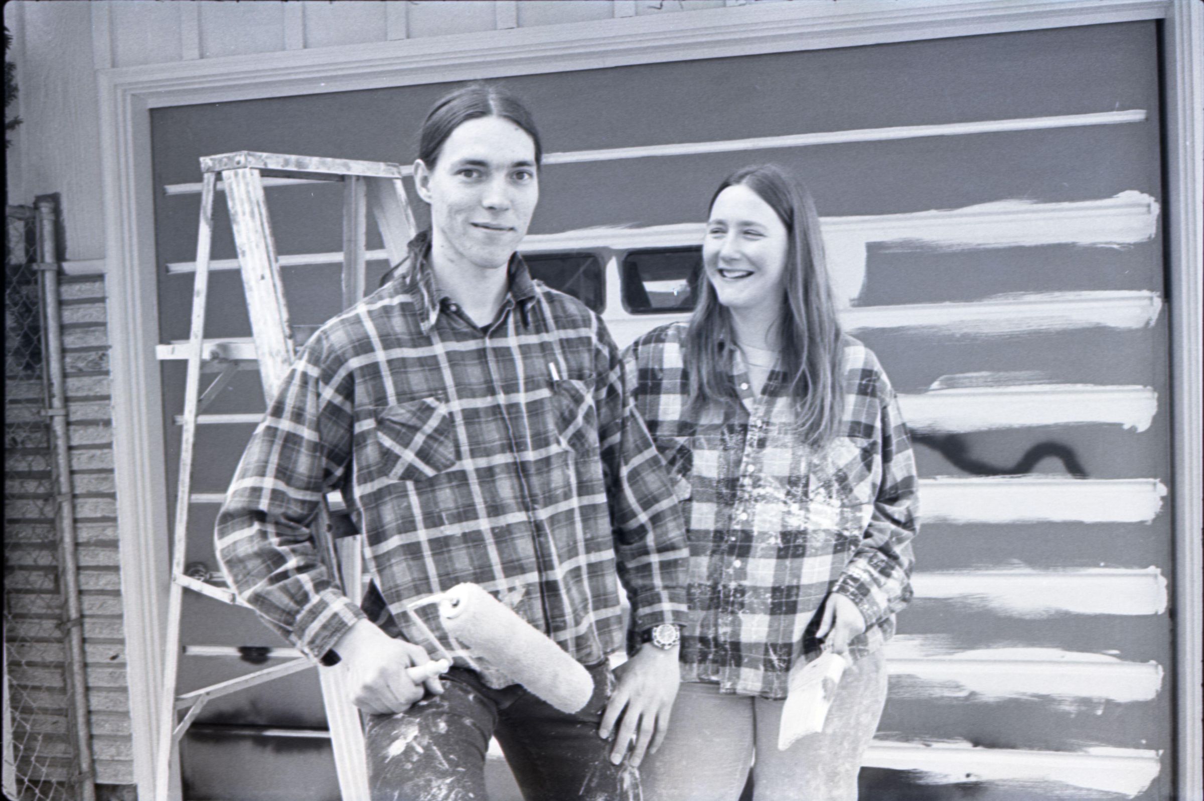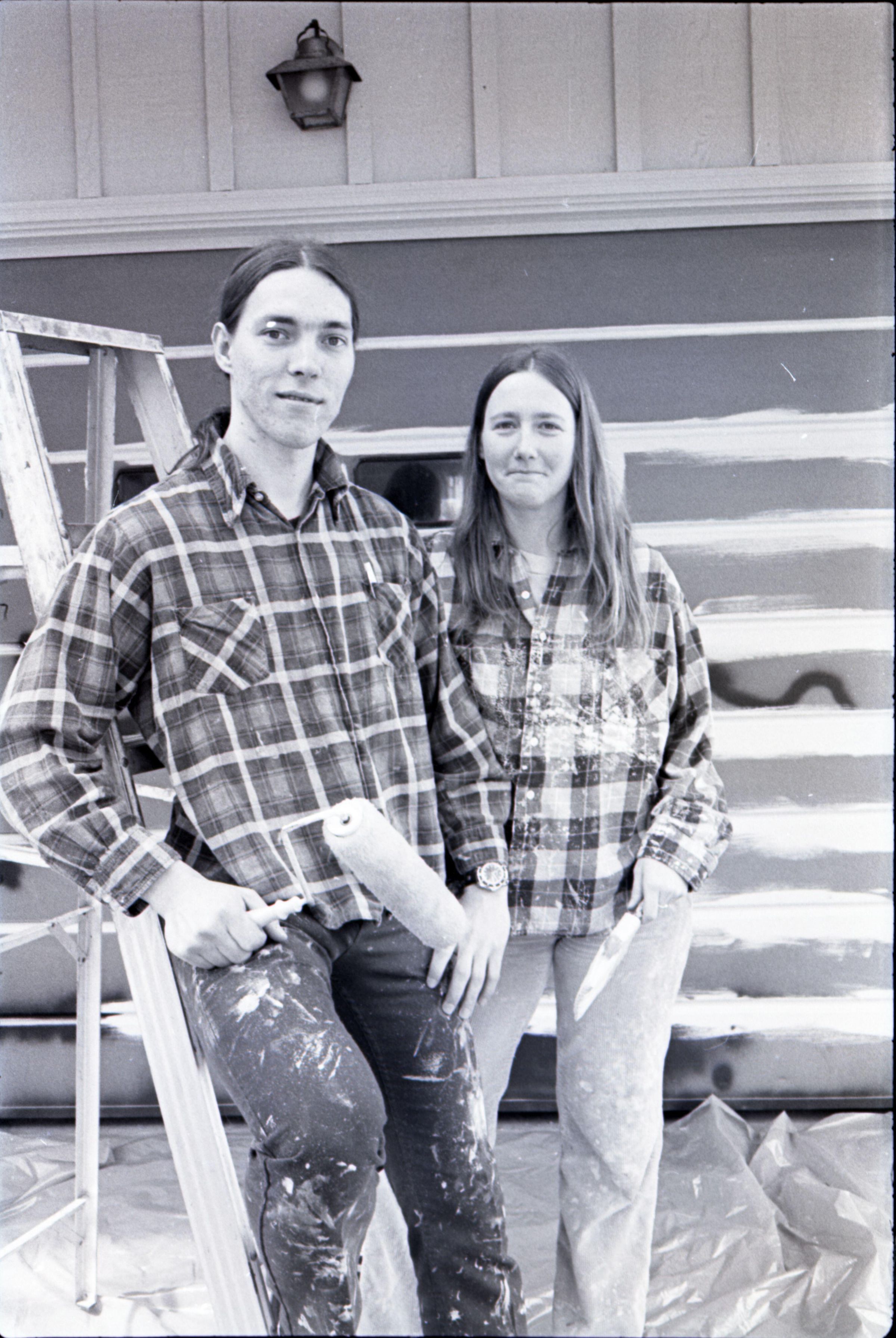 Tom and Dee SepArm, 1979. These two black and white film negative strips were created for the Lacey Leader newspaper. These images show a young man (Tom SepArm, at left) and a young woman (Dee SepArm at right) posing together for photos. Both people are wearing plaid shirts. The young man is wearing jeans and the young woman appears to be wearing corduroy pants. Both have paint on their shirt and pants. There is a ladder immediately to the left of of the young man, and he is leaning on it slightly. There is a partially painted garage door behind the man and woman.