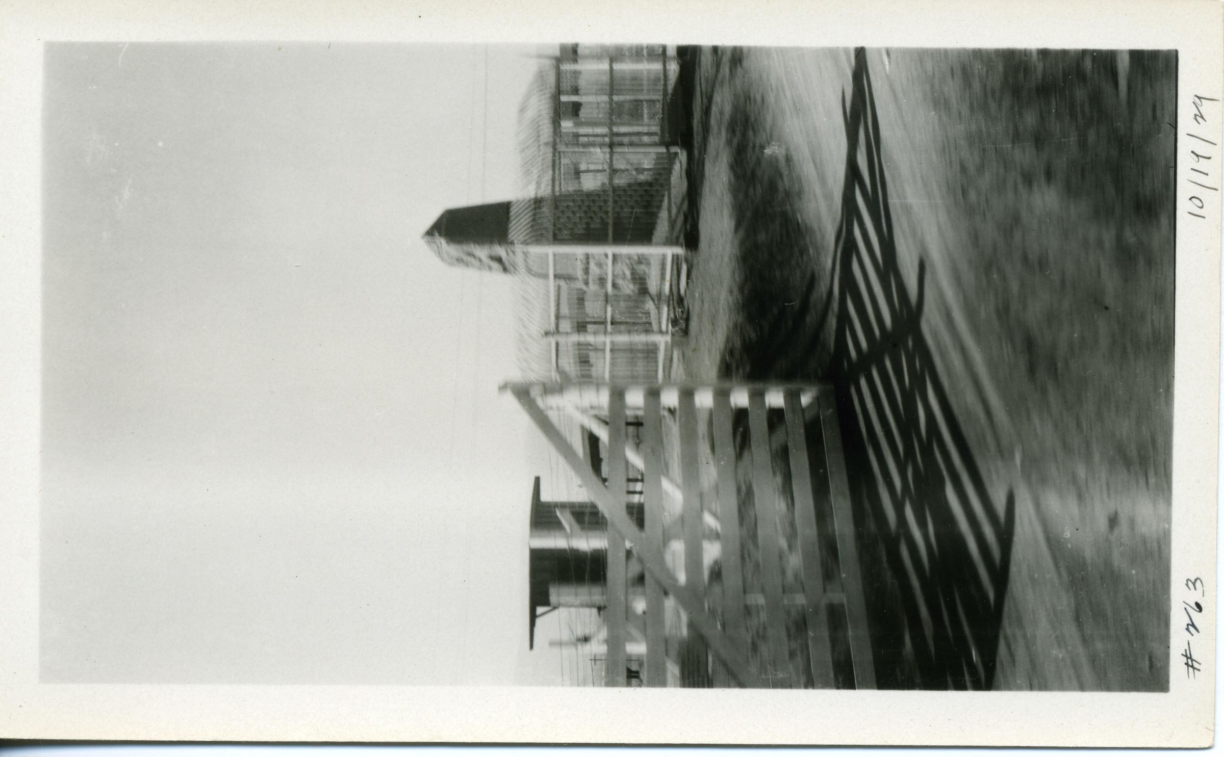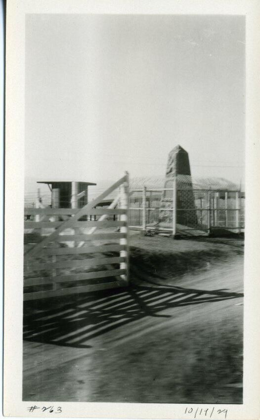 Black and white photo of a boundary monument on the Mexican border. In the foreground is a board fence that casts a shadow on the ground. Behind it and to the right is a monument shaped like a pyramid and surrounded by a wire fence. To its left is a small structure There is a white border on all sides, and in the bottom border is "#263" and "10/19/29". On the back is "2413" and in pencil "11".
