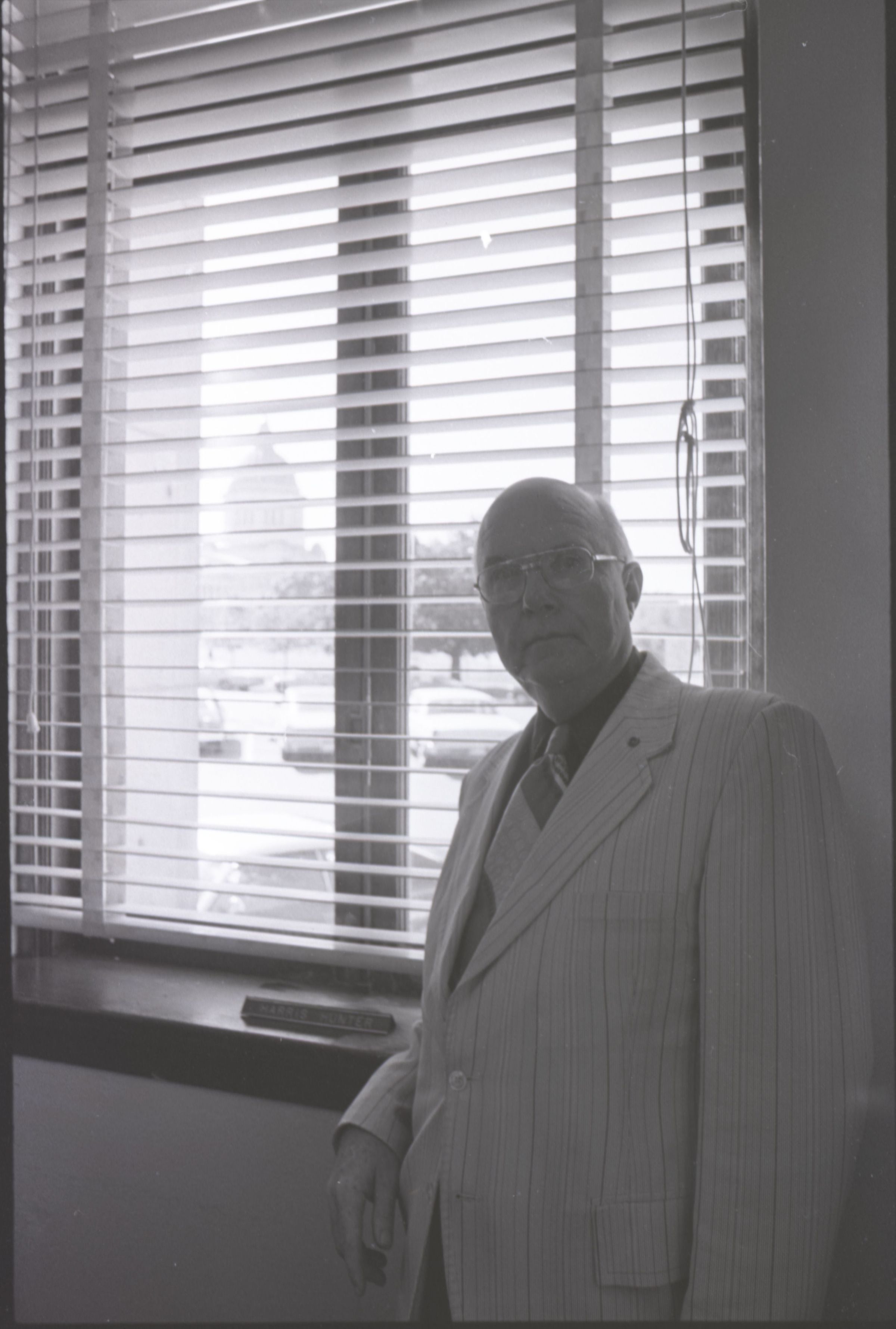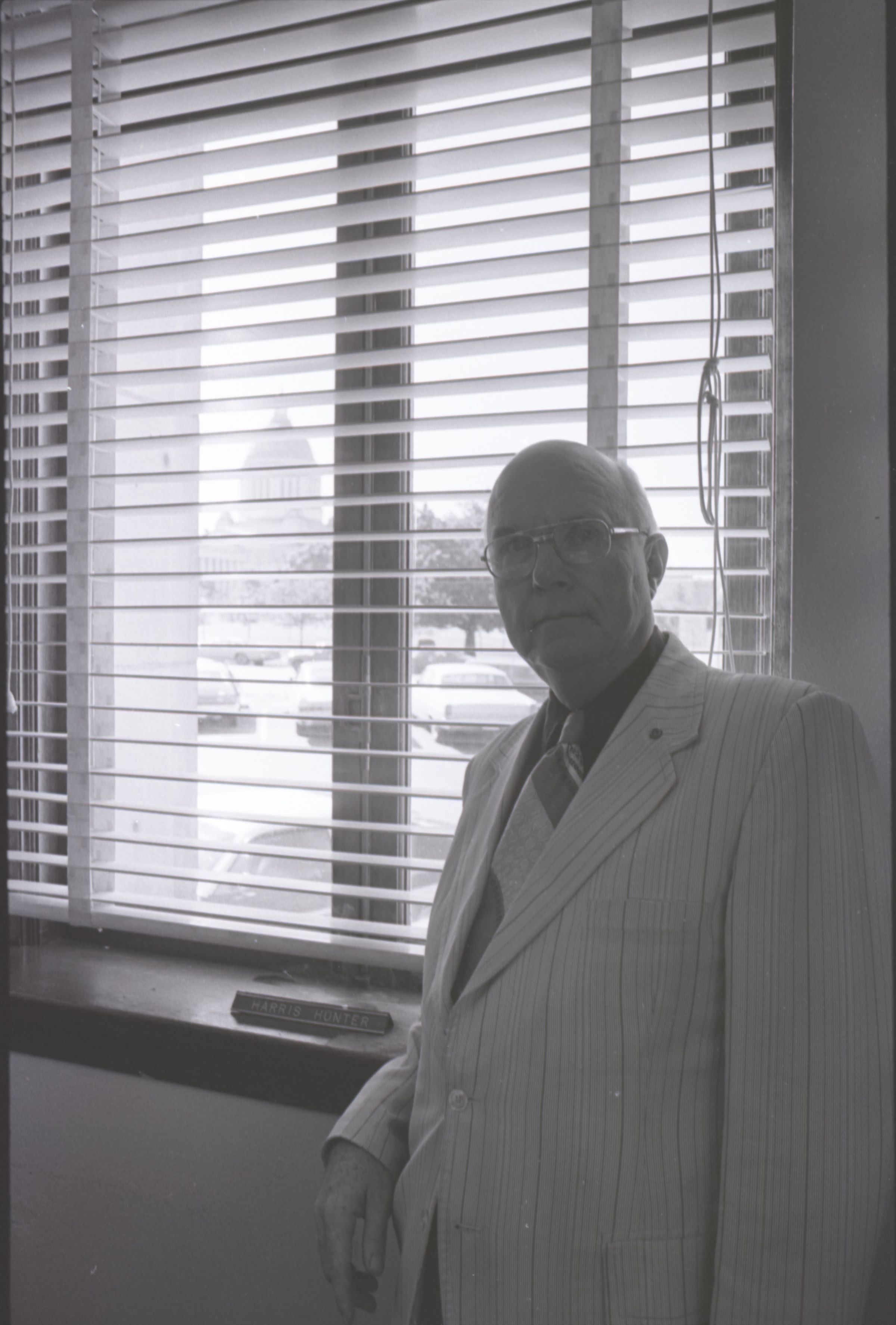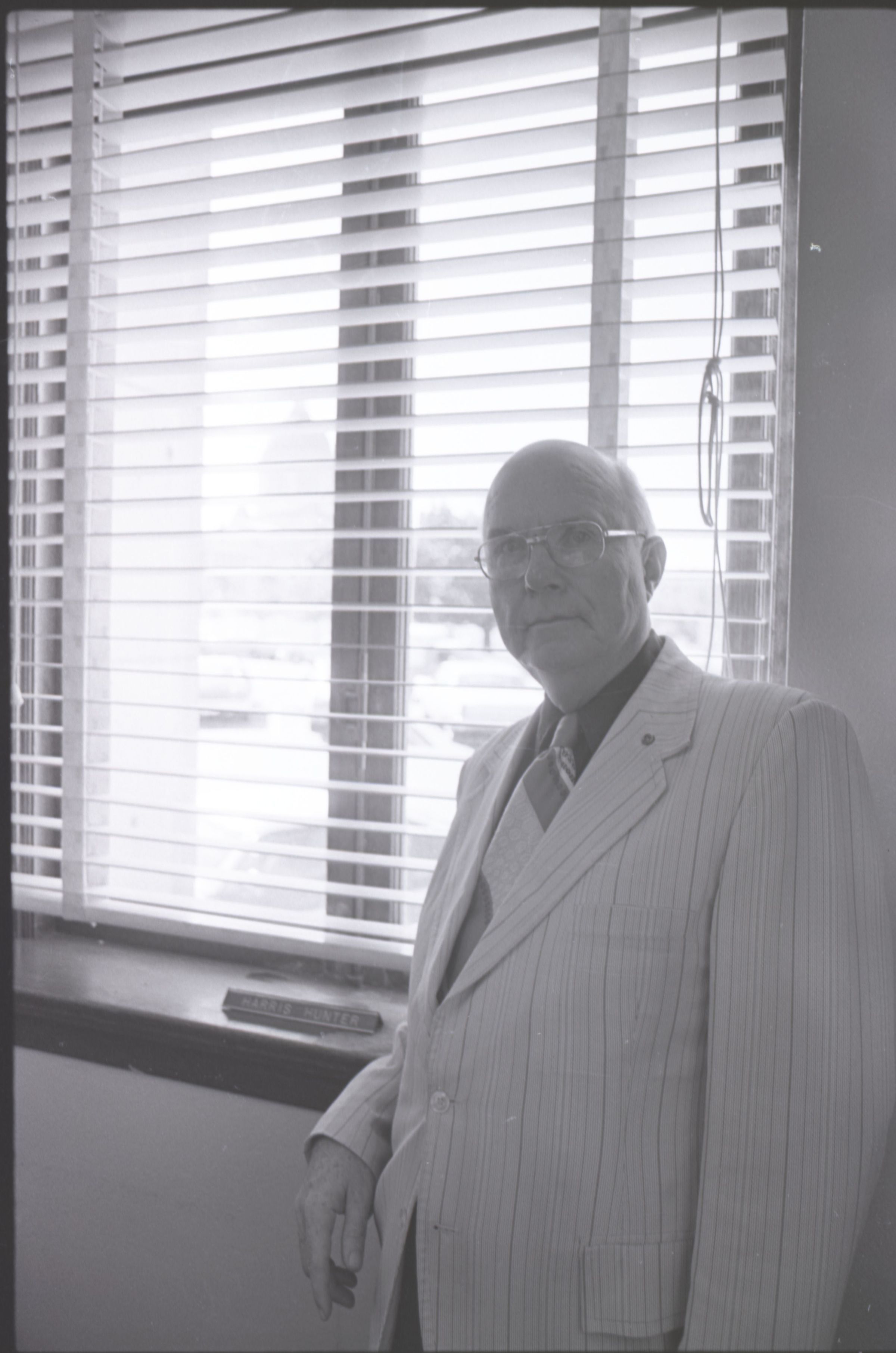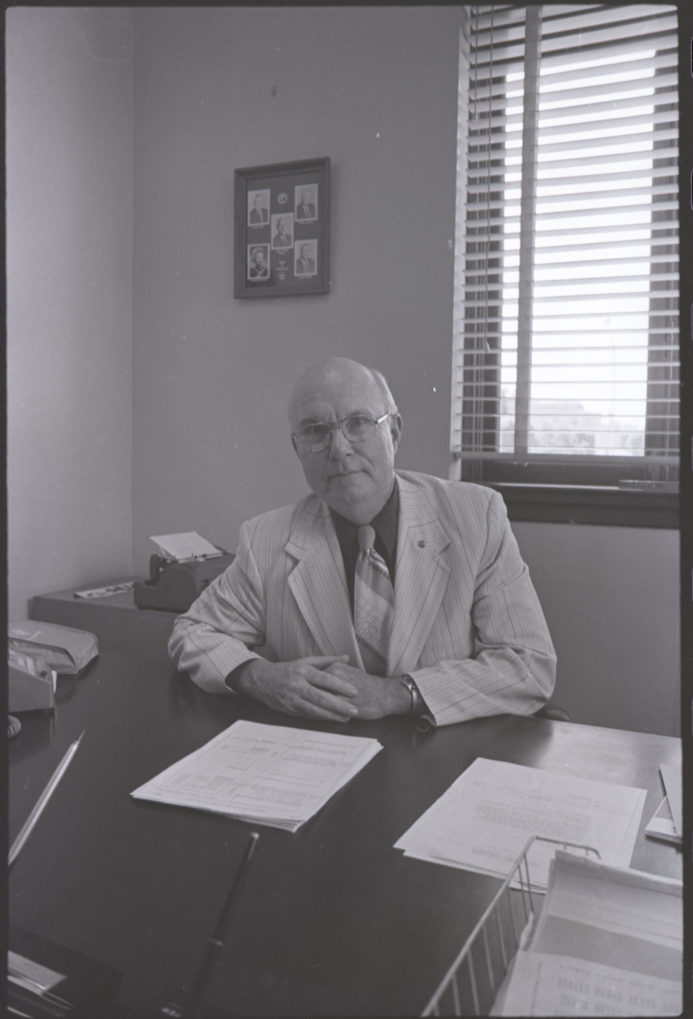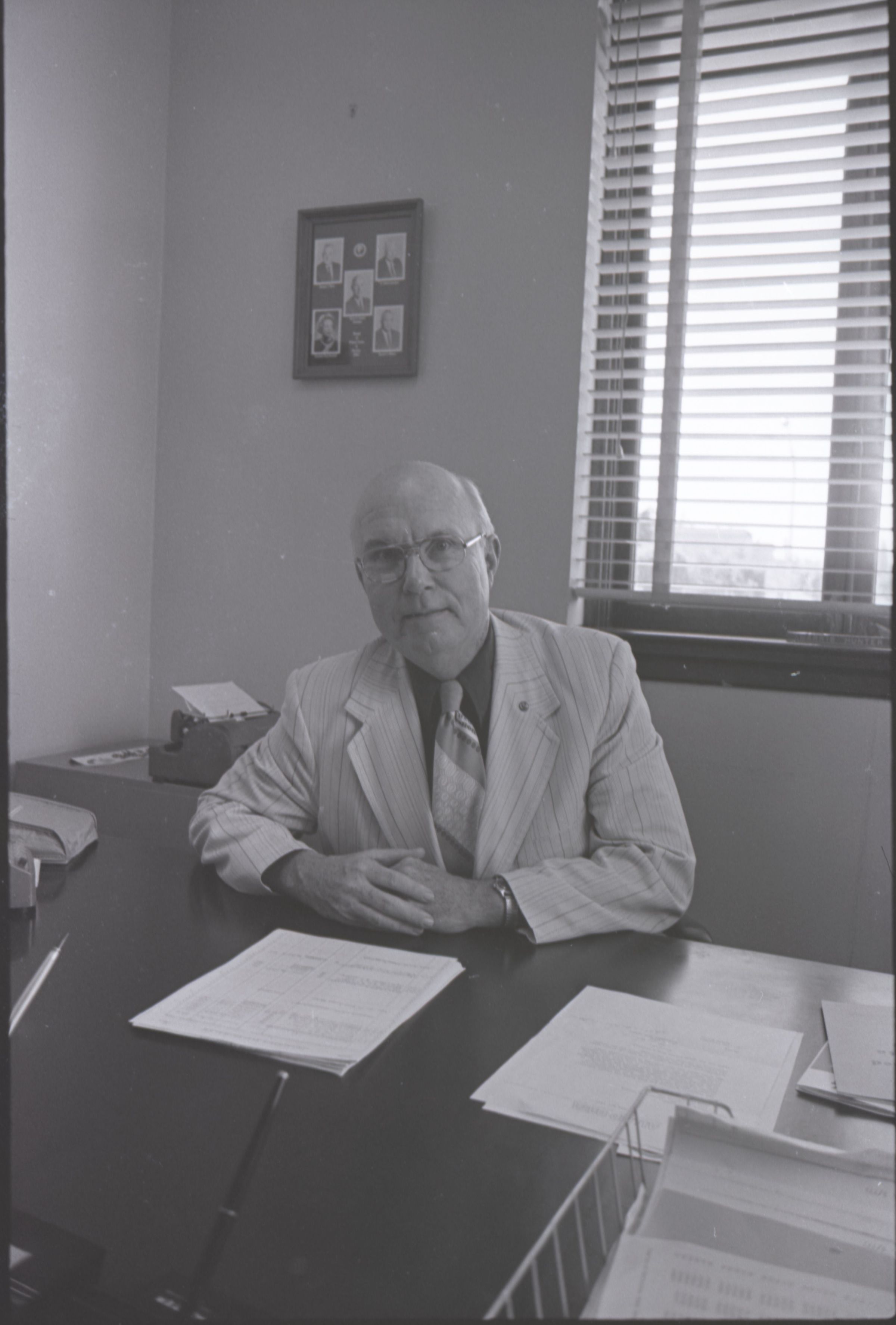 Harris Hunter, 1977. This single black and white film negative strip was created for the Lacey Leader newspaper. These images show an older man (Harris Hunter) with glasses posing for photos in an office. The man is balding and is wearing a pinstriped (the stripes are not evenly spaced) jacket and a diagonally-striped tie.Made/Created