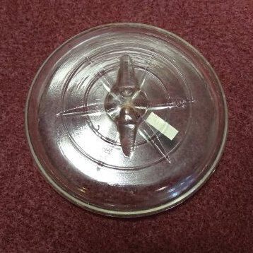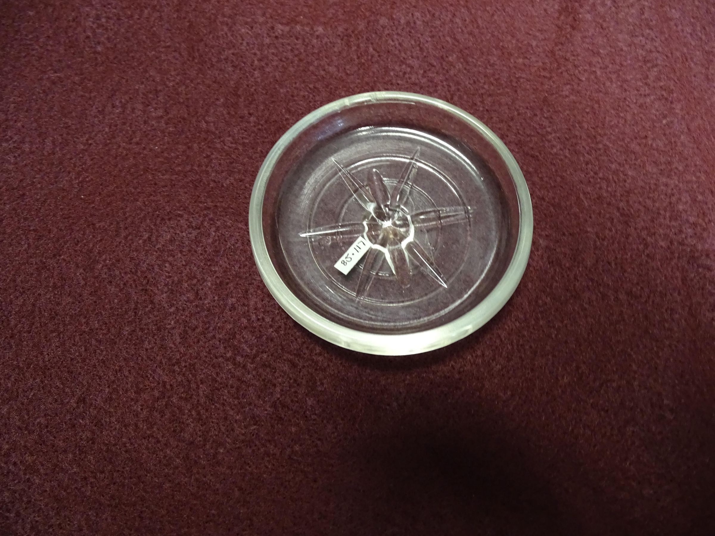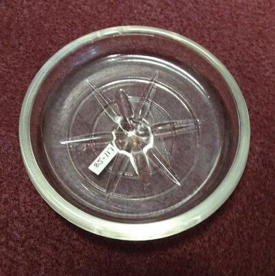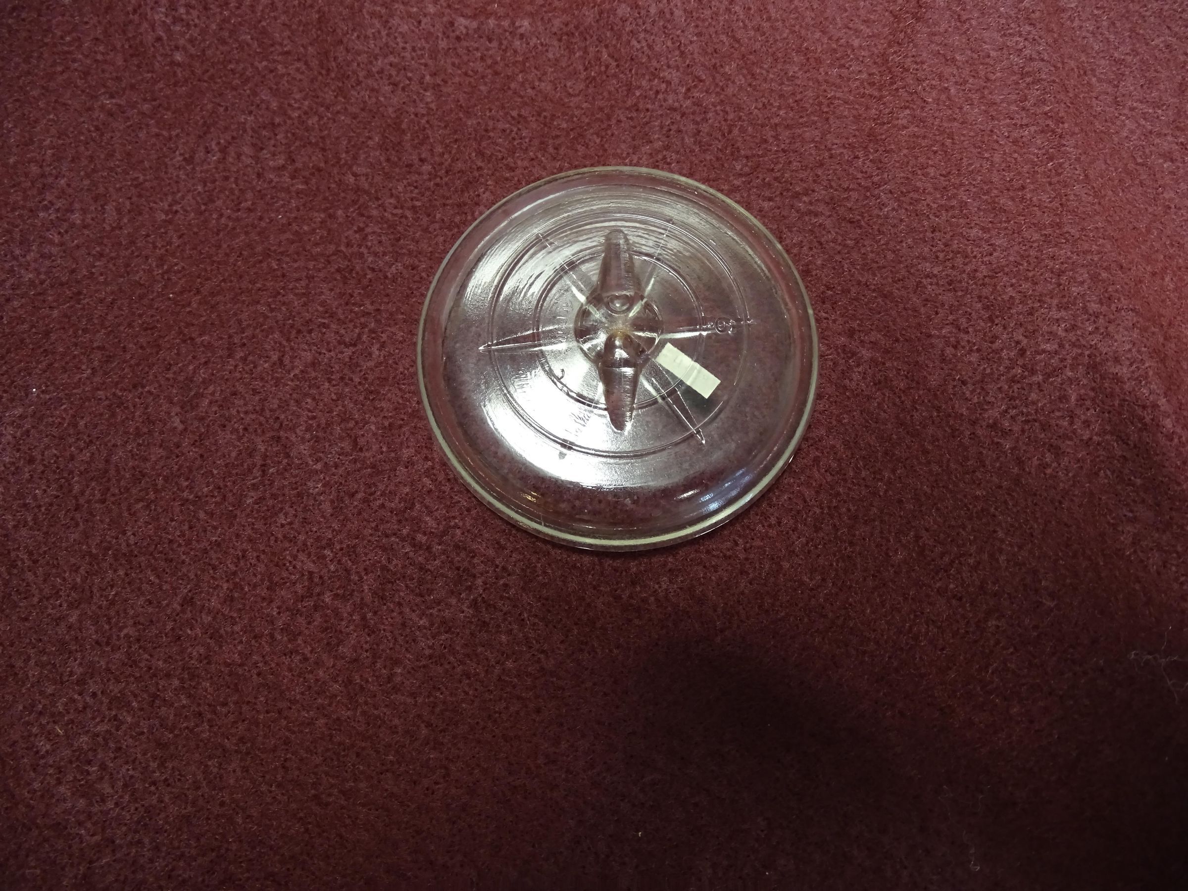 Clear glass round lid for a canning jar with wire bail. (It was found attached to jar number 85.55). On the top is an embossed "6." There is a cover groove on the top for a wire bail.Made/Created