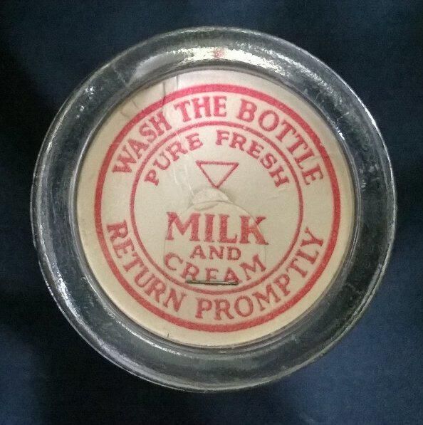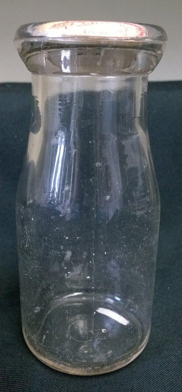 Clear glass round half pint milk bottle with cardboard lid. Printed in red on the cardboard lid is: "Wash the bottle, return promptly, Pure fresh milk and cream." On the side near the bottom is embossed "half pint." There are mold seams on opposite sides that extend from the bottom up to but not over the lip. There are horizontal seams at the bottom and at the lip. On the bottom is embossed "23" and "9" and two crossed ovals.Made/Created