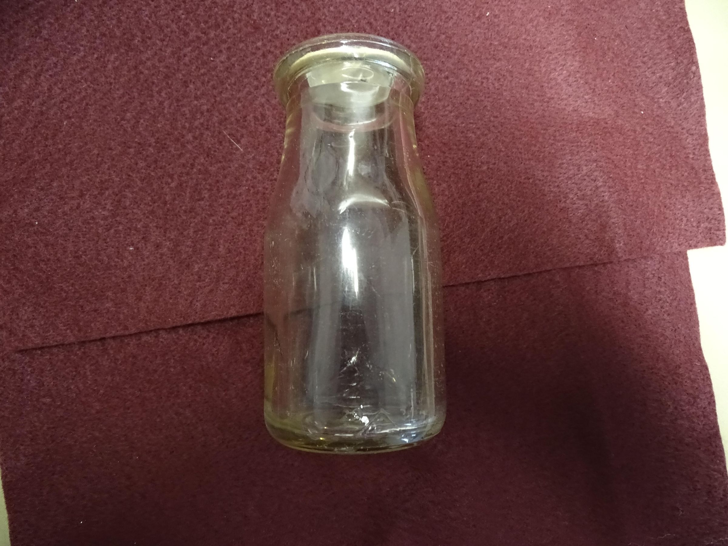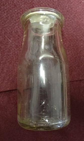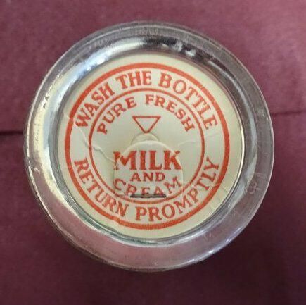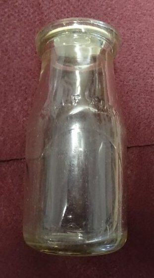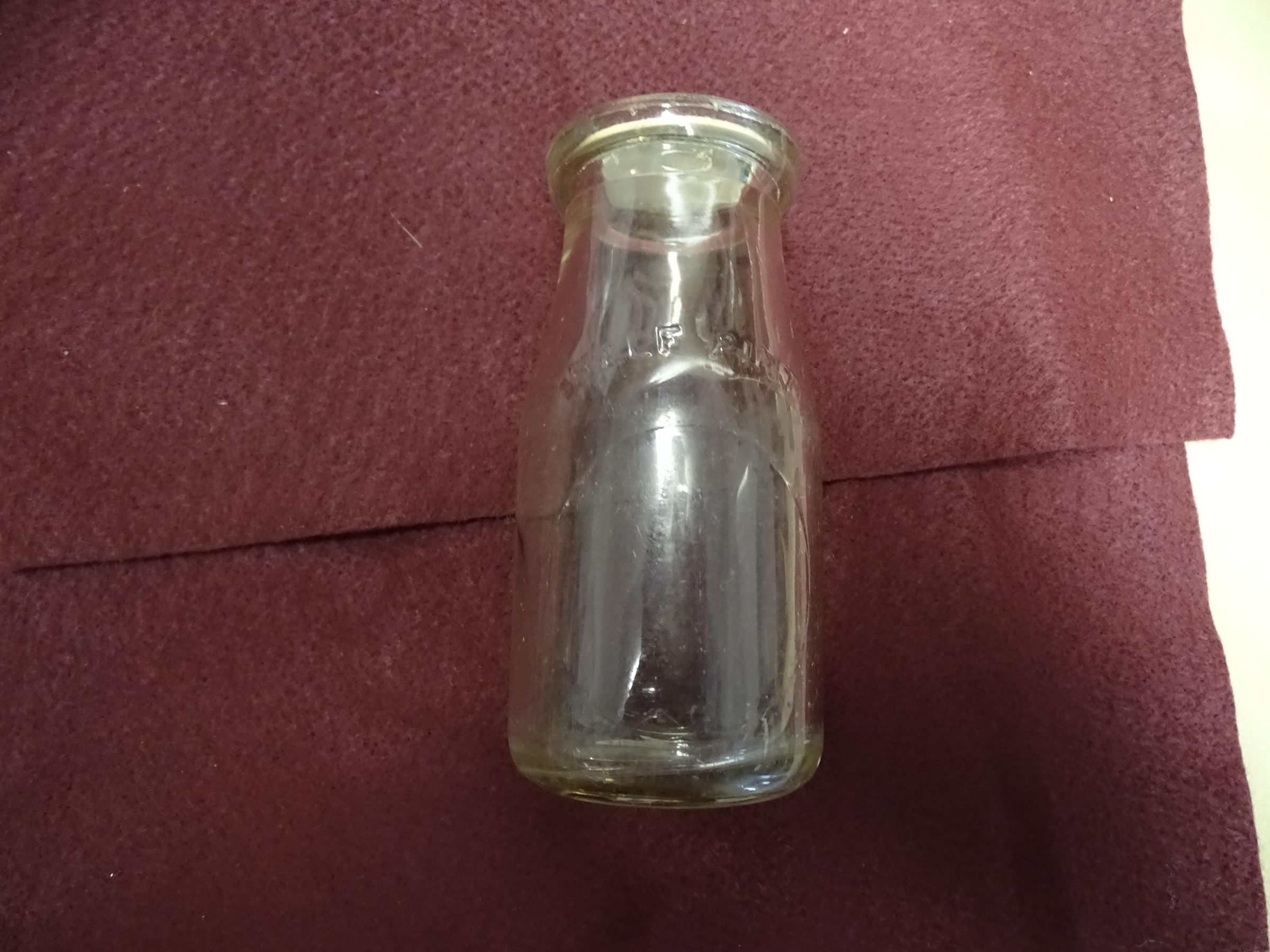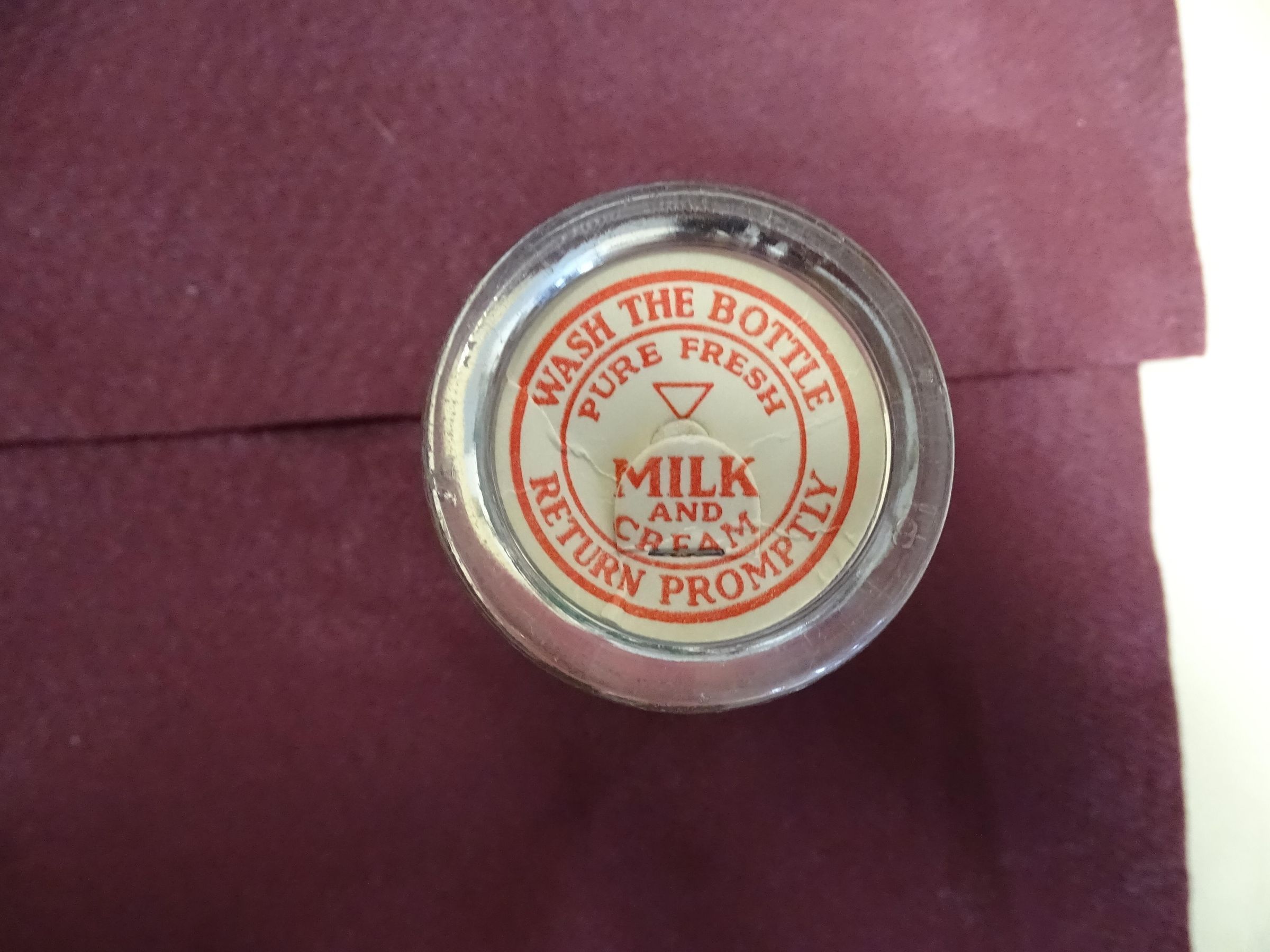 Clear glass round half pint milk bottle with cardboard lid. This bottle has a "rim code" which was unique to west coast manufacturers in the 1920s. On the flattened finish of the lip there is a "6" on the left and a "8" on the right which means that the bottle was manufactured in the year 1928. Printed in red on the cardboard lid is: "Wash the bottle, return promptly, Pure fresh milk and cream." On the side is embossed "half pint" and an oval. There are mold seams on opposite sides that extend from the bottom up to but not over the lip. There are horizontal seams at the bottom and at the lip. On one side near the bottom is embossed "29" and "3" and "IPG" inside a triangle.Made/Created