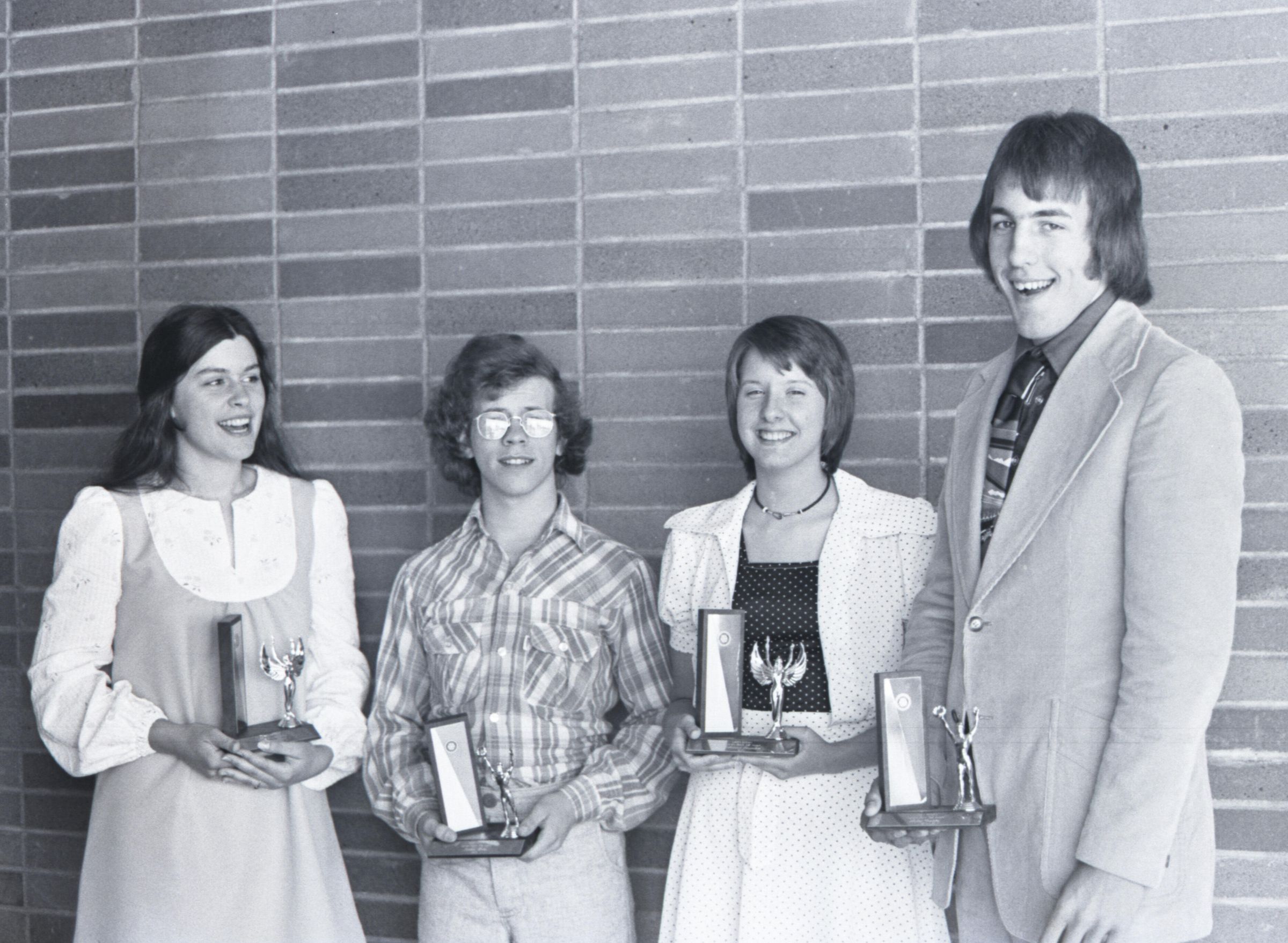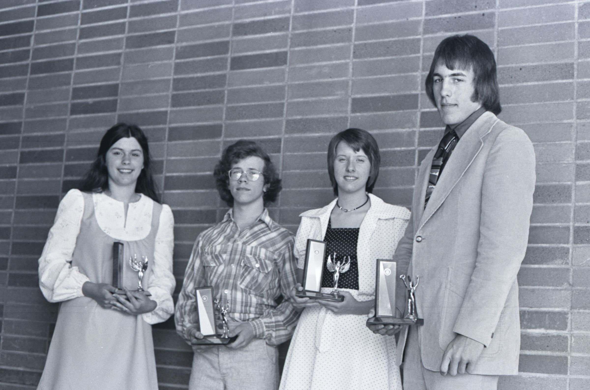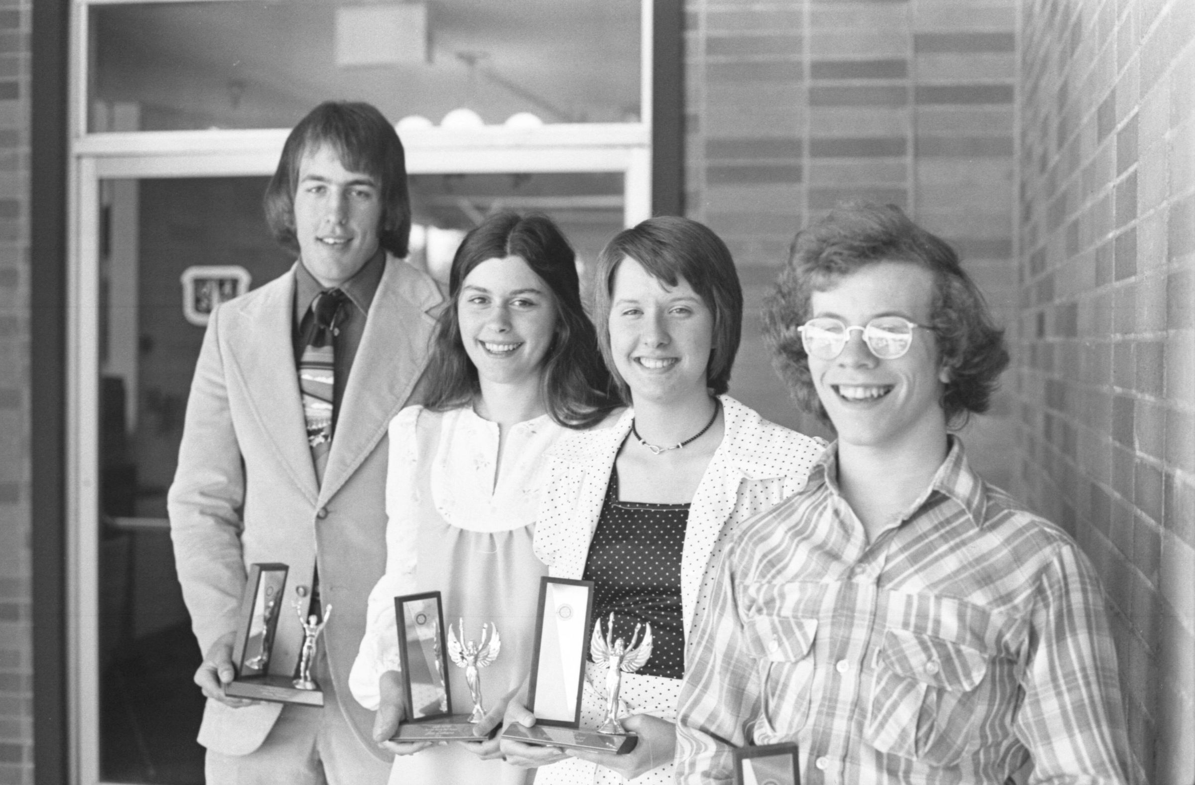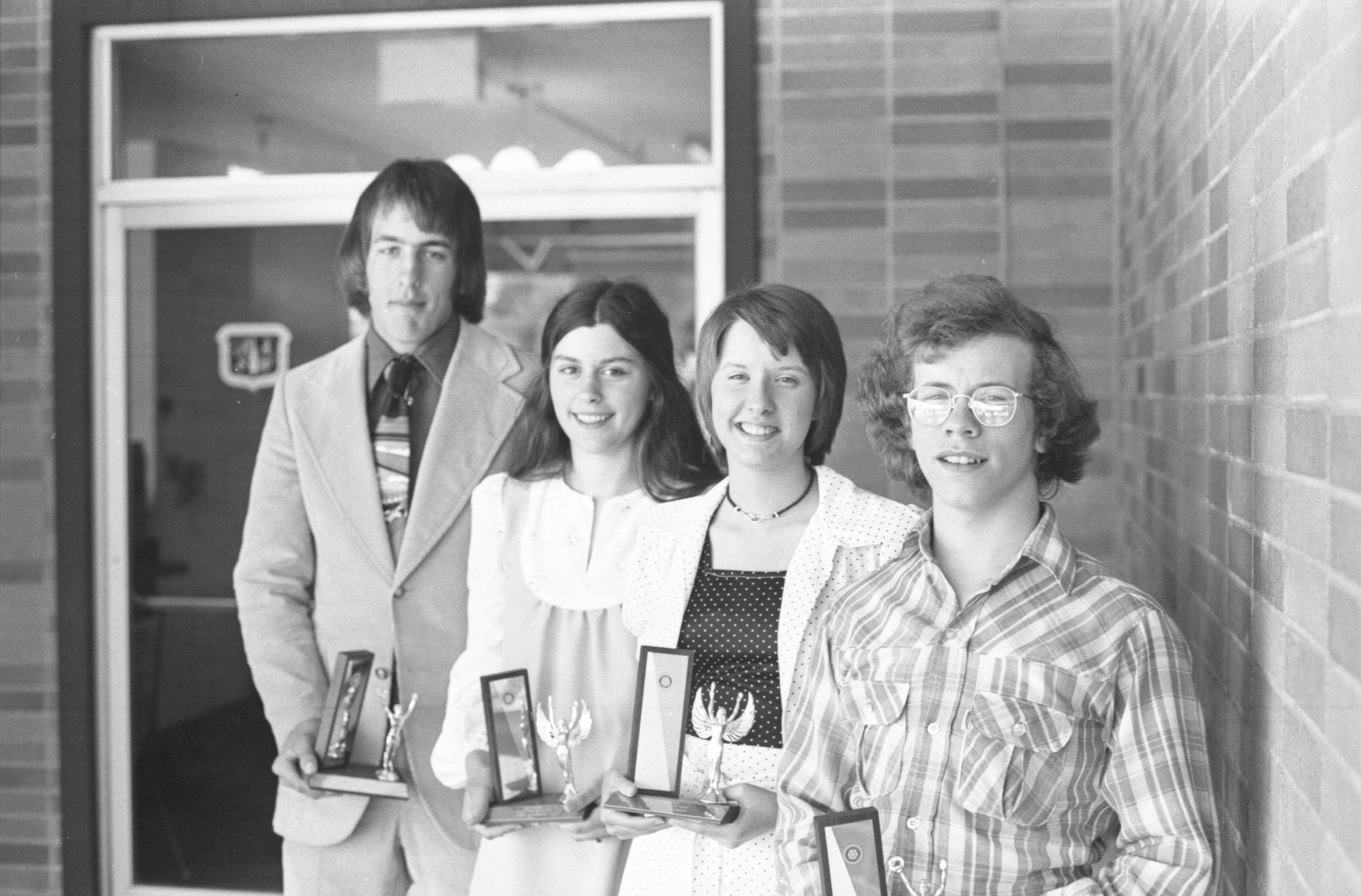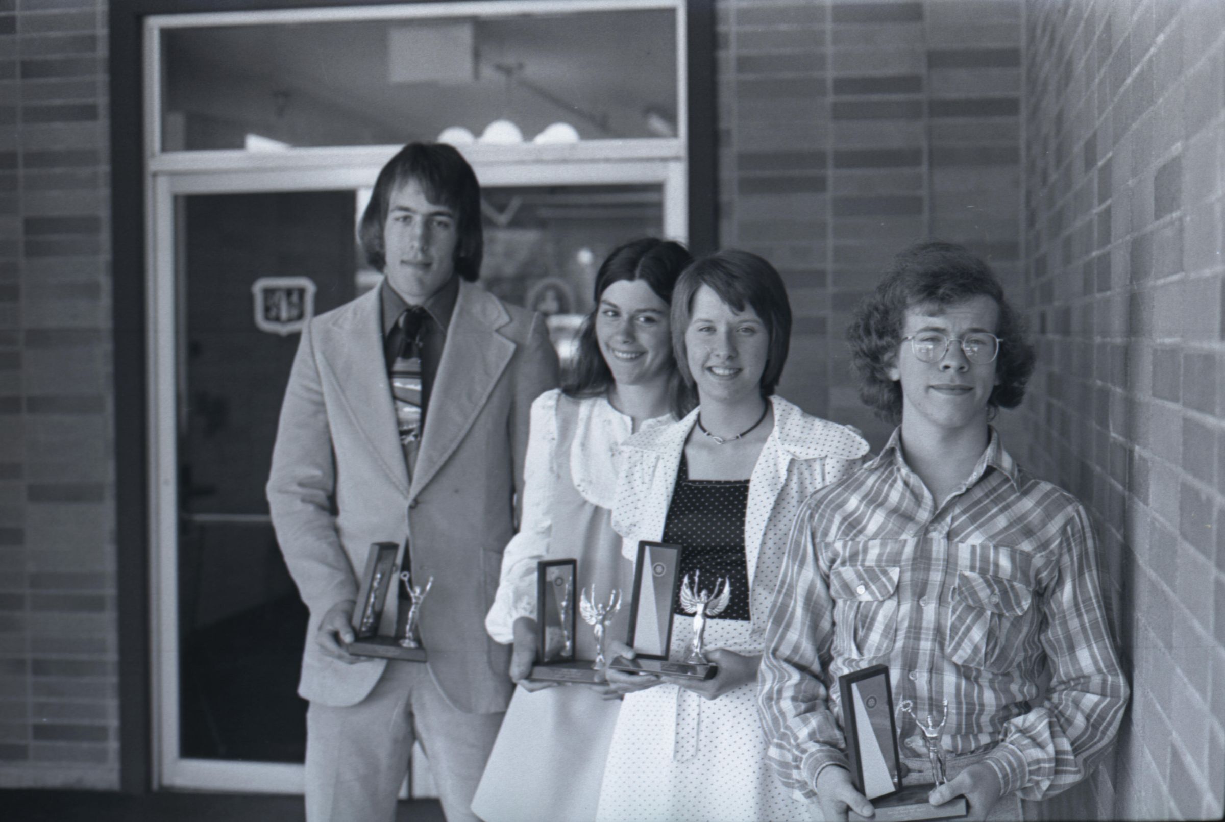 Rotary Winners, 1975. These two black and white film negative strips were created for the Lacey Leader newspaper. These images show two young women and two young men, each holding a trophy, posing together for photos. Image 40 shows the four young people standing in a row. At left is a young woman with long hair wearing a long-sleeved shirt under a sleeveless dress, or a single-piece dress which resembles this. Her head and body are turned slightly toward the right-hand edge of the image frame. She is looking to the right-hand side of the image and is smiling. Second from left is a young man with curly hair parted toward his right and glasses wearing a plaid shirt. His body is turned very slightly toward the left-hand side of the image frame and his head is oriented directly toward the camera. He is smiling. The young woman third from the left has shoulder-length hair parted toward her left and a polka-dotted dress with a matching short-sleeved jacket. The young man at right has shoulder-length hair and is wearing a blazer and a patterned tie. He is considerably taller than the other three young people. His head and body are turned partially toward the left-hand side of the image frame. He is looking toward the camera and smiling. All of these young people are shown roughly from the mid-thigh up. This image was captured in front of a brick wall. Image 41 is nearly identical to the previous image. Image 42 shows the four young people standing in a different configuration than in the previous images. They are all facing toward the camera and smiling. The young people are, from left to right, standing progressively closer to the camera. Here the taller young man in the blazer is at left. Second from left is the young woman with long hair. Third from left is the young woman with shorter hair. At right is the young man with curly hair and glasses. The young man at the left is shown from the mid-thigh up. The two young women are shown from the waist up. The young man at right is shown from the mid-torso up. In the left-hand side of the background is a double glass door with a shield-shaped emblem on the left-hand door. In the right-hand side of the background is a brick wall. Image 43 is nearly identical to image 42. Image 44 is very similar to the previous two images, but here the photographer has zoomed out or moved away from the young people slightly.