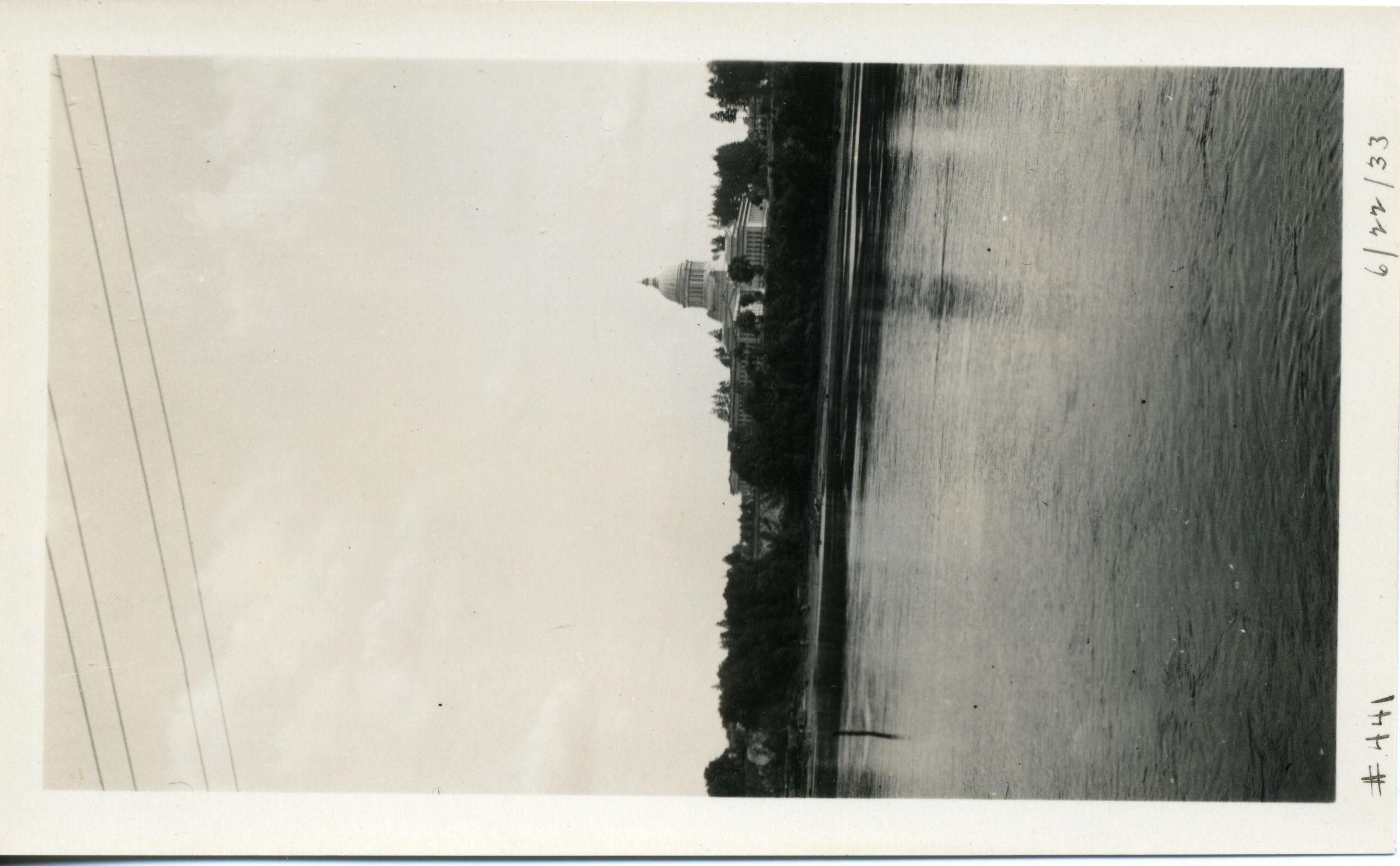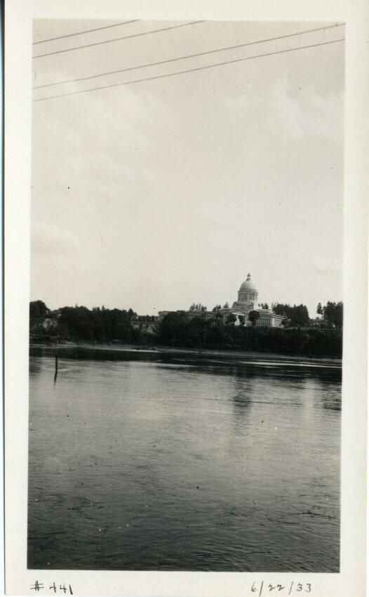Black and white photo of the Capitol group in Olympia. The image is a long shot across water, which might be the mouth of the Des Chutes River where it empties into Budd Inlet. The Capitol dome is visible along with at least one other building. There are trees surrounding the buildings and utility lines at the top of the image. There is a white border on all sides, and in the bottom border is "#441" and "6/22/33". On the back is stamped "9544" and in pencil "38".
