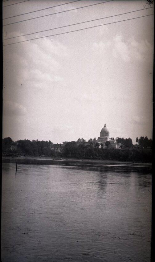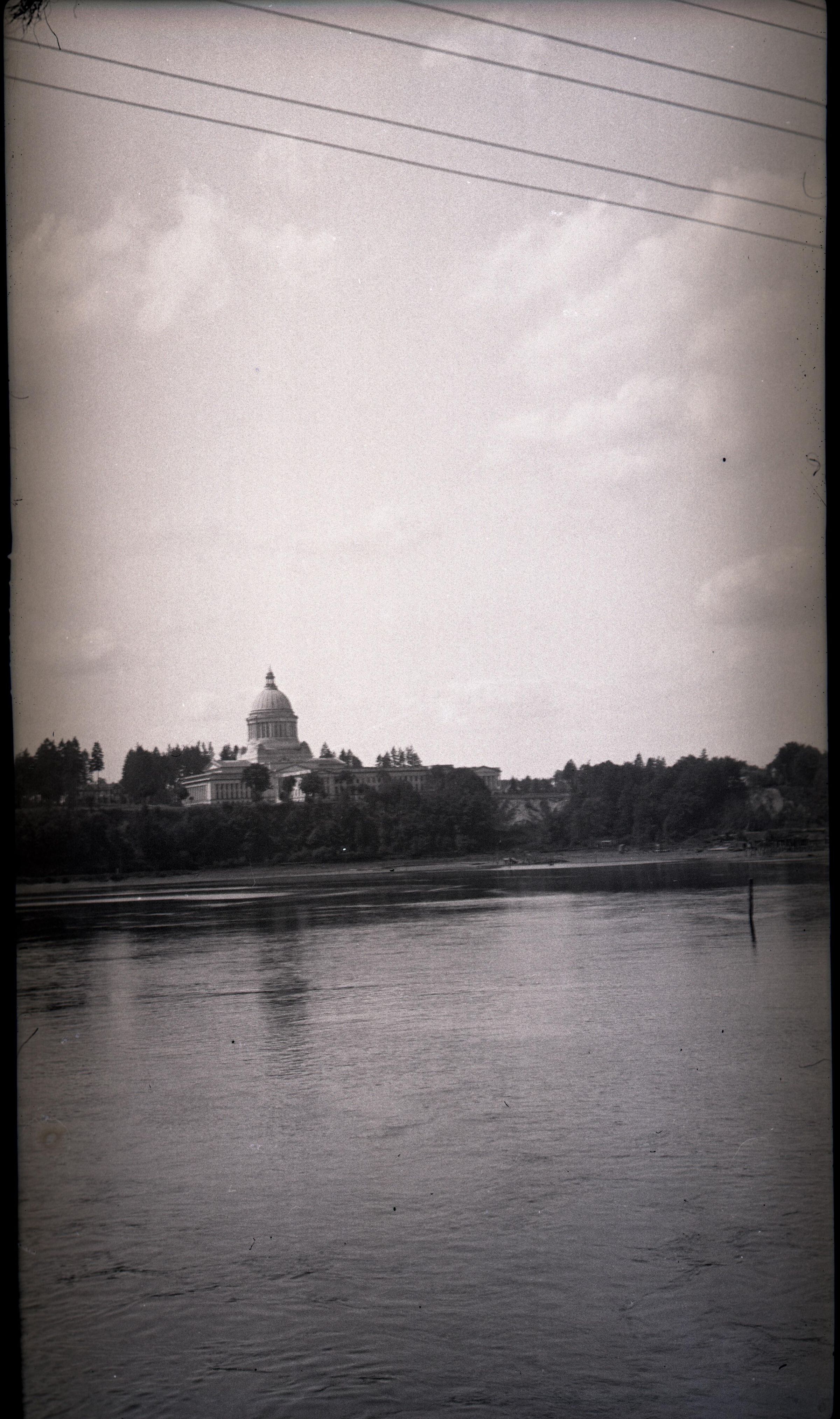 Black and white negative of the Capitol group in Olympia. The image is a long shot across water, which might be the mouth of the Des Chutes River where it empties into Budd Inlet. The Capitol dome is visible along with at least one other building. There are trees surrounding the buildings and utility lines at the top of the image. There is a white border on all sides, and in the bottom border is "#441" and "6/22/33".