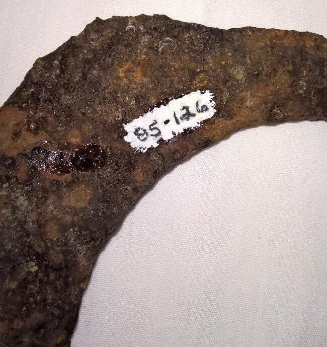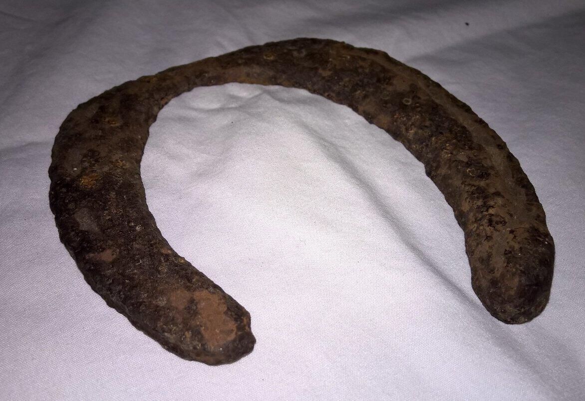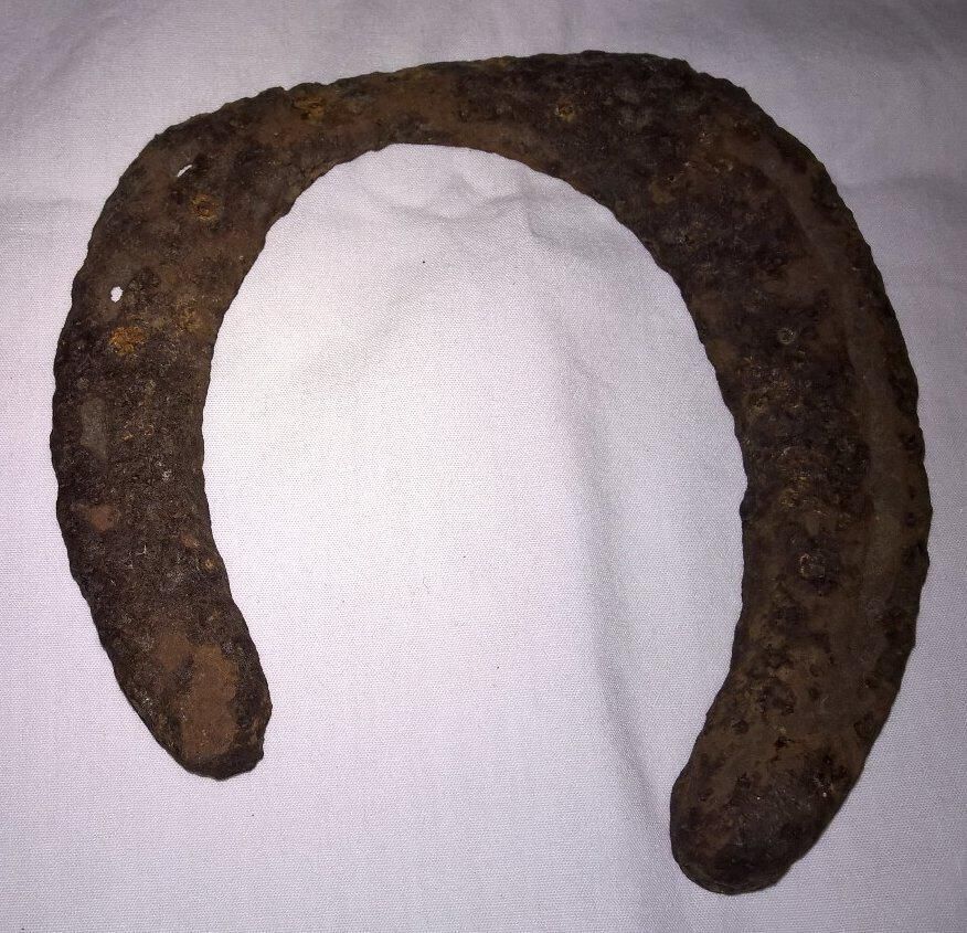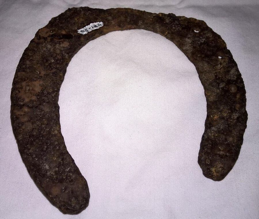 Small horseshoe that is completely covered with rust. One side is rounded and the other is flat. There are two holes visible for nails. It is thicker on the left side (when the flat side is up). There are grooves on each side and indentations where other nail holes were, but those holes are closed by the rusting process. The thicker side extends further toward the heel. The thicker (and longer) side has a projection at the tip that was probably a calk (for friction).Made/Created