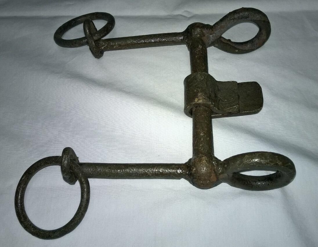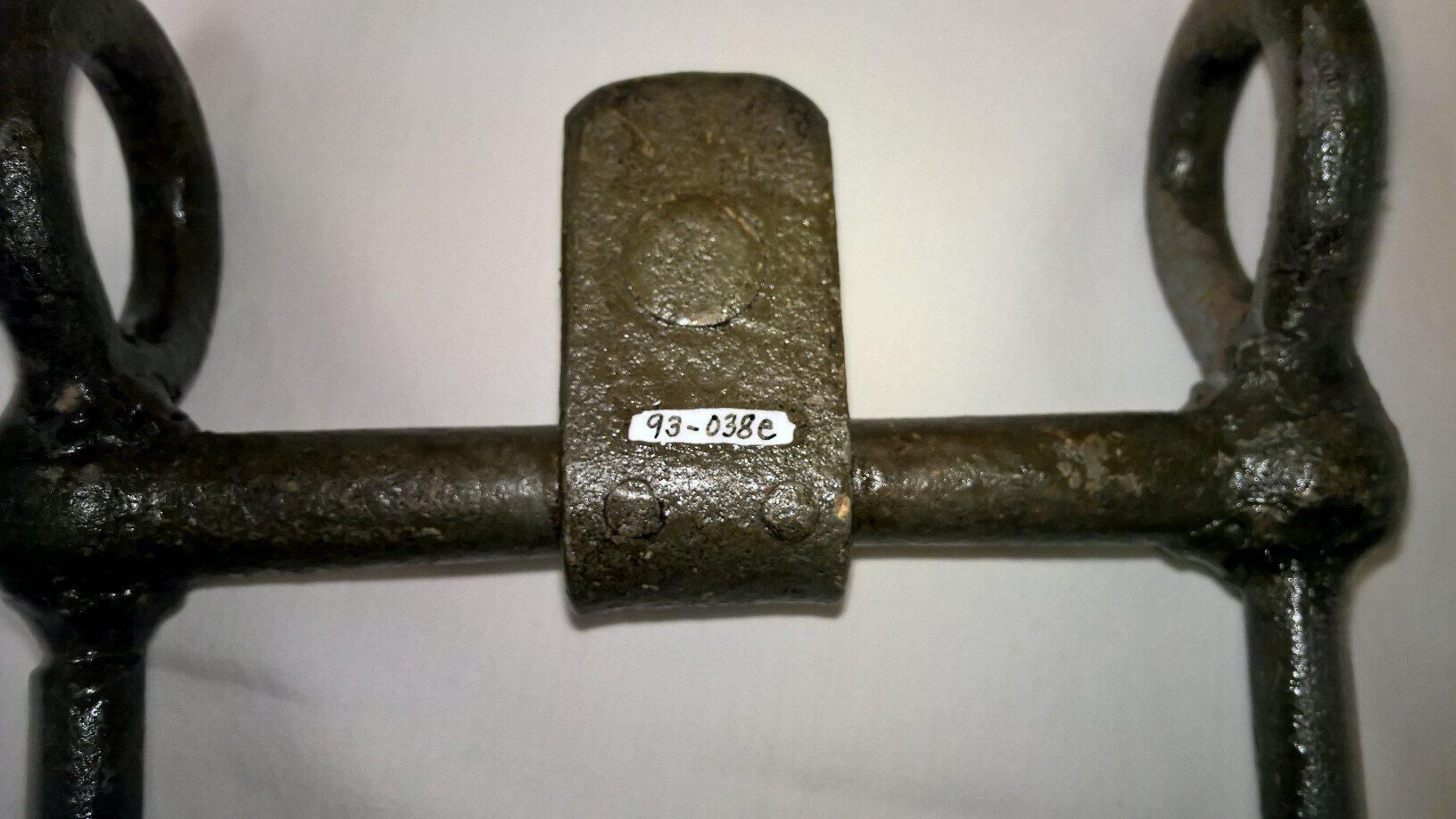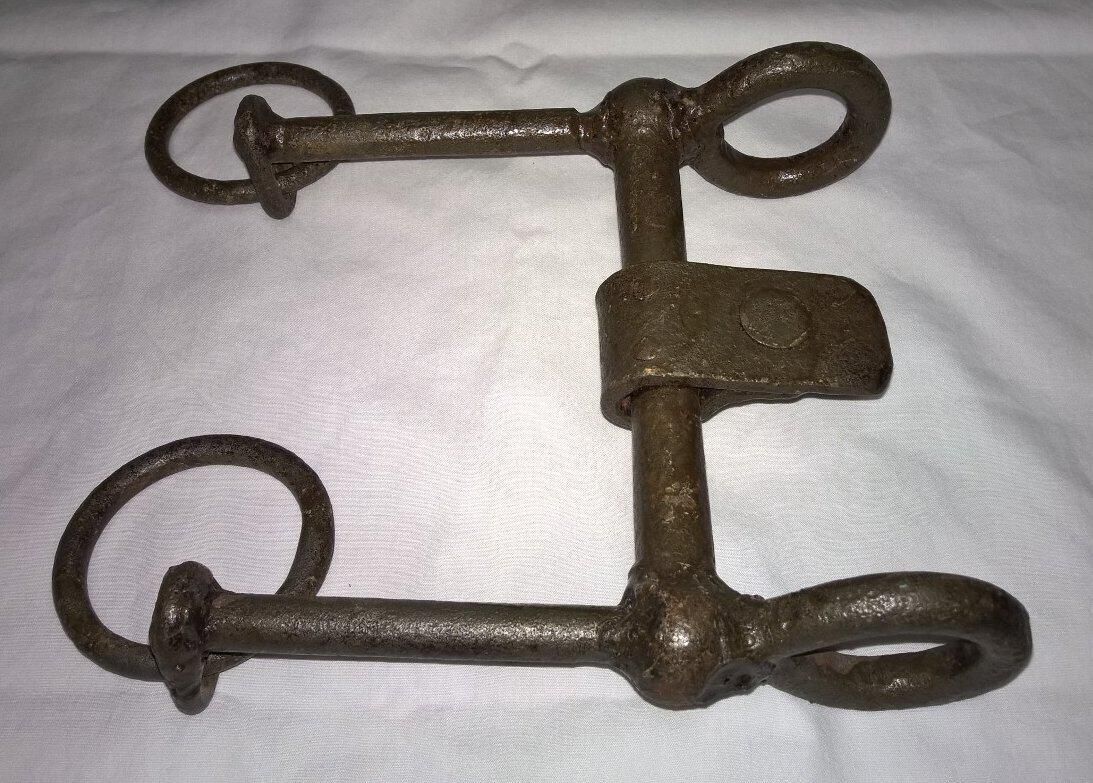 Non-jointed jaw breaker bit used together with a bridle to control a spirited large draft horse, possibly a "shank bit". A cross rod is welded onto two perpendicular side rods. There is a fixed ring at one end of each side rod, and loose rings attached at the other end of the side rods. There is a flat piece of metal wrapped around the cross rod and riveted.