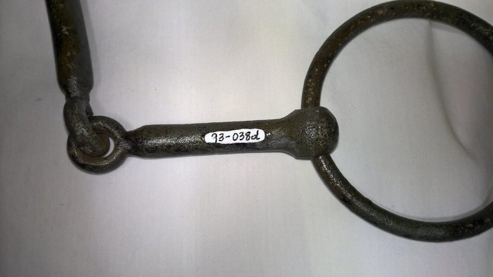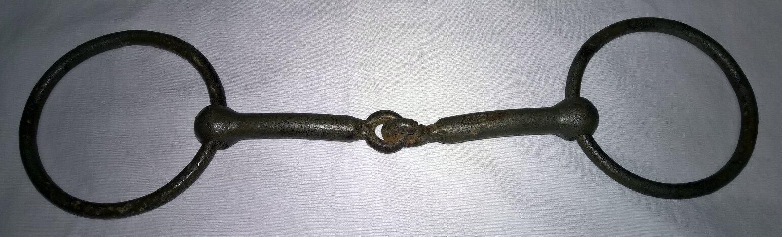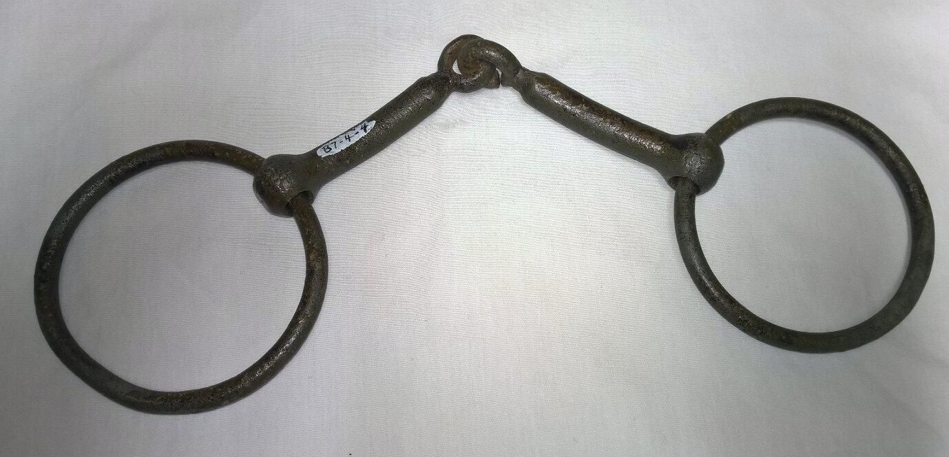 Single-jointed jawbreaker bit used together with a bridle to control spirited horses. There are two short rods, each having a small ring welded on one end and a hole bored through the ball-shaped other end. The small rings are linked together and large rings are loosely fitted through the holes. The large rings are available to attach to the bridle straps, and the small rings permit a swivel within the horse's mouth.